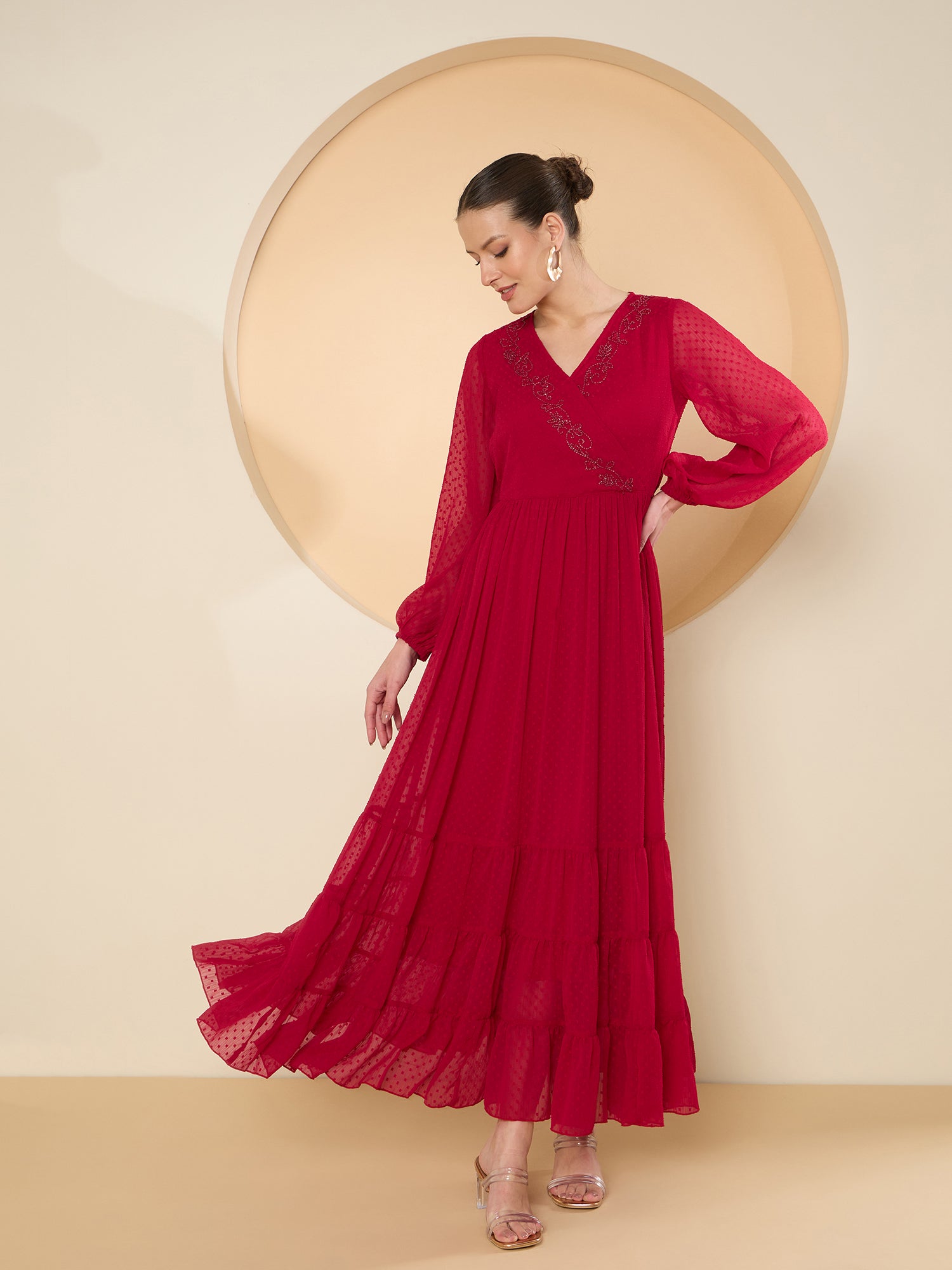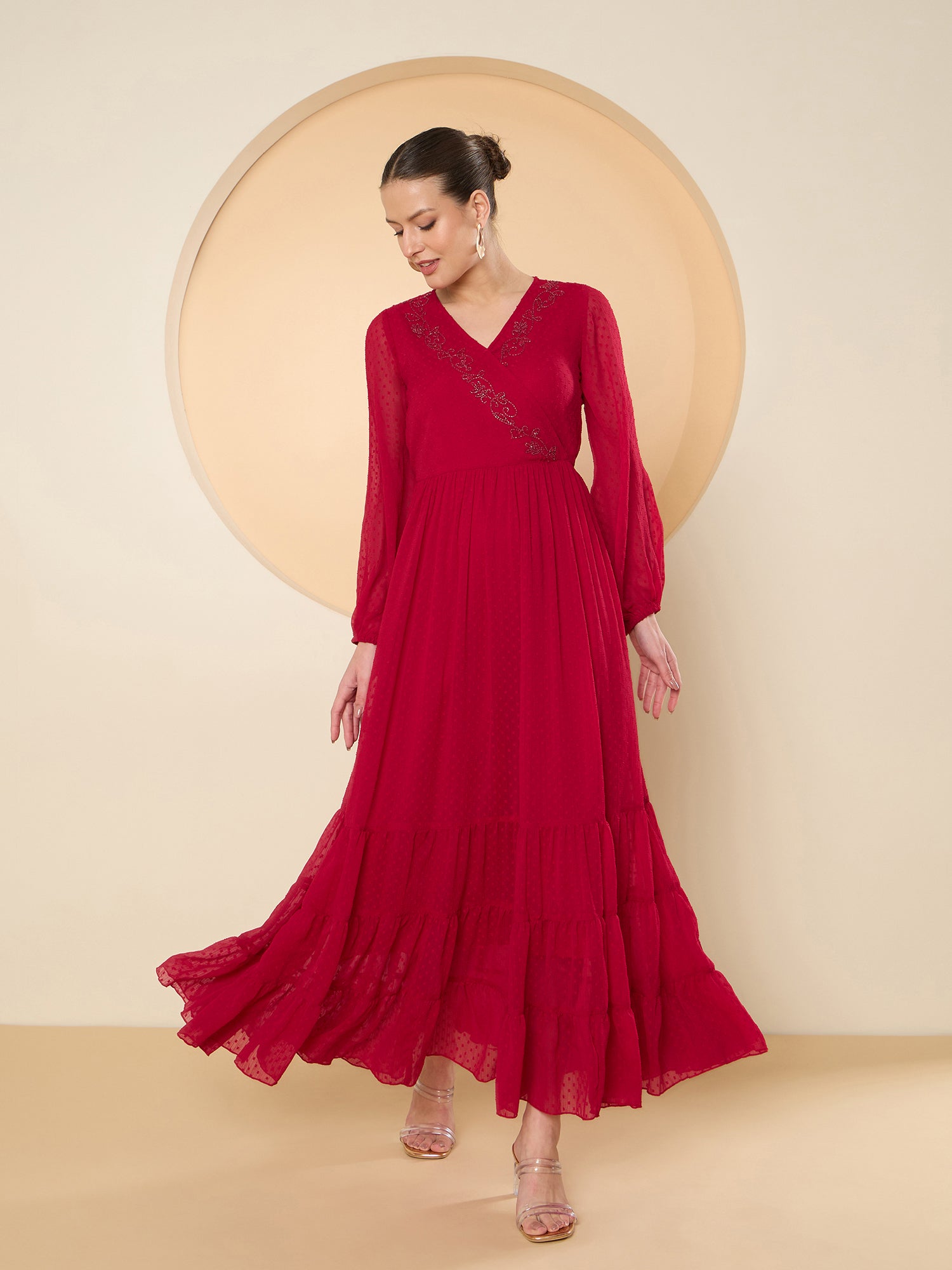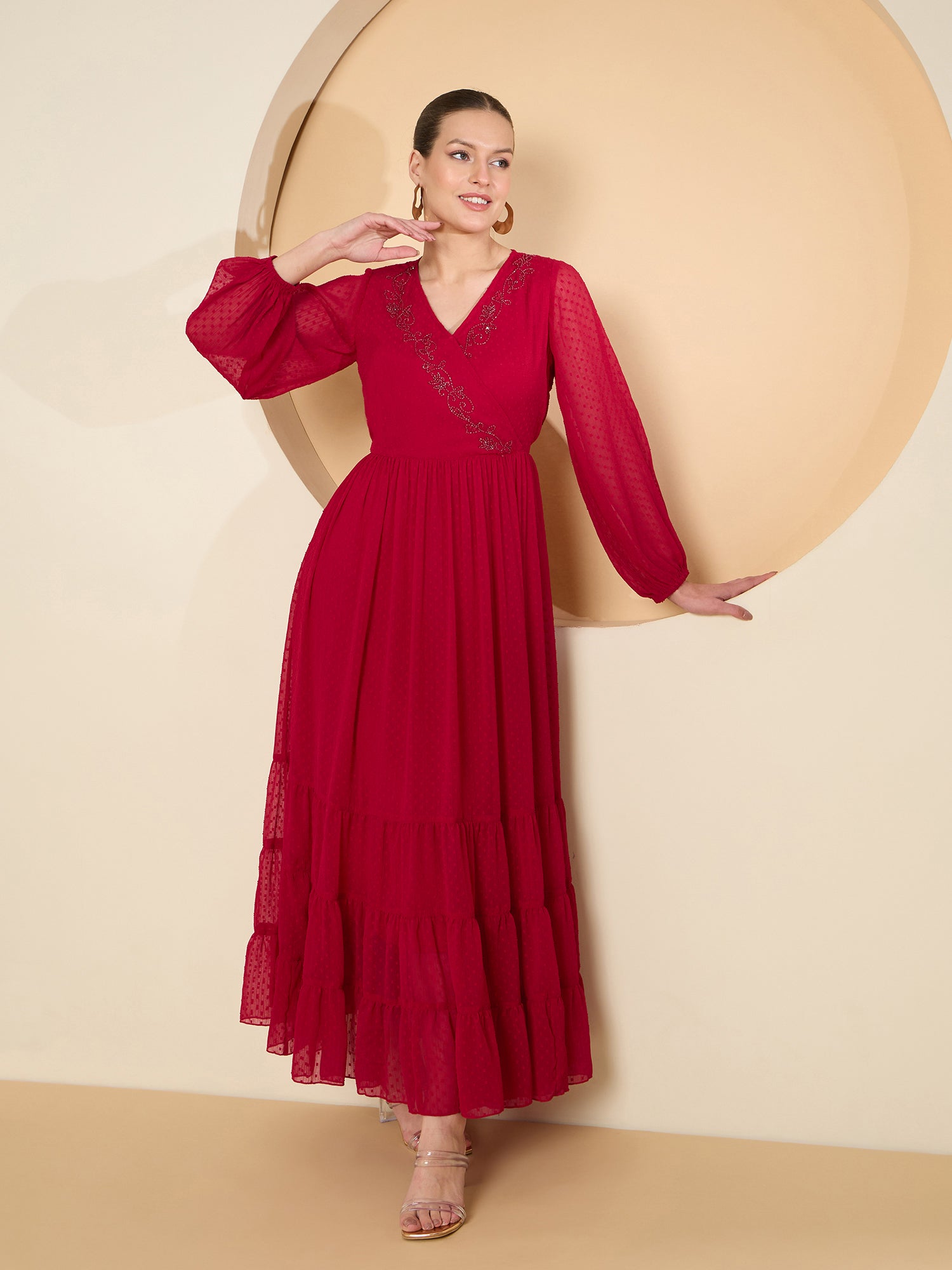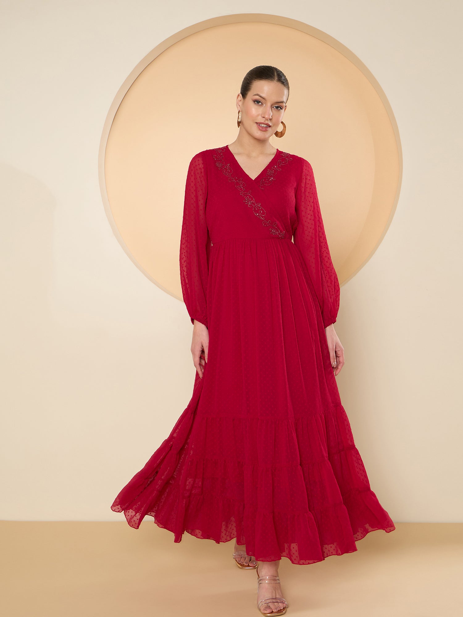 Antheaa Flared Sleeve Chiffon Embellished Maxi Dress