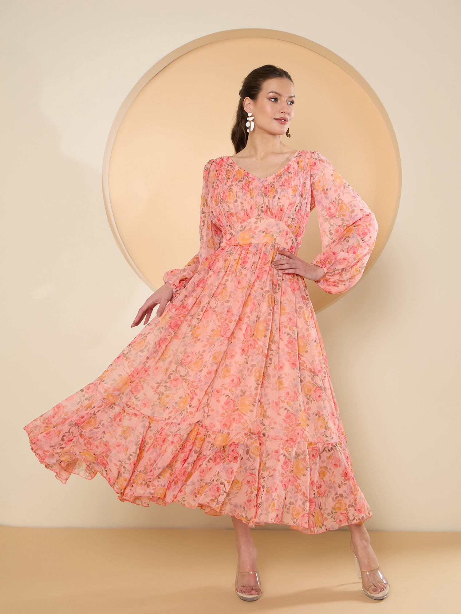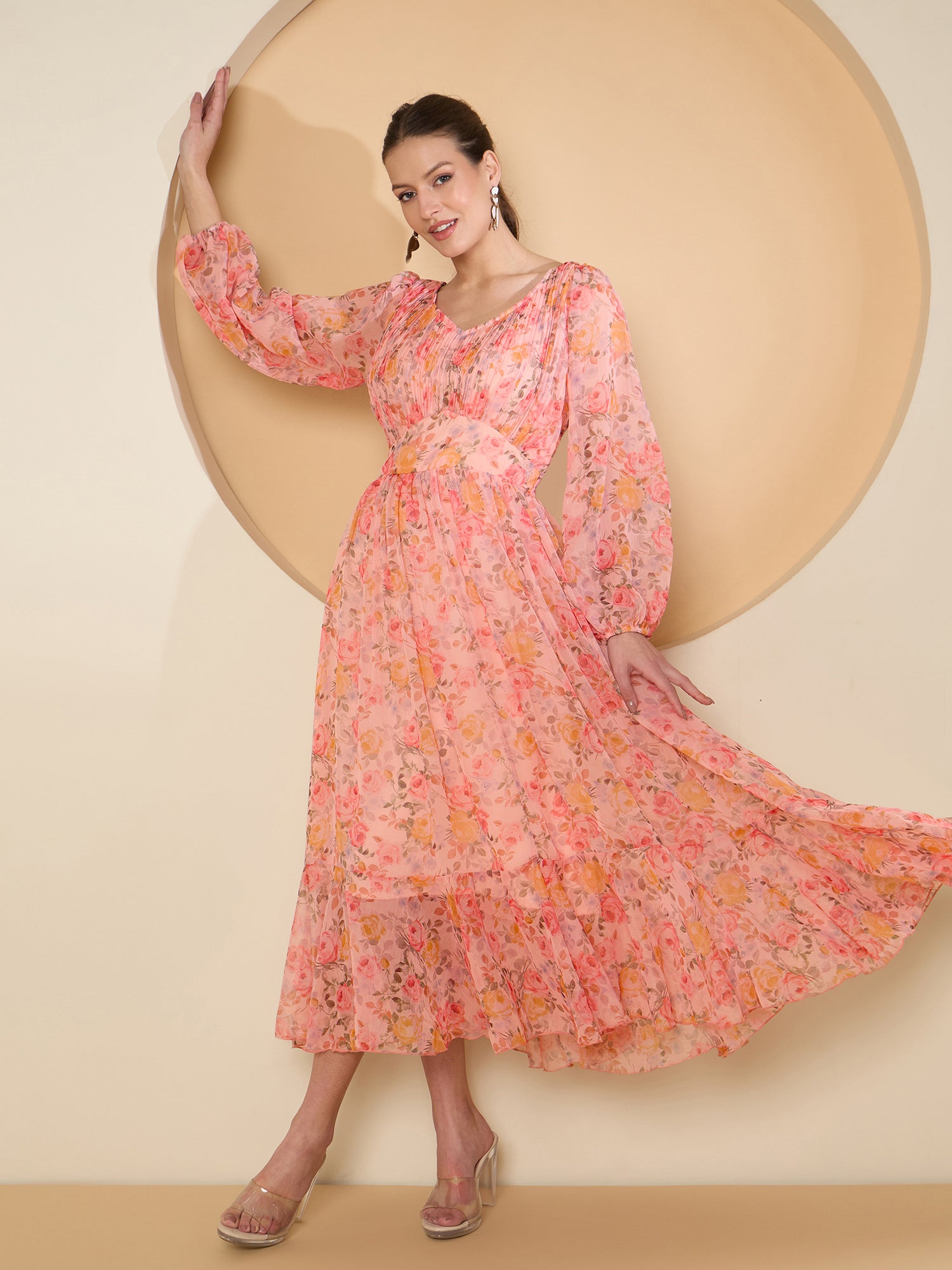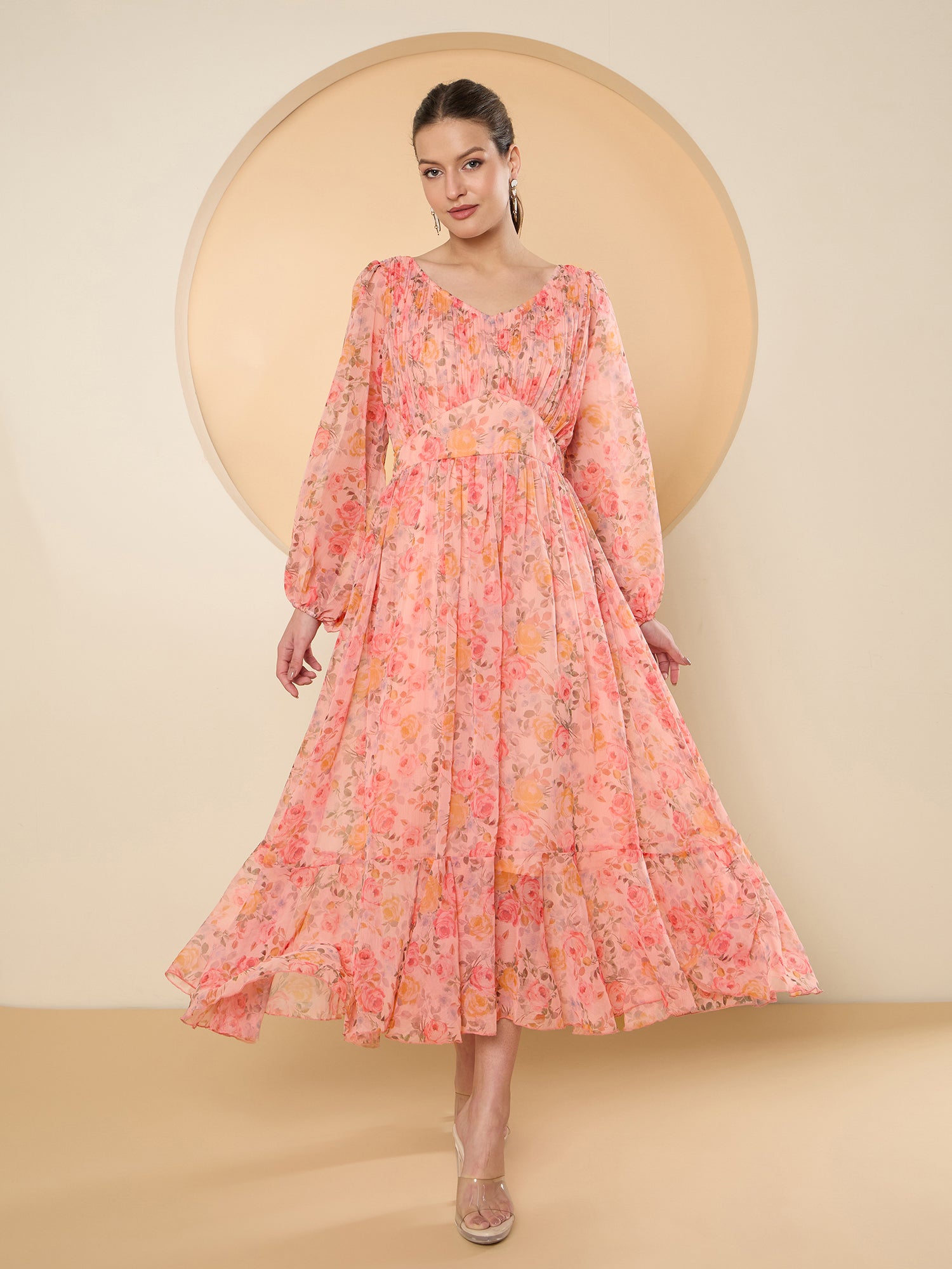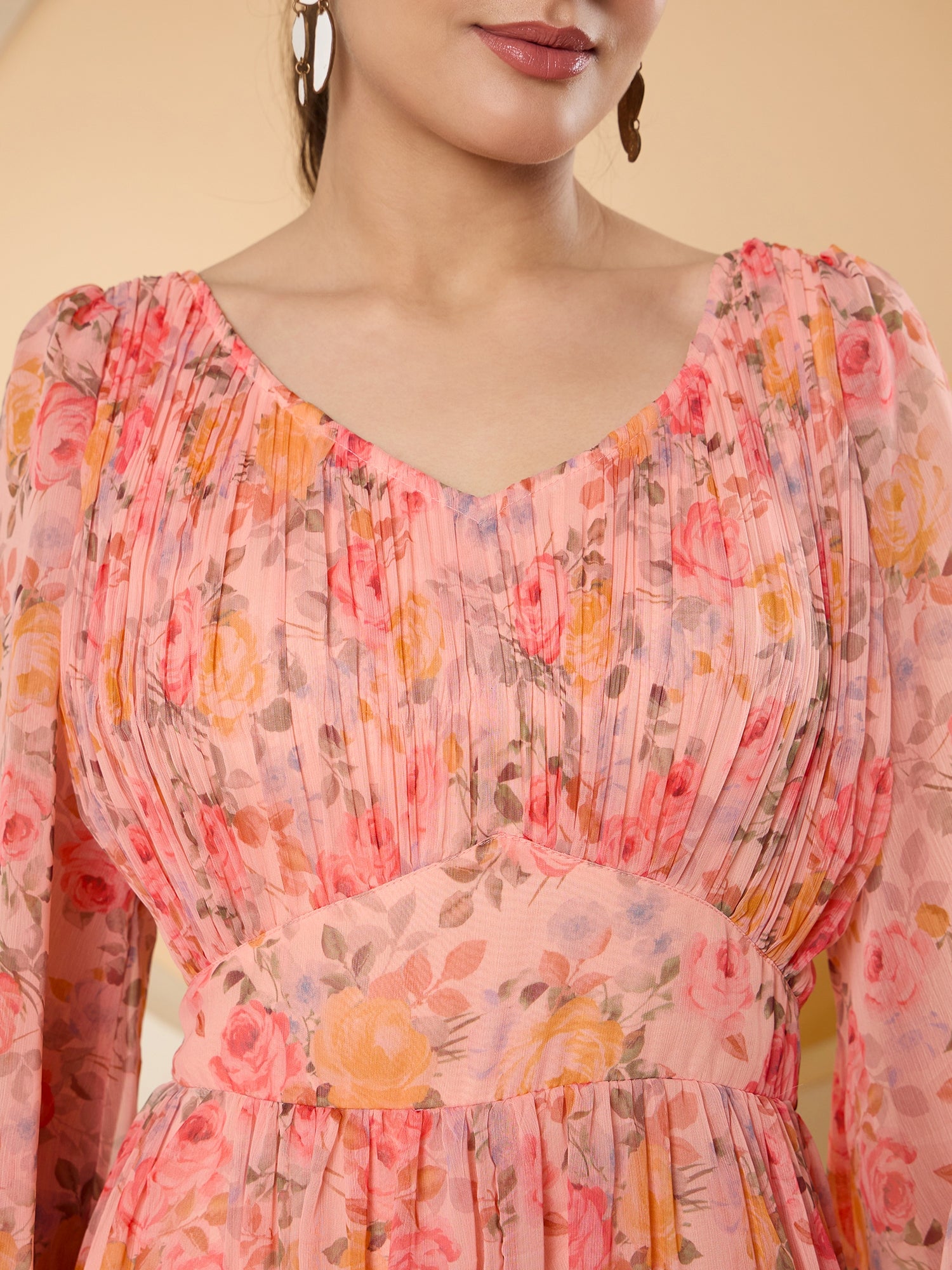 - Peach-coloured floral print fit & flare dress