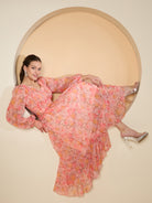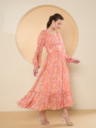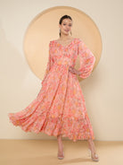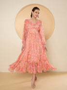 Antheaa Floral Print Bell Sleeve Chiffon Fit & Flare Midi Dress