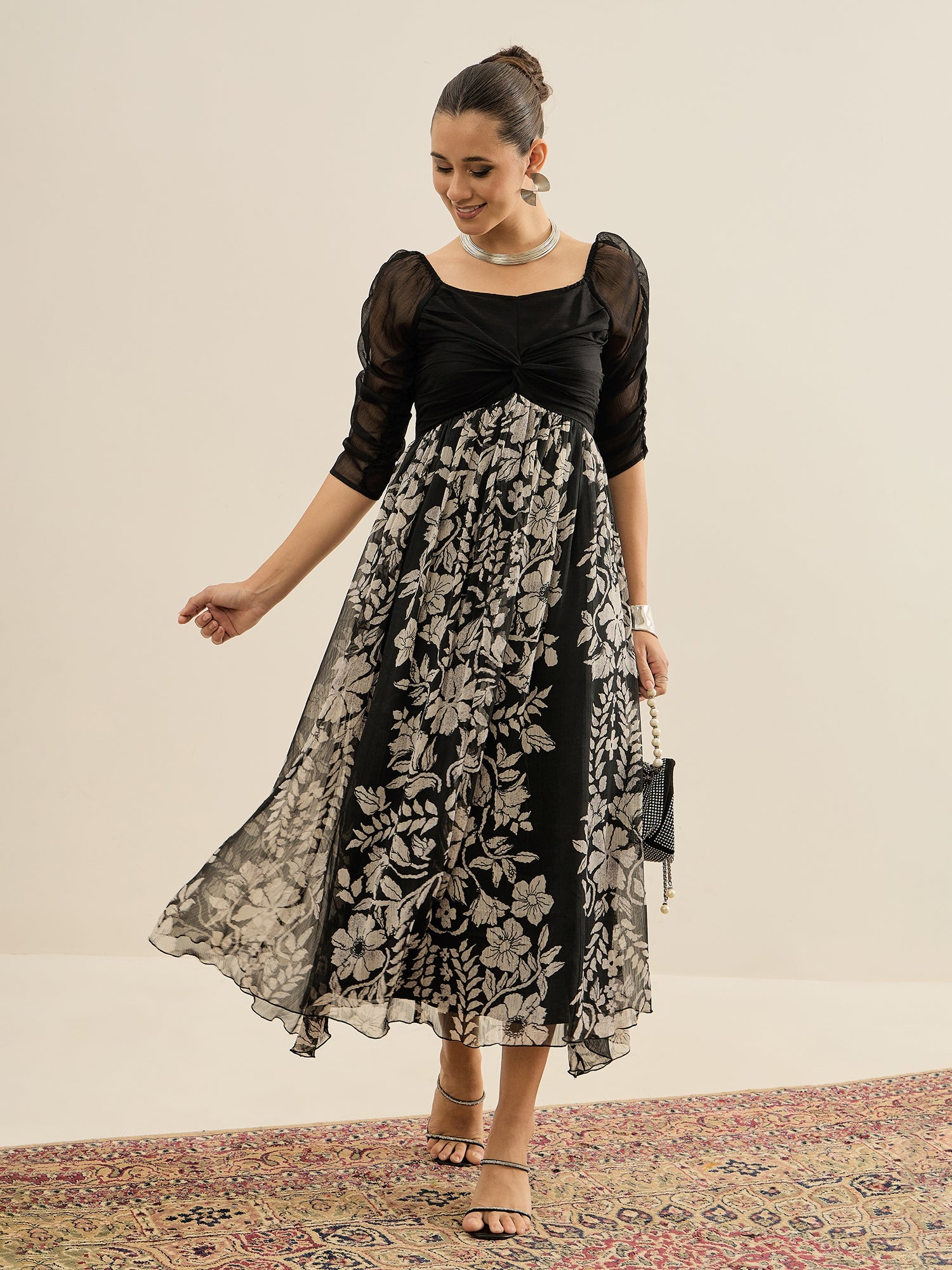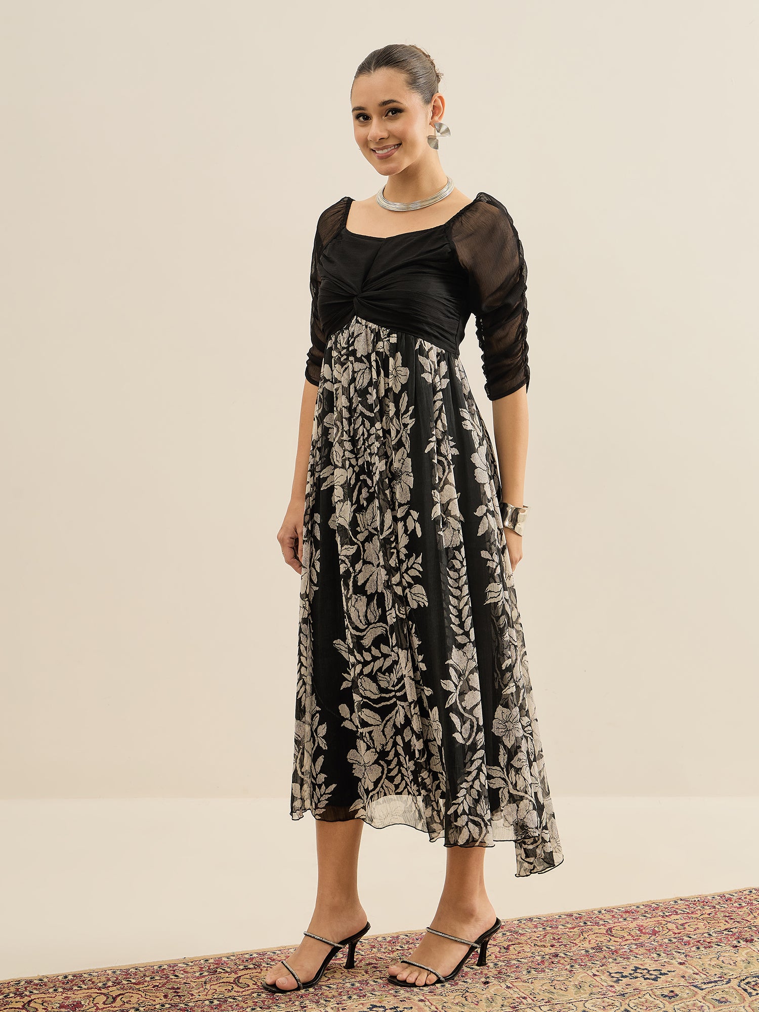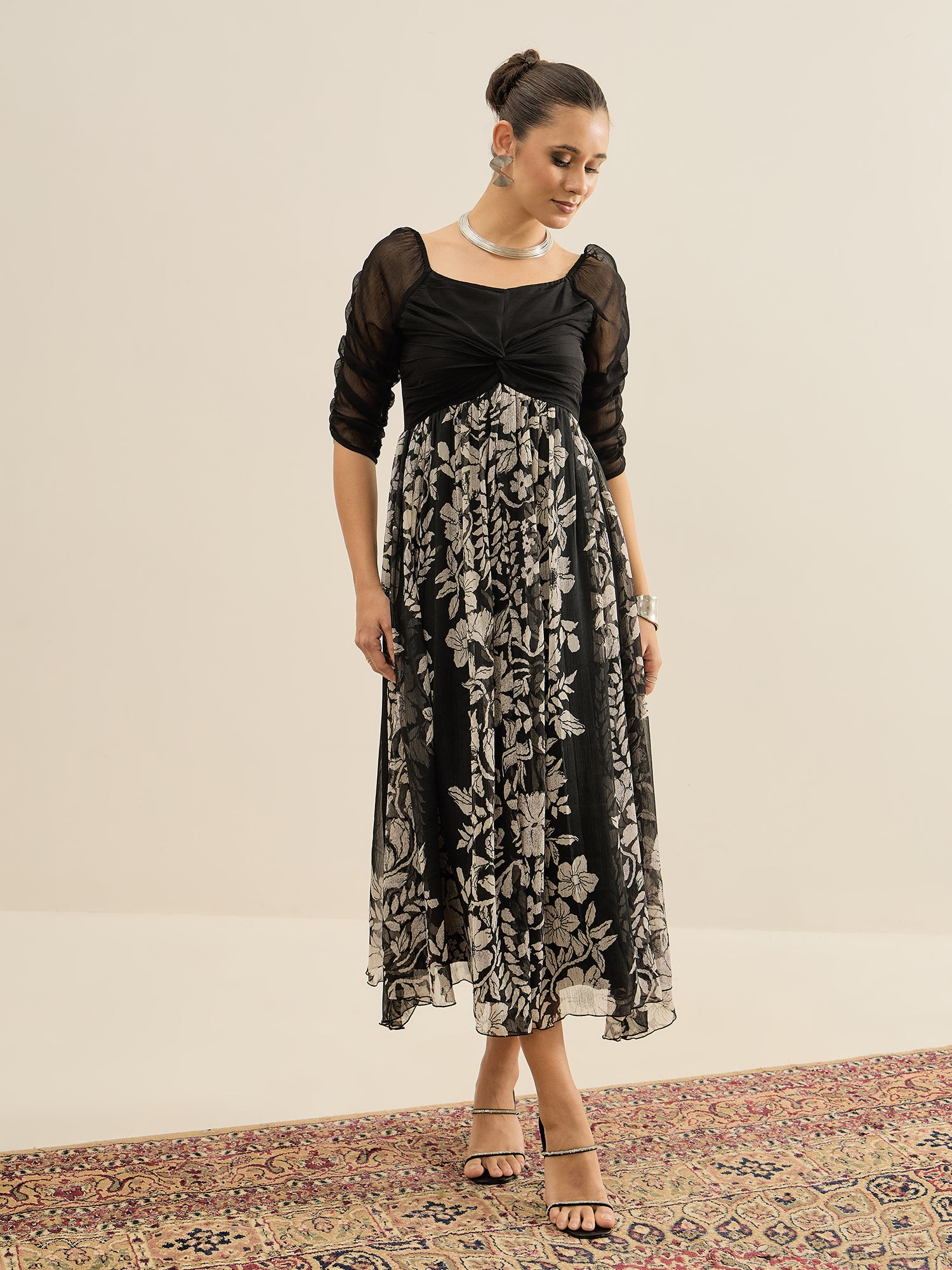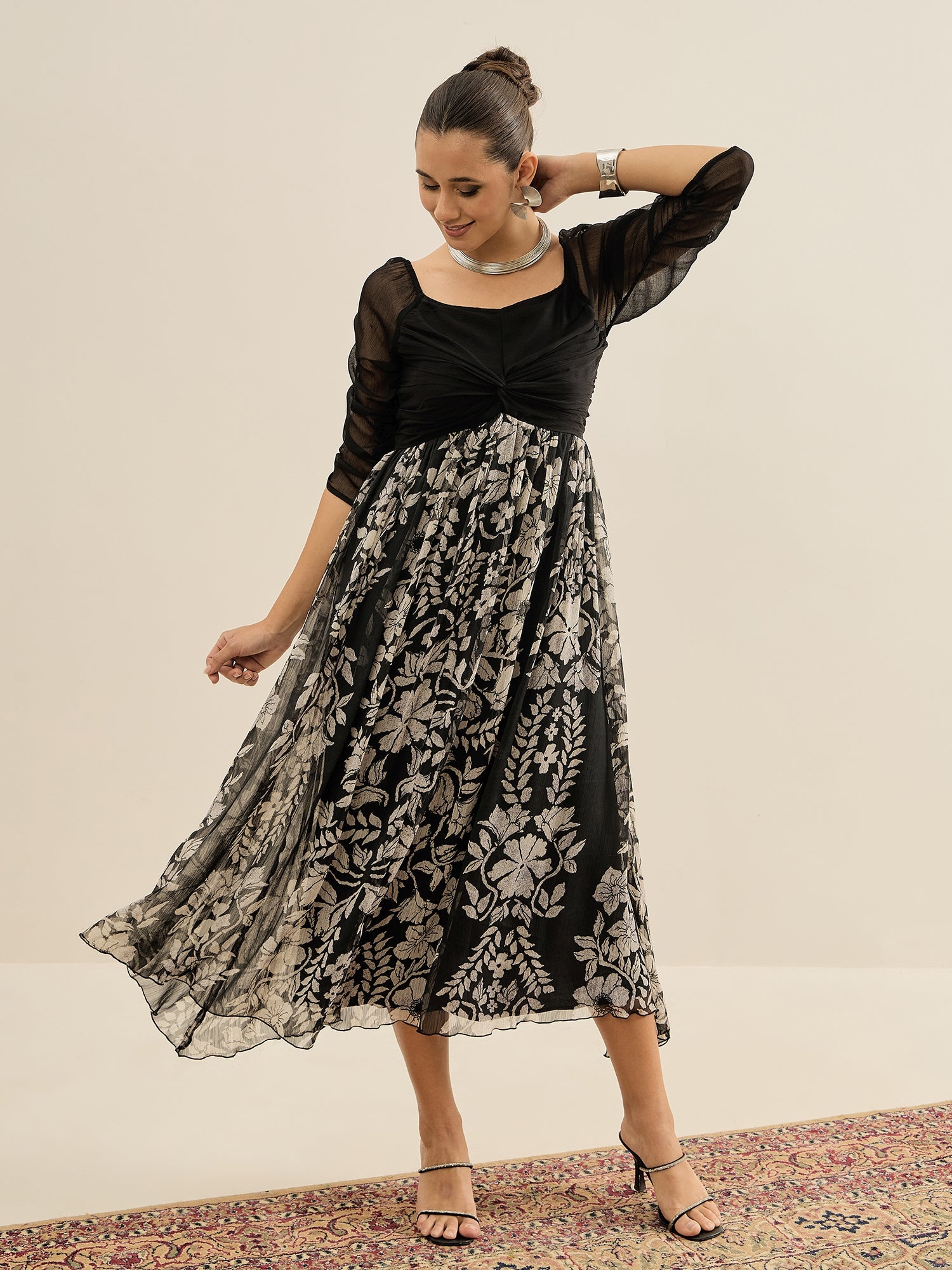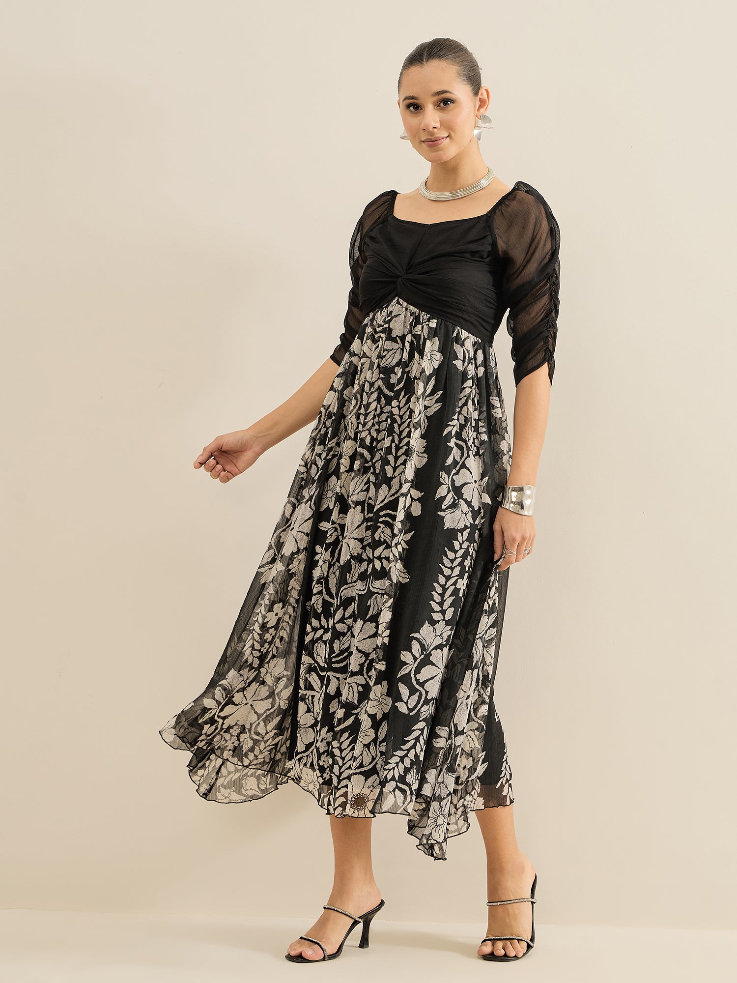 Antheaa Floral Print Chiffon Fit & Flare Midi Dress