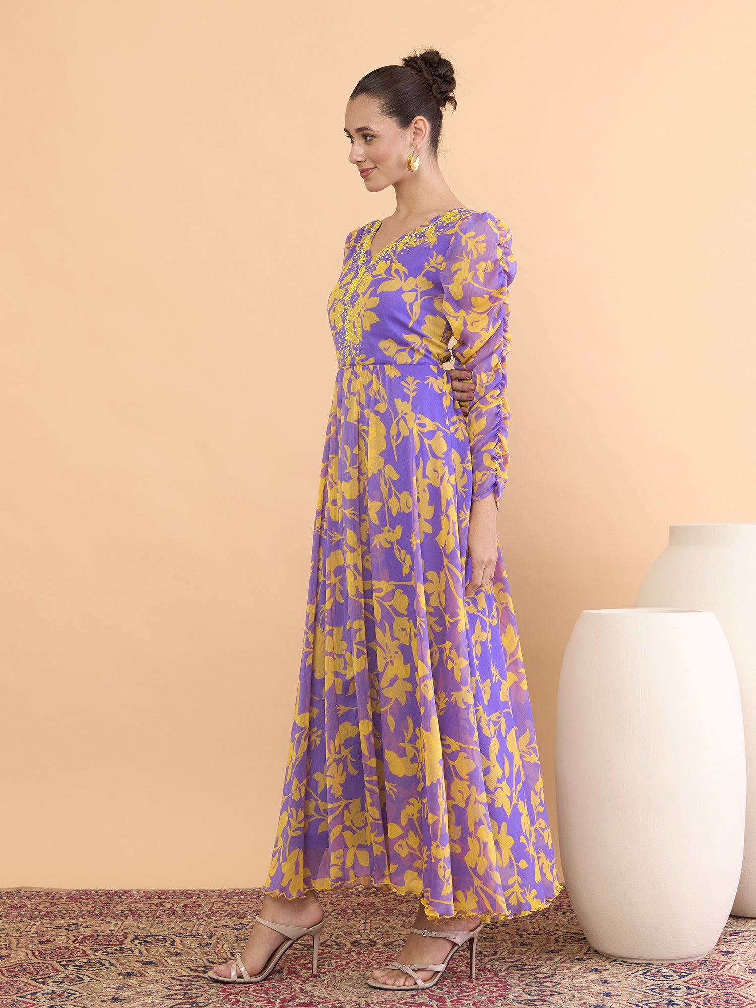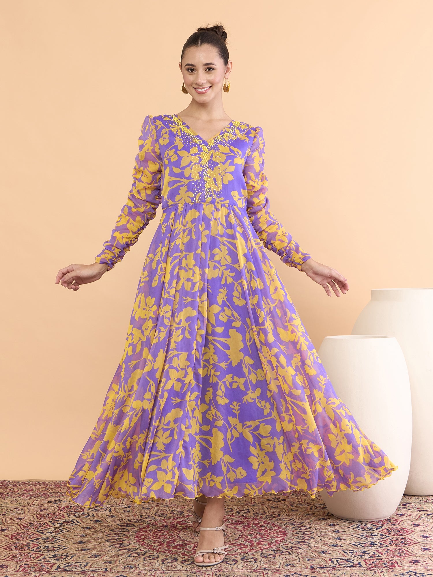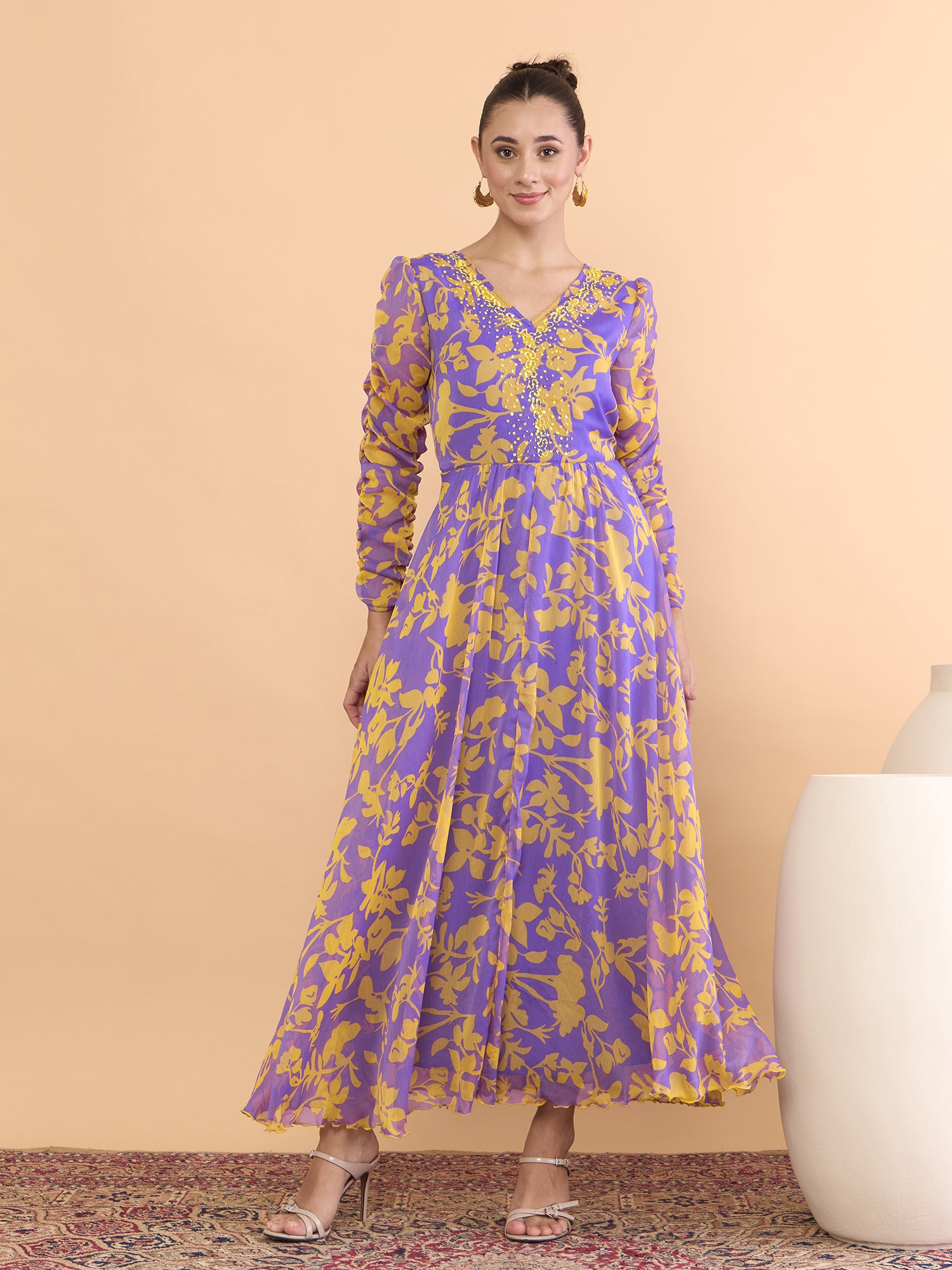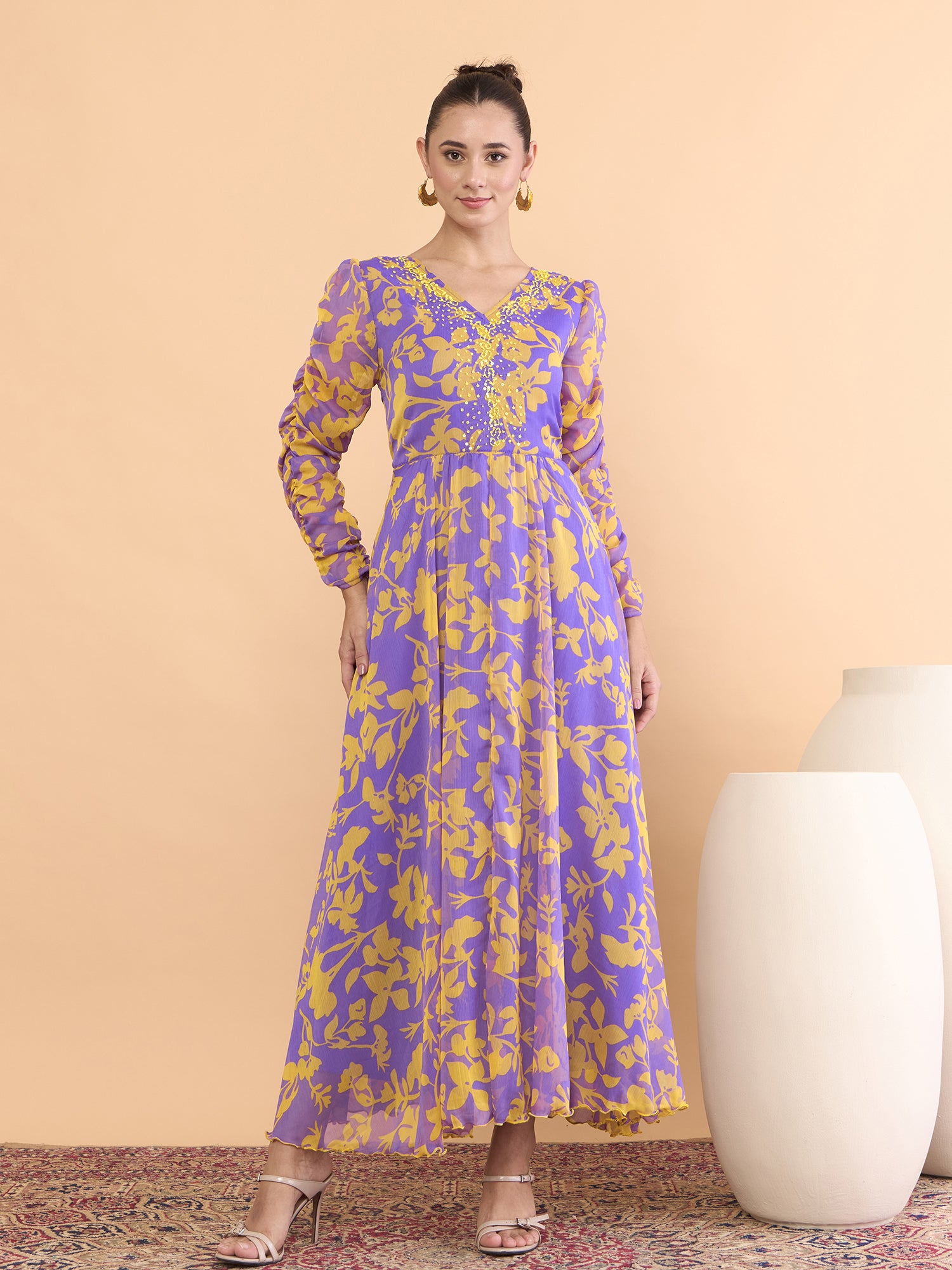 - Purple and Yellow floral Embellished Fit & Flare dress