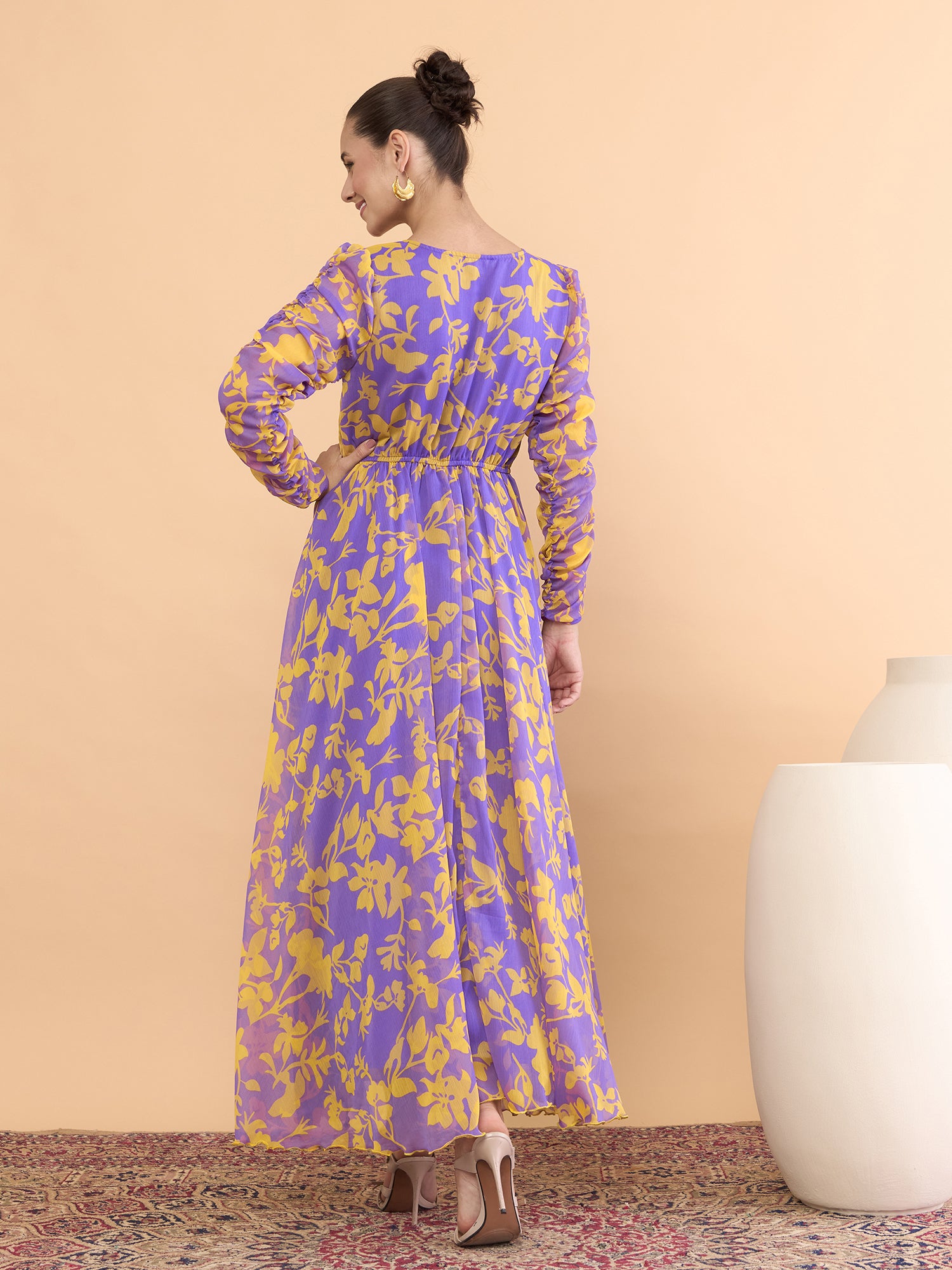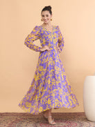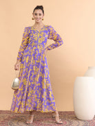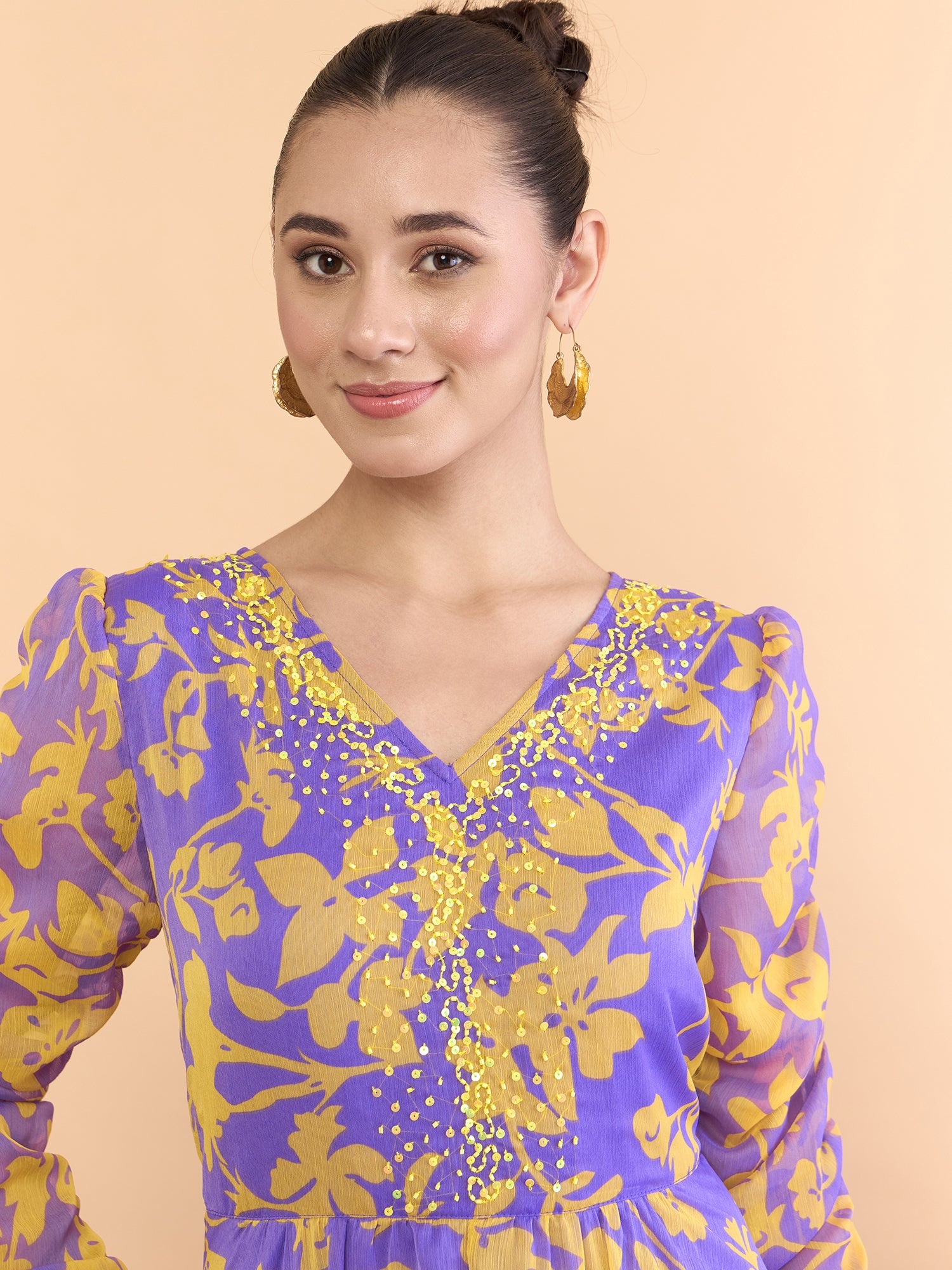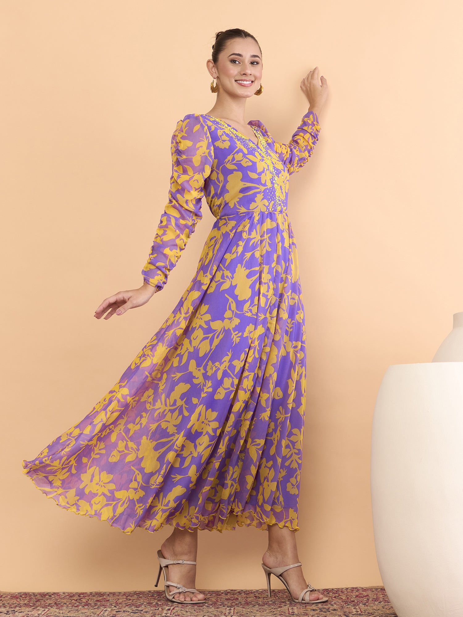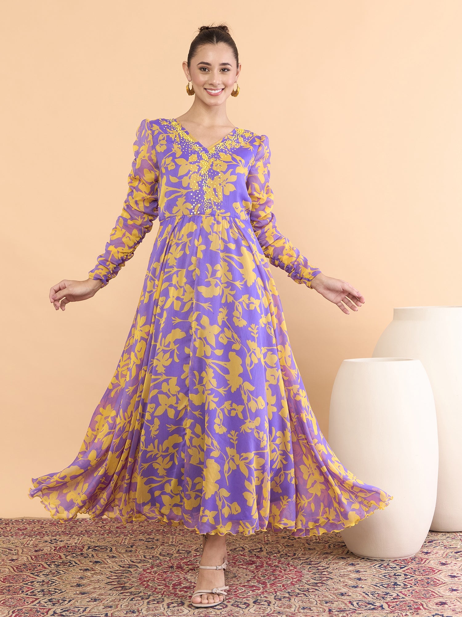 - Purple and Yellow floral Embellished Fit & Flare dress