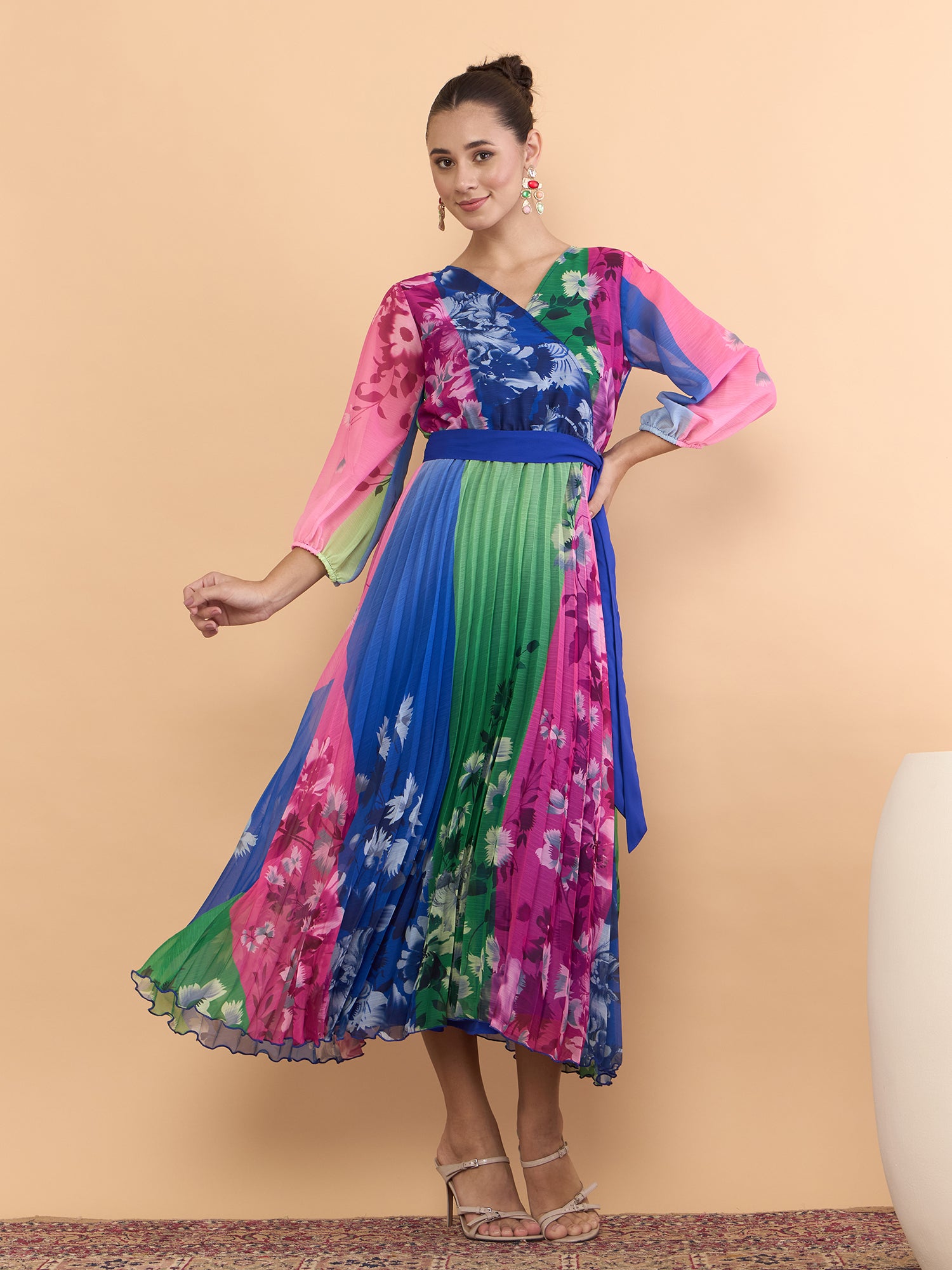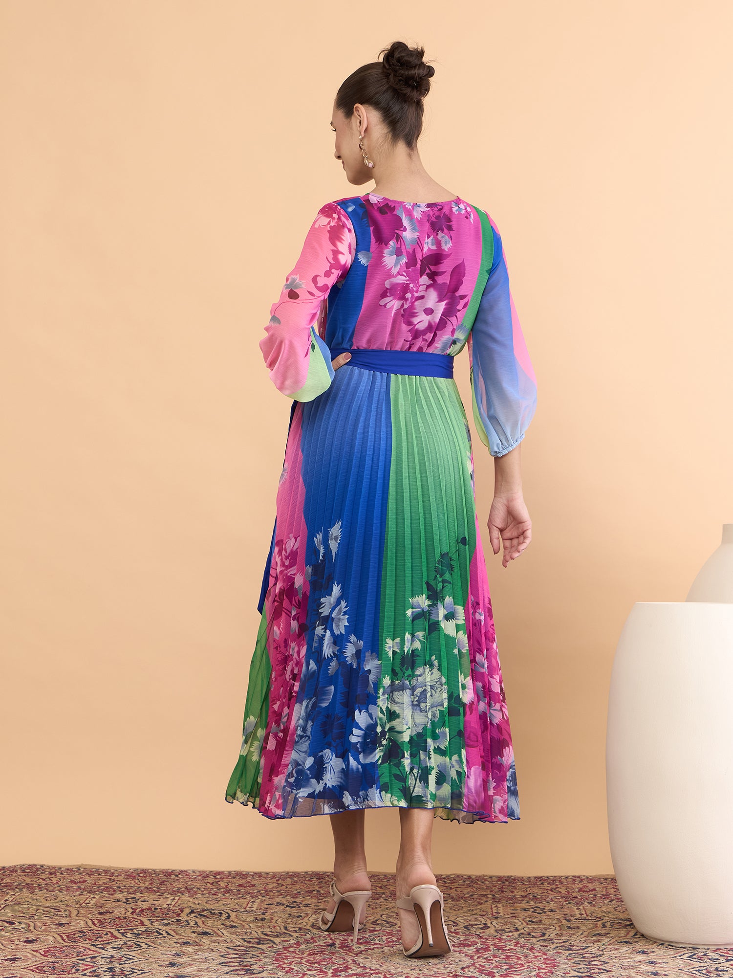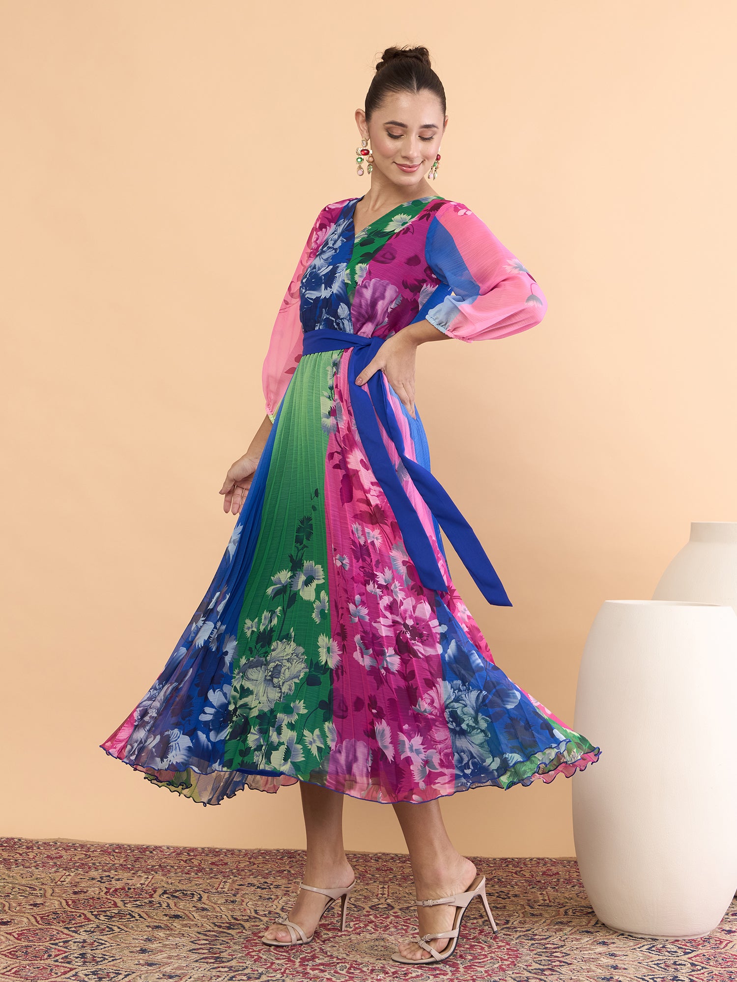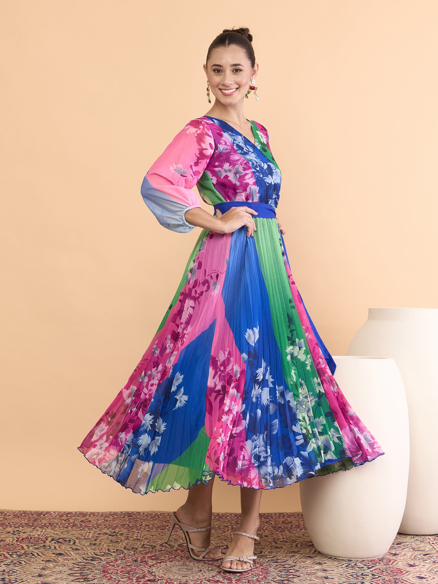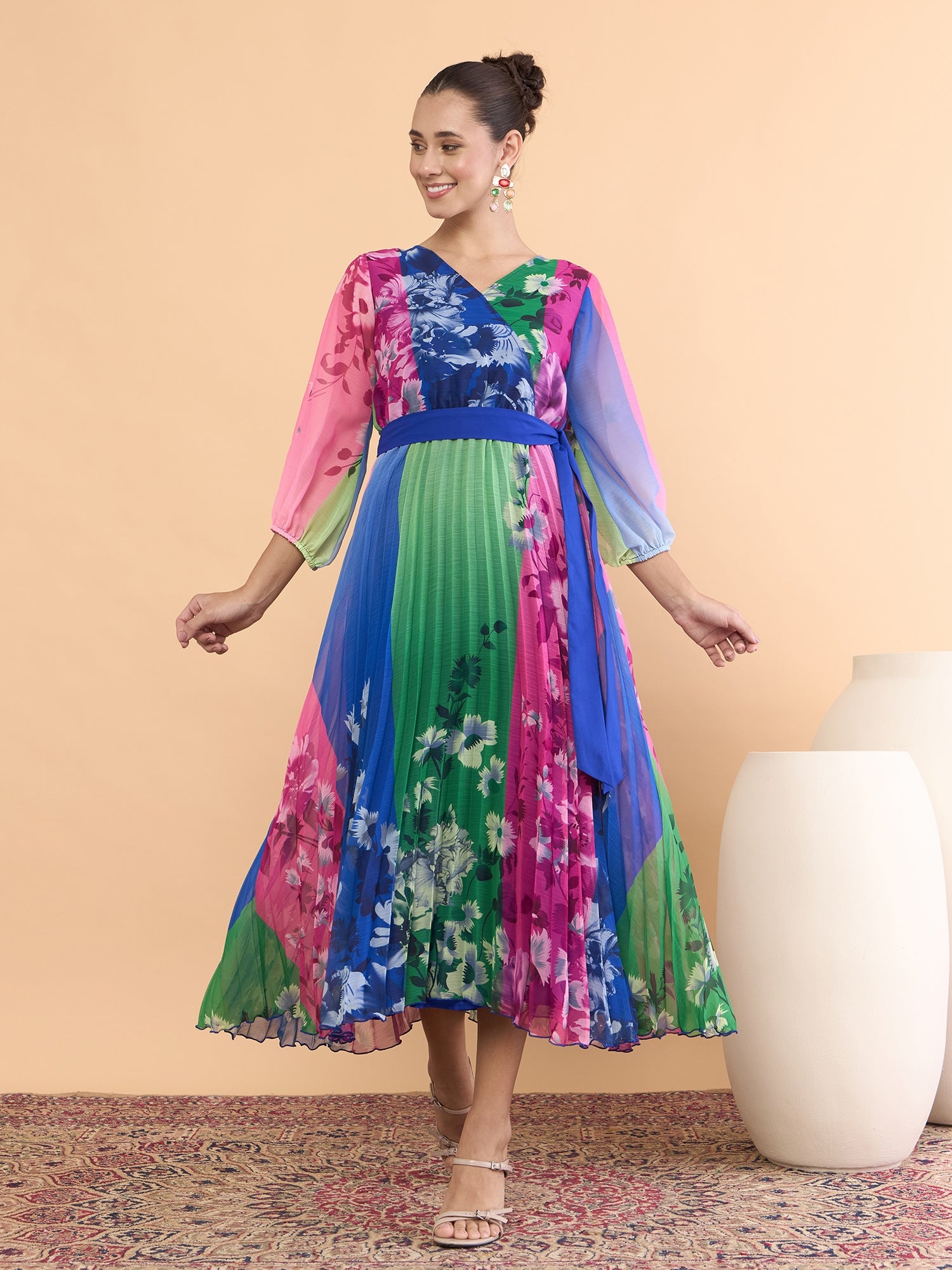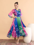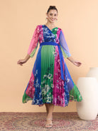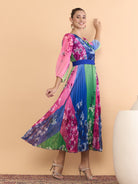 Antheaa Floral Printed V-Neck Fit and Flare Midi Dress