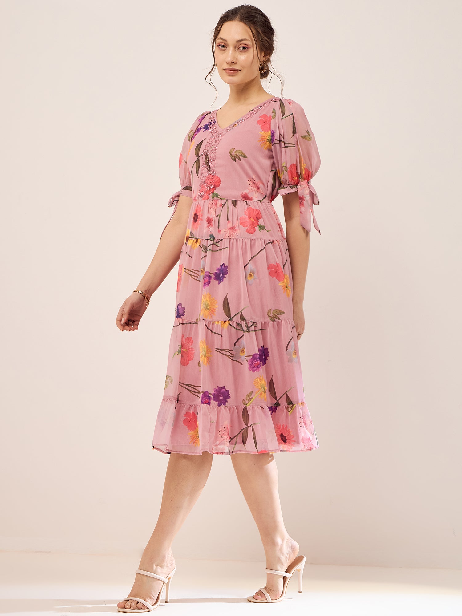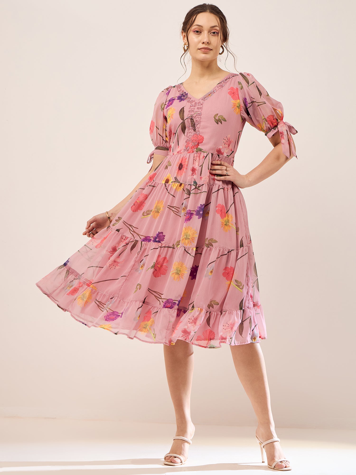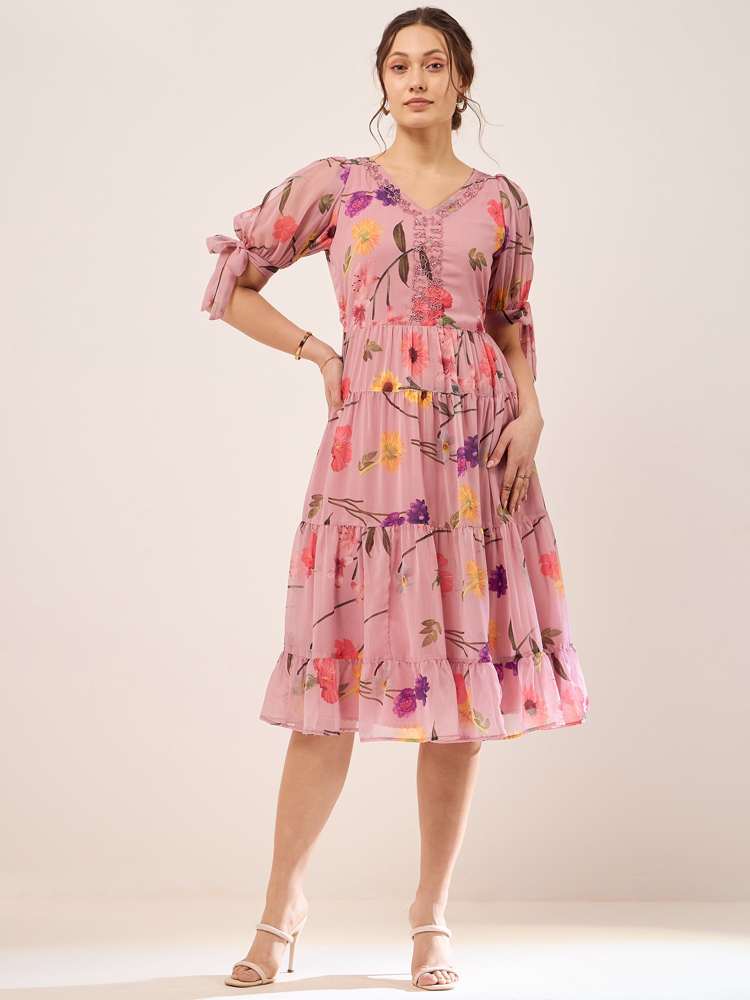 Antheaa Floral Printed V-Neck Puff Sleeves Beads Detail Chiffon Fit & Flare Dress