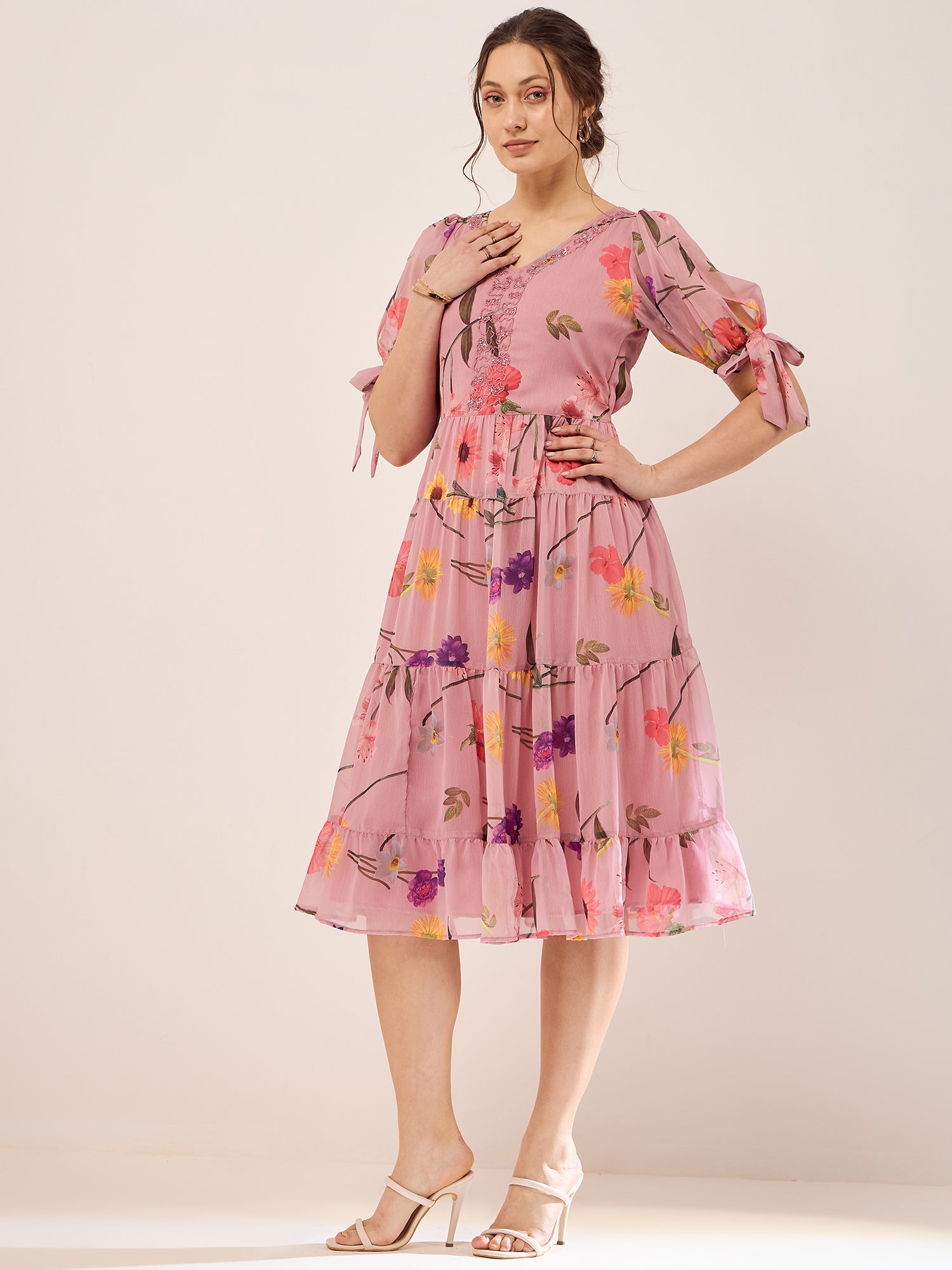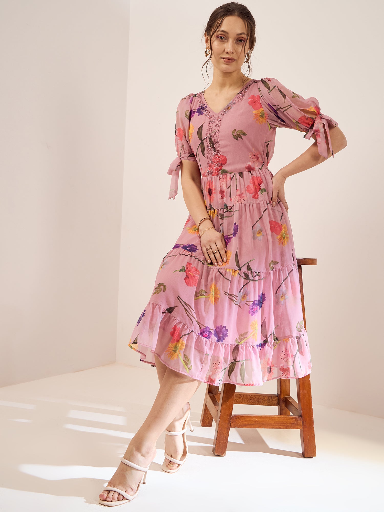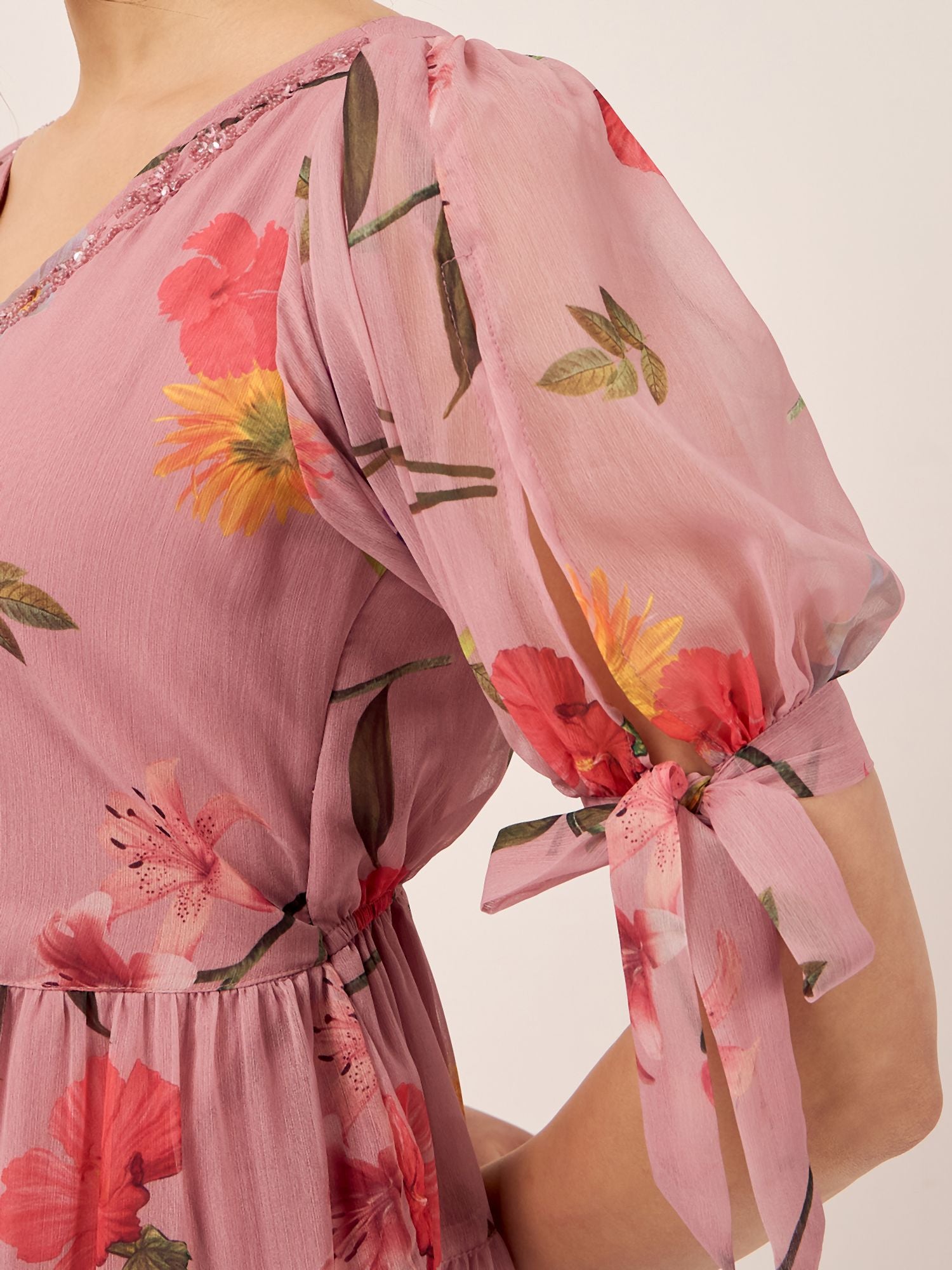 Antheaa Floral Printed V-Neck Puff Sleeves Beads Detail Chiffon Fit & Flare Dress