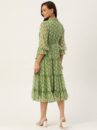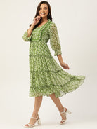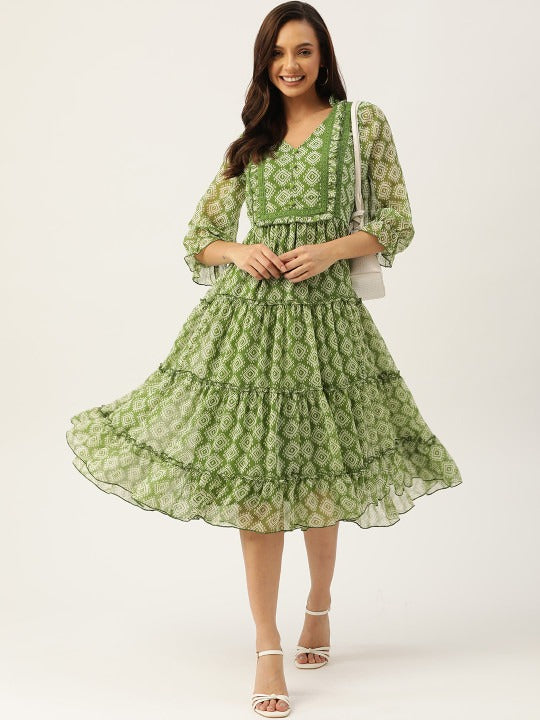 Antheaa Green & Pink Chiffon Geometric Print Tiered Dress