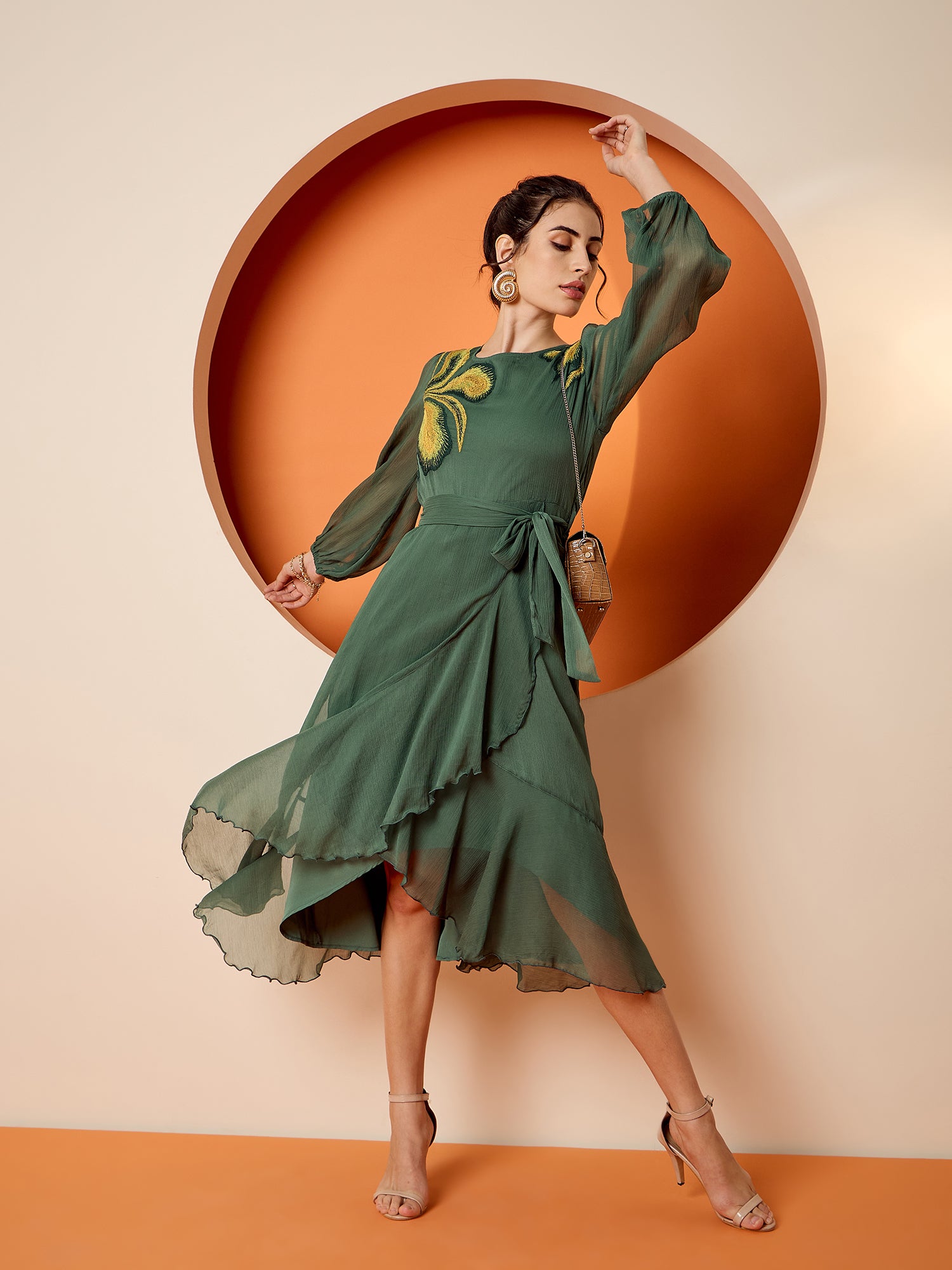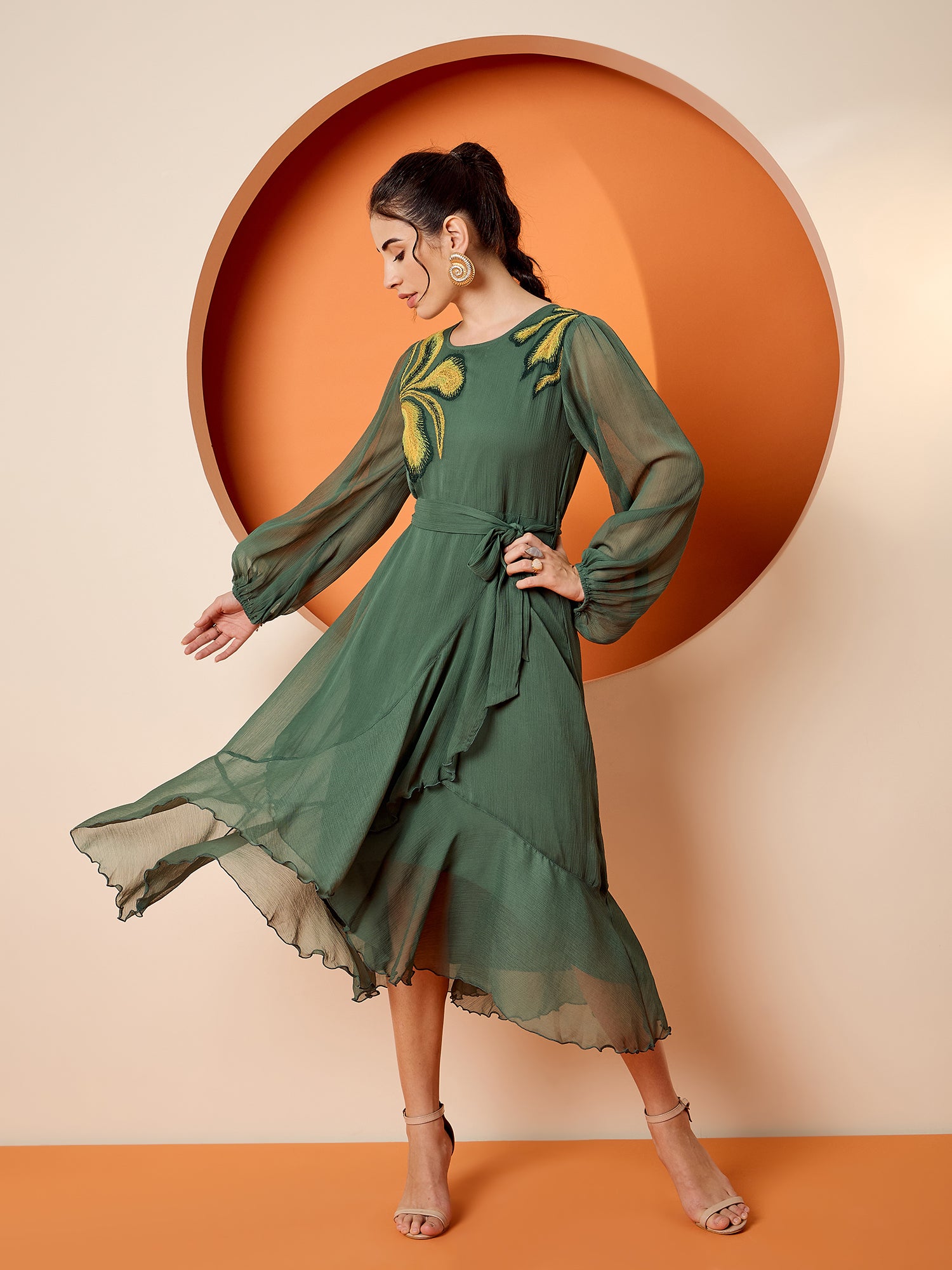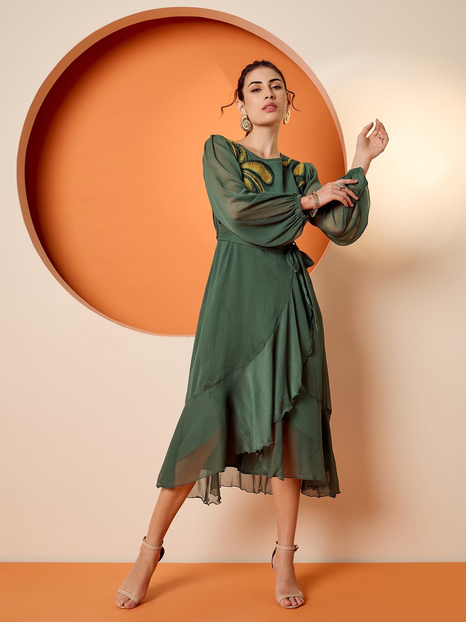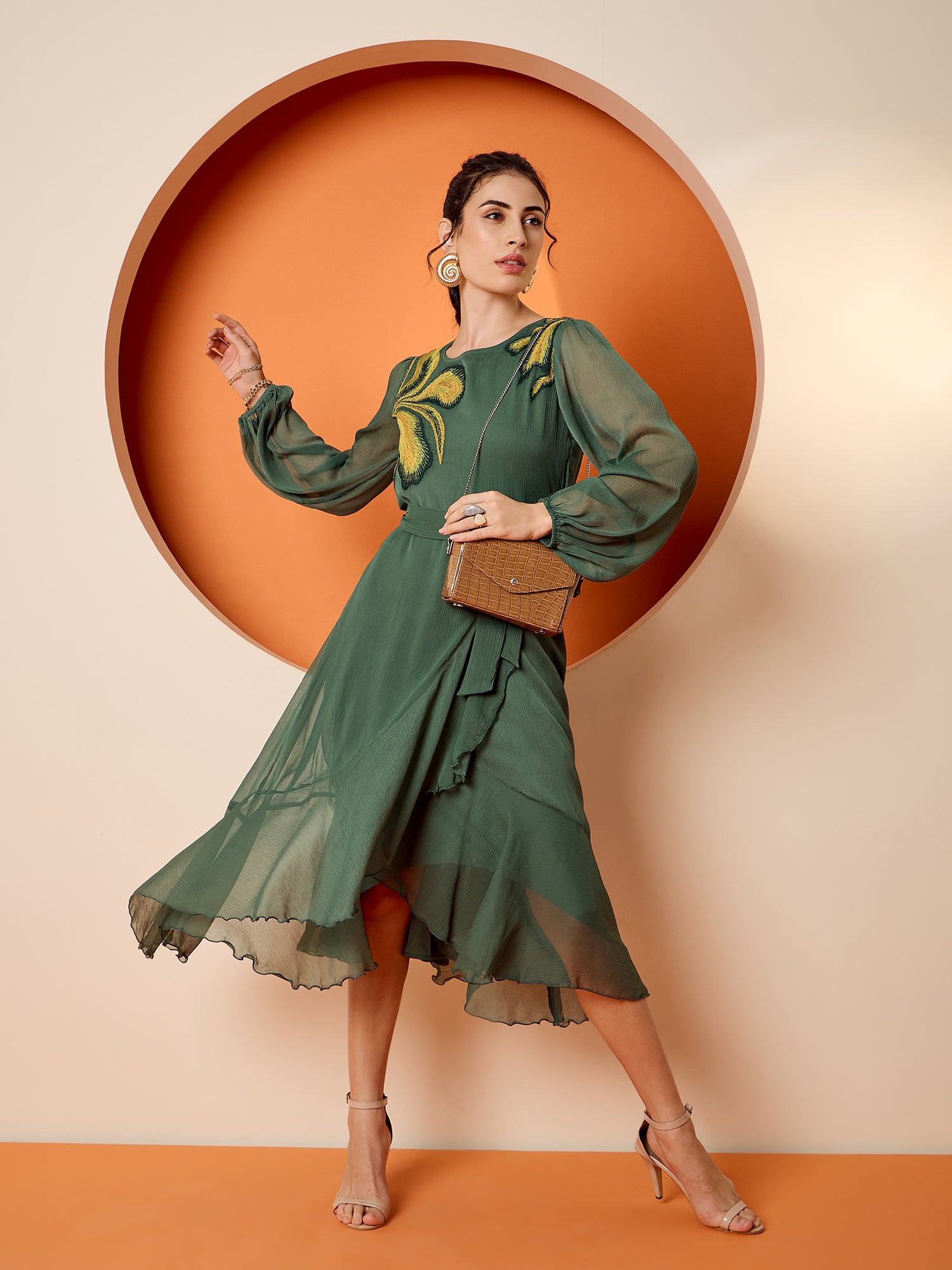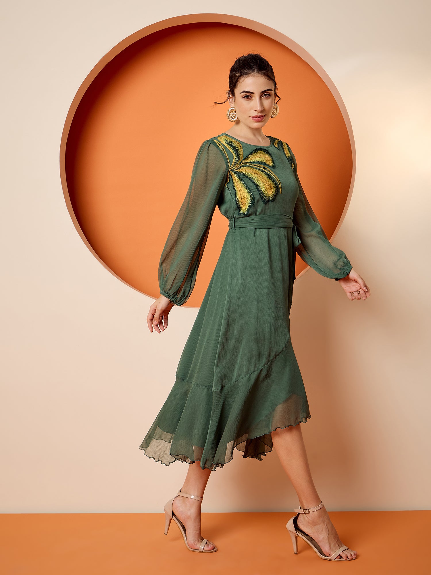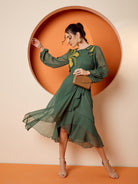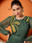 Antheaa Puff Sleeve Chiffon Embroidered A-Line Midi Dress
