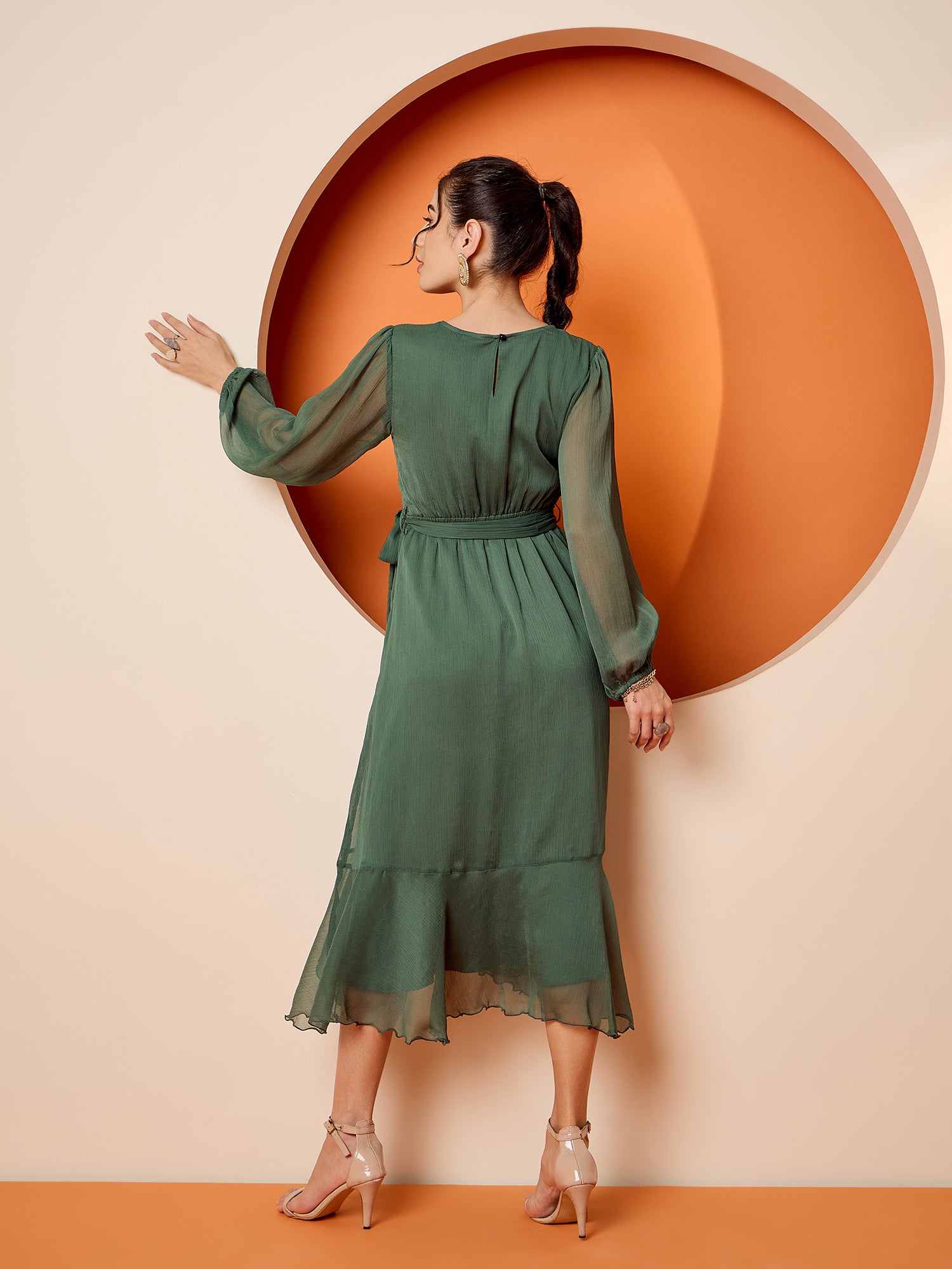 • Green solid A-line dress