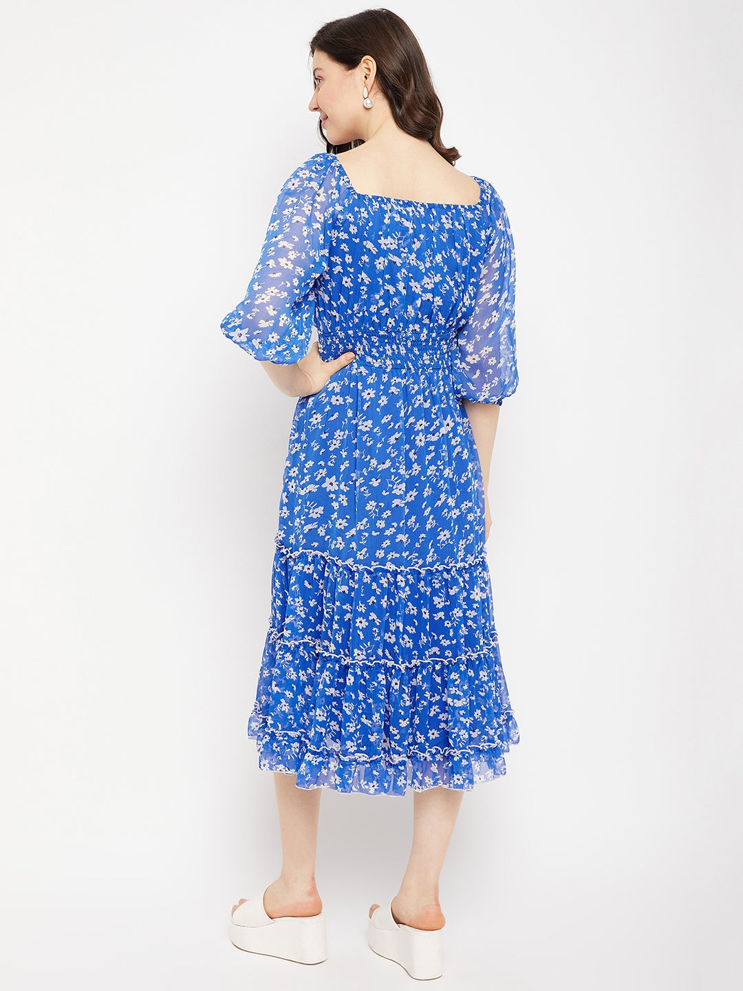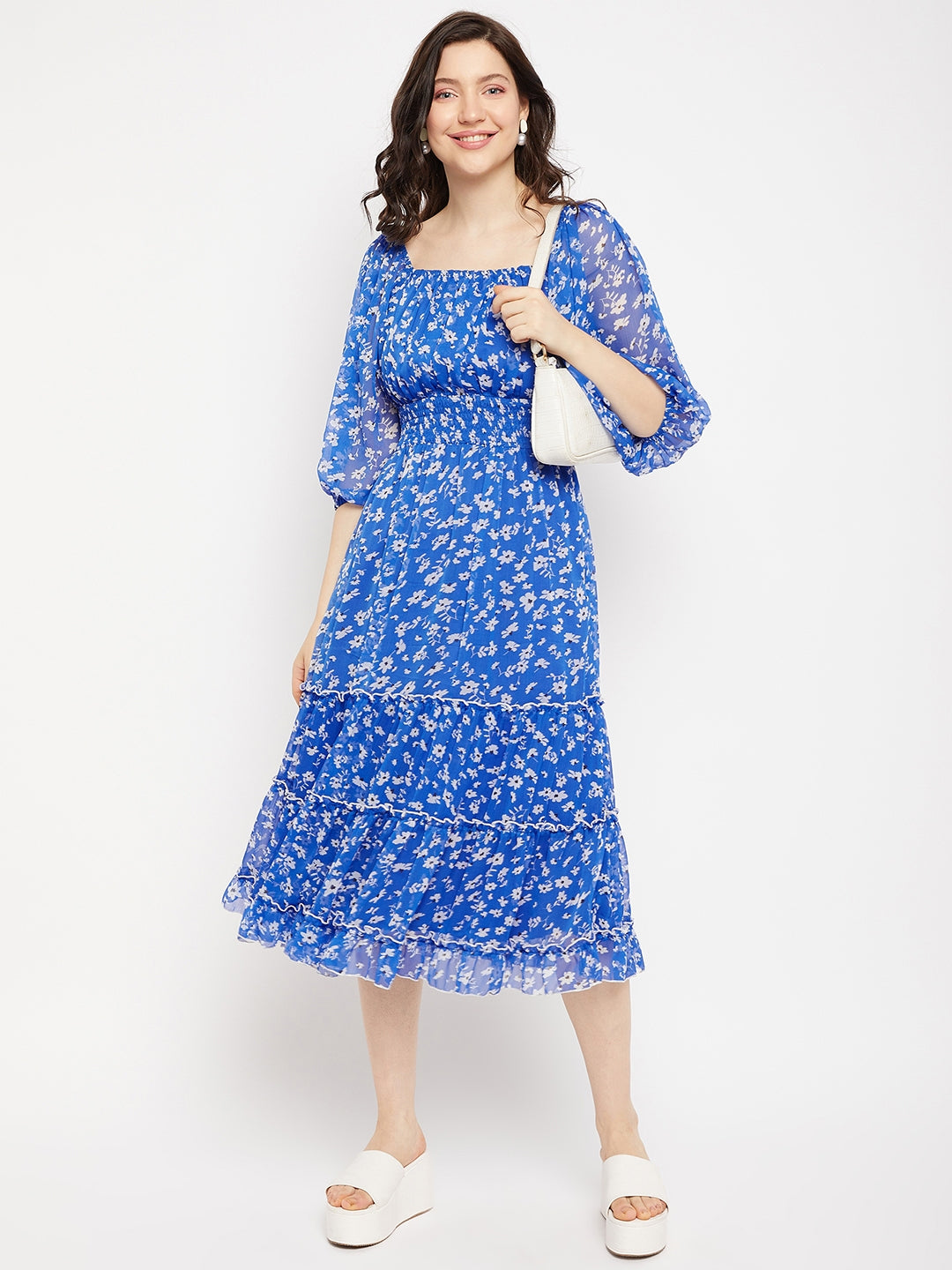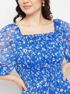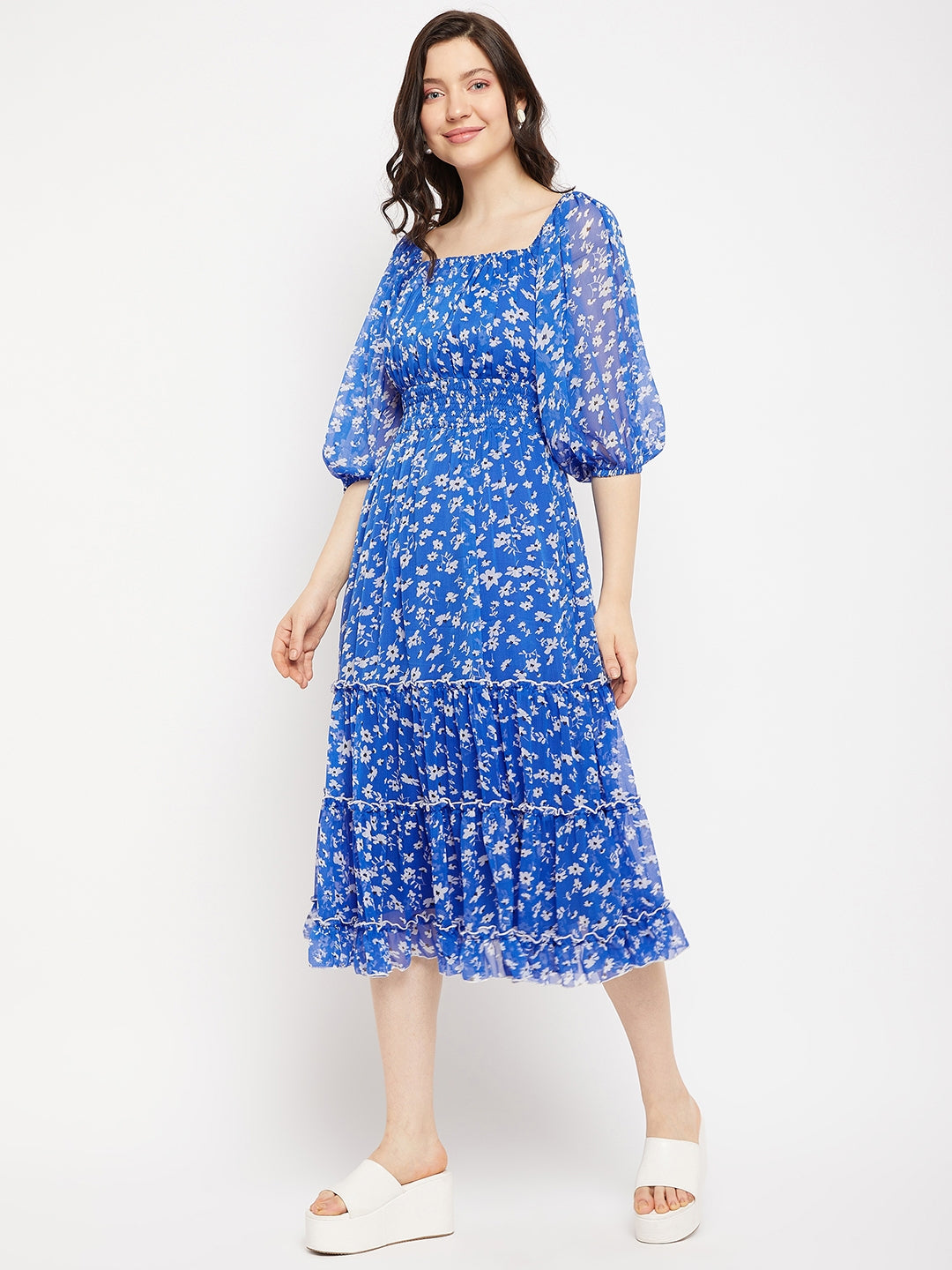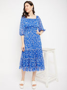 Antheaa Square Neck Floral Printed Smocked Tiered Chiffon Fit & Flare Midi Dress