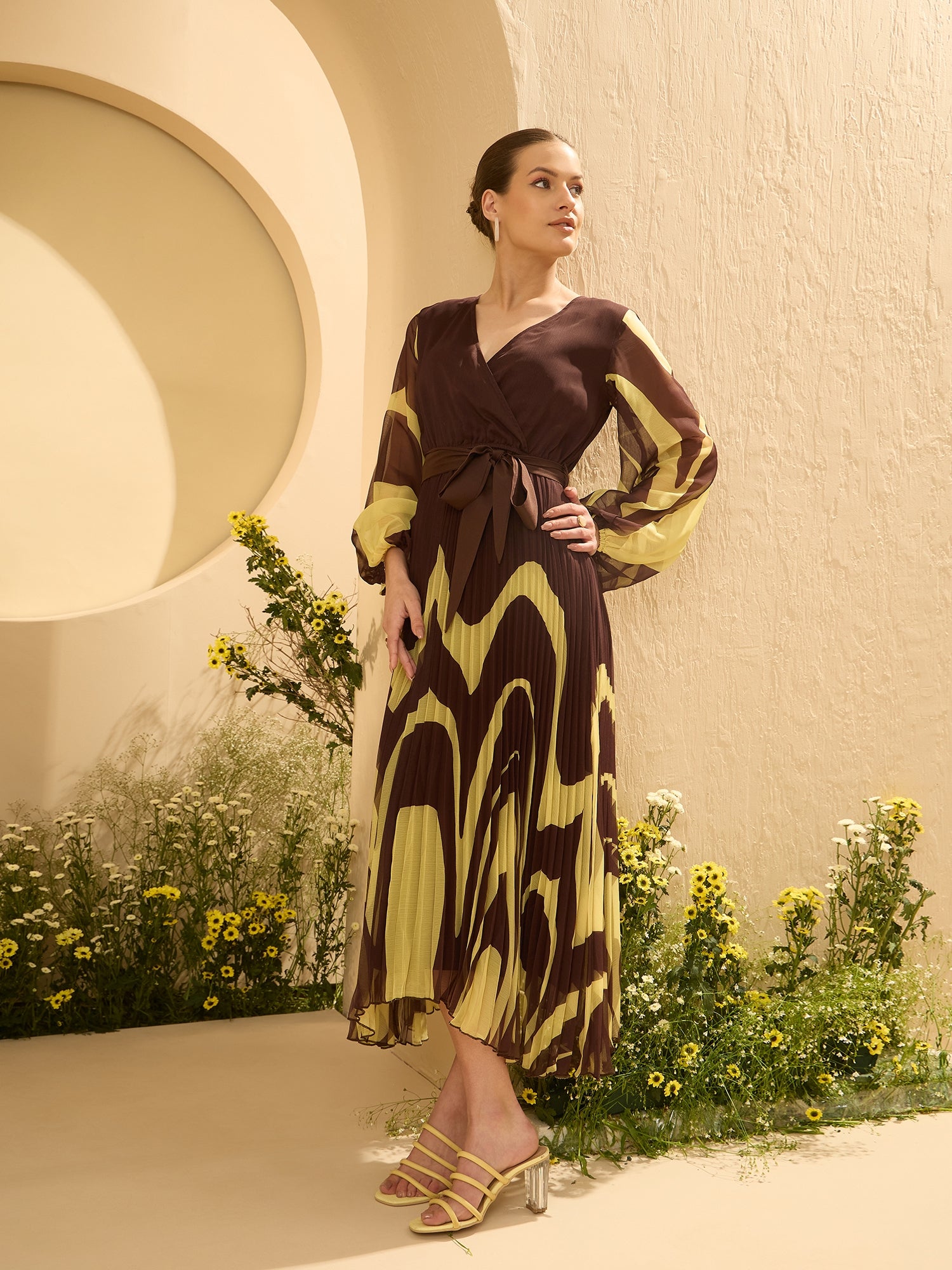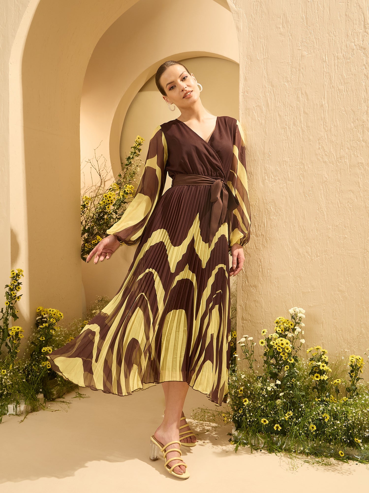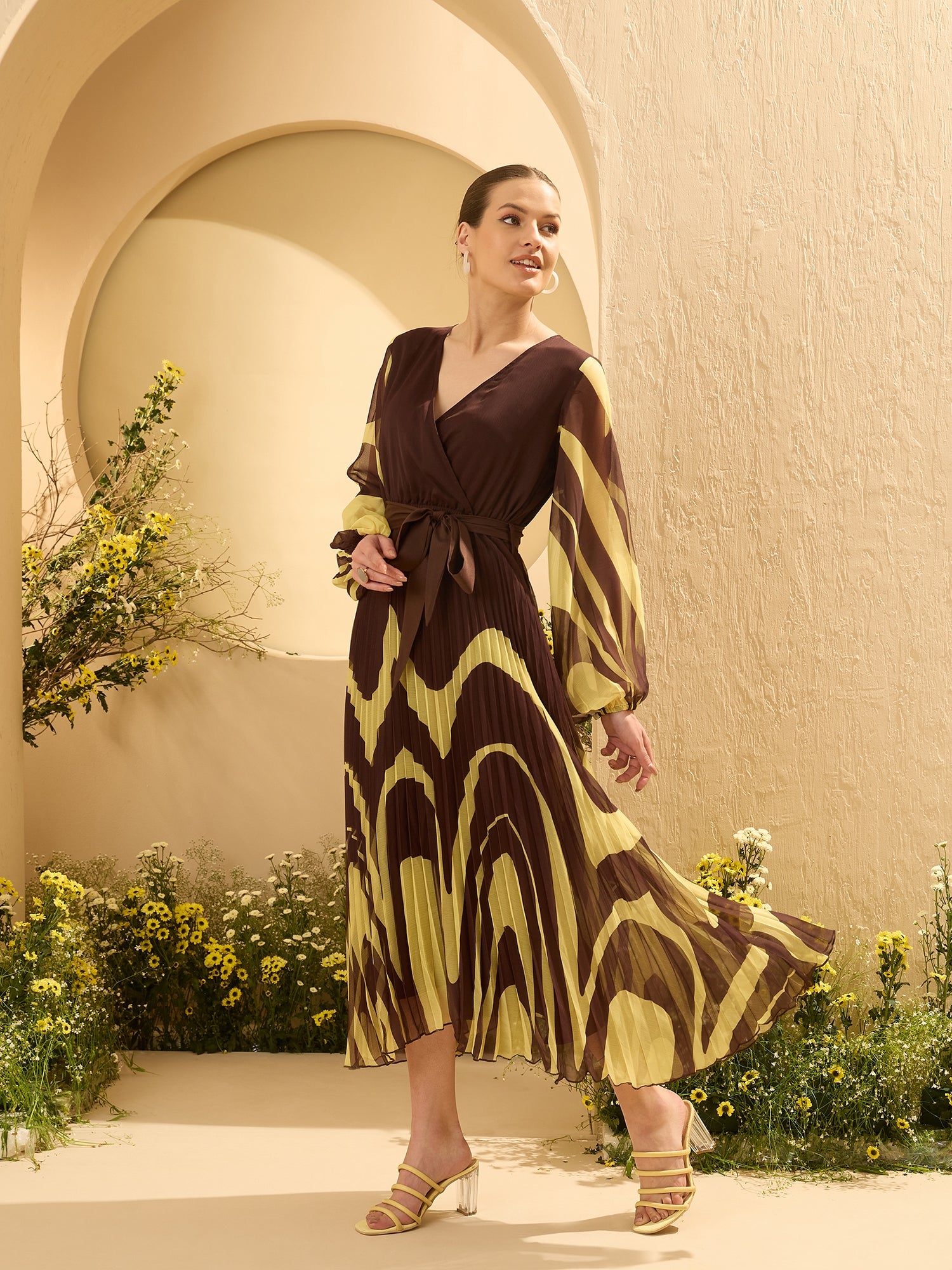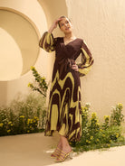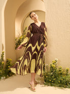 - Brown tropical print wrap dress dress