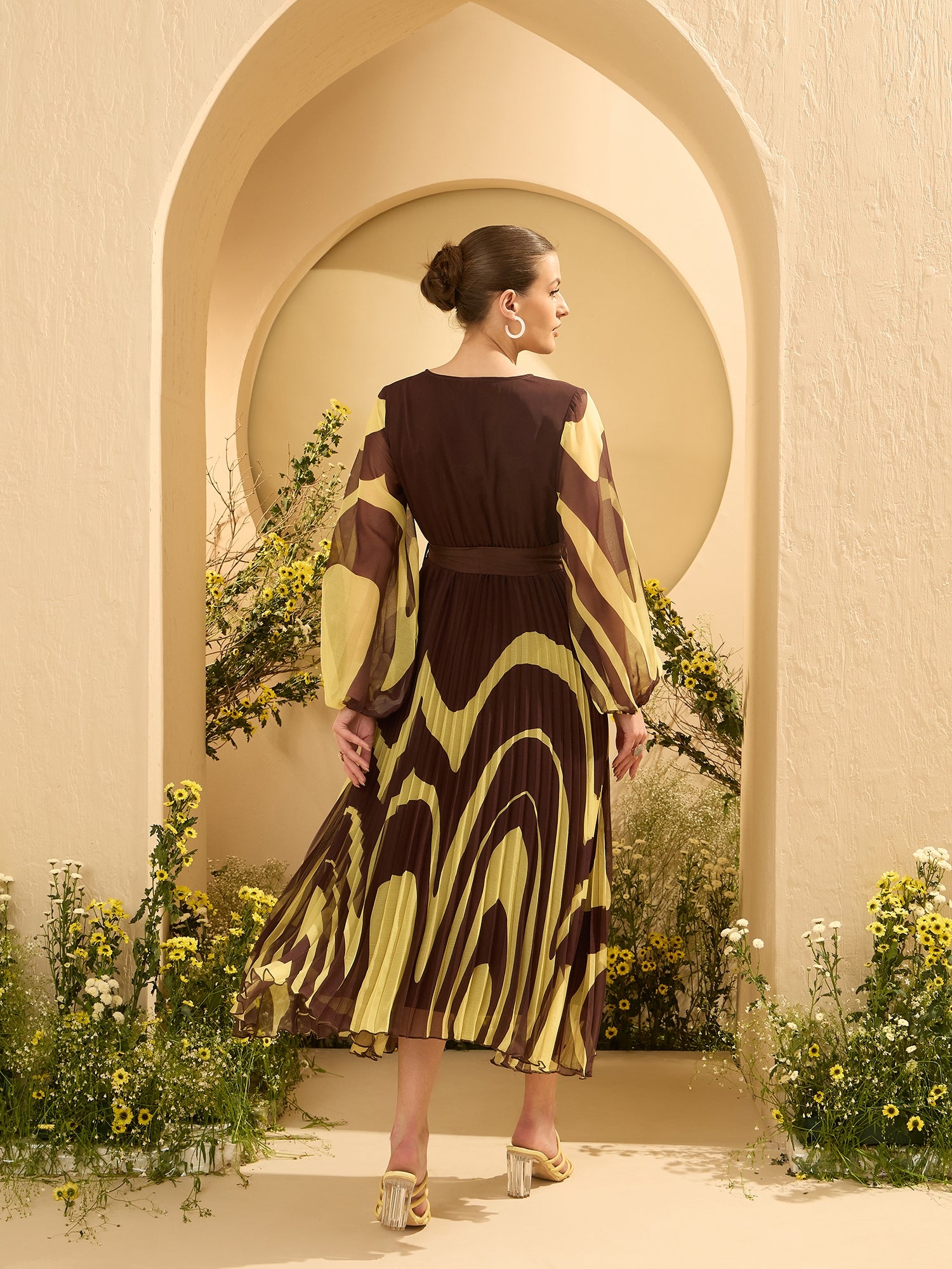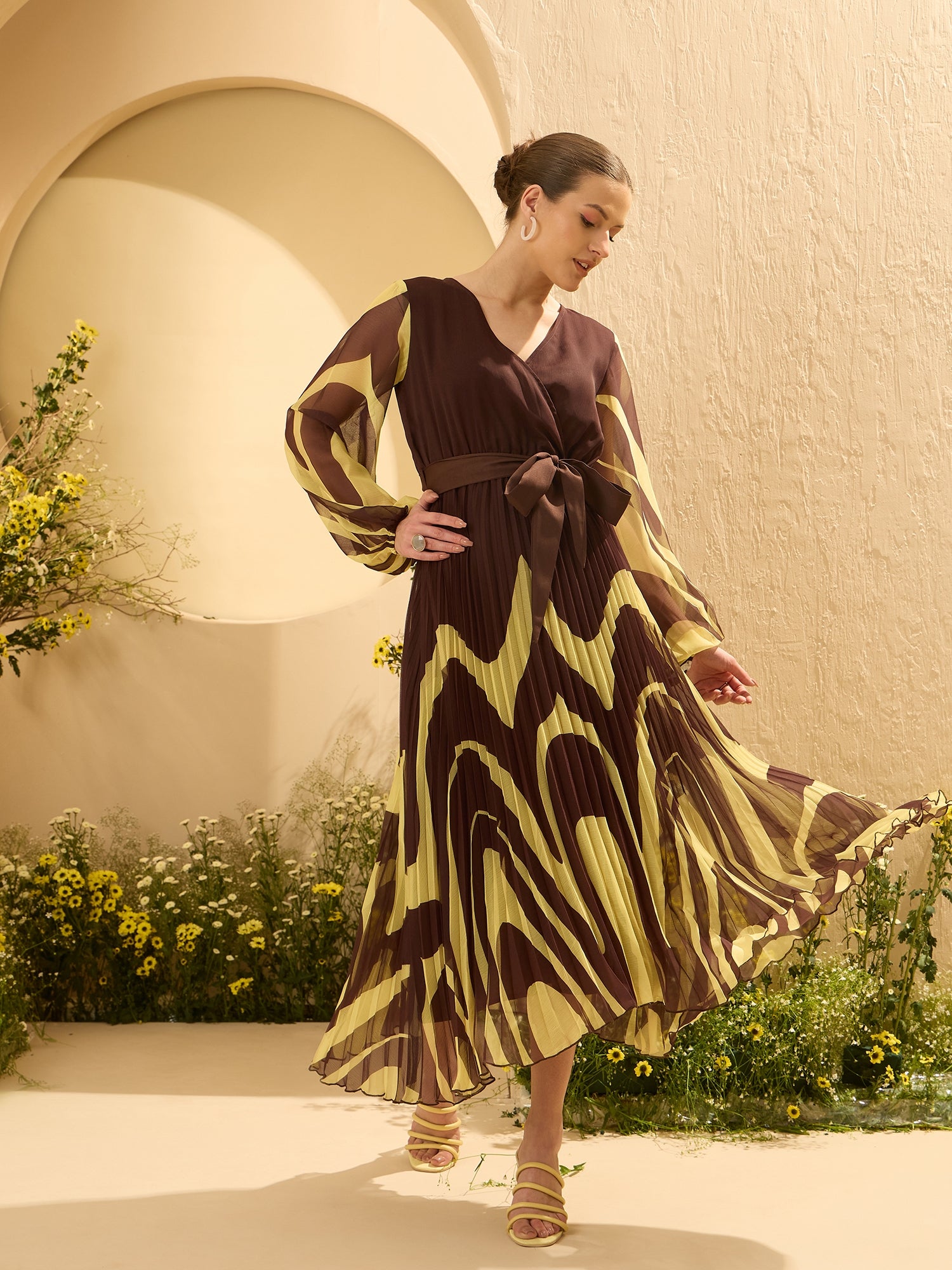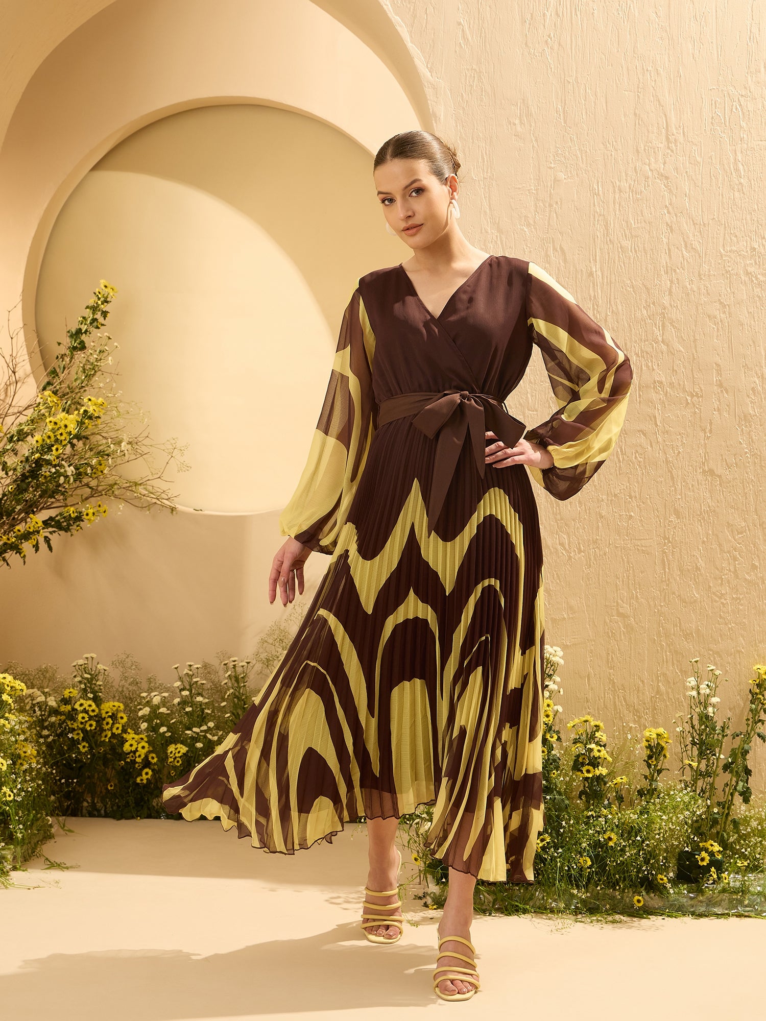 - Brown tropical print wrap dress dress