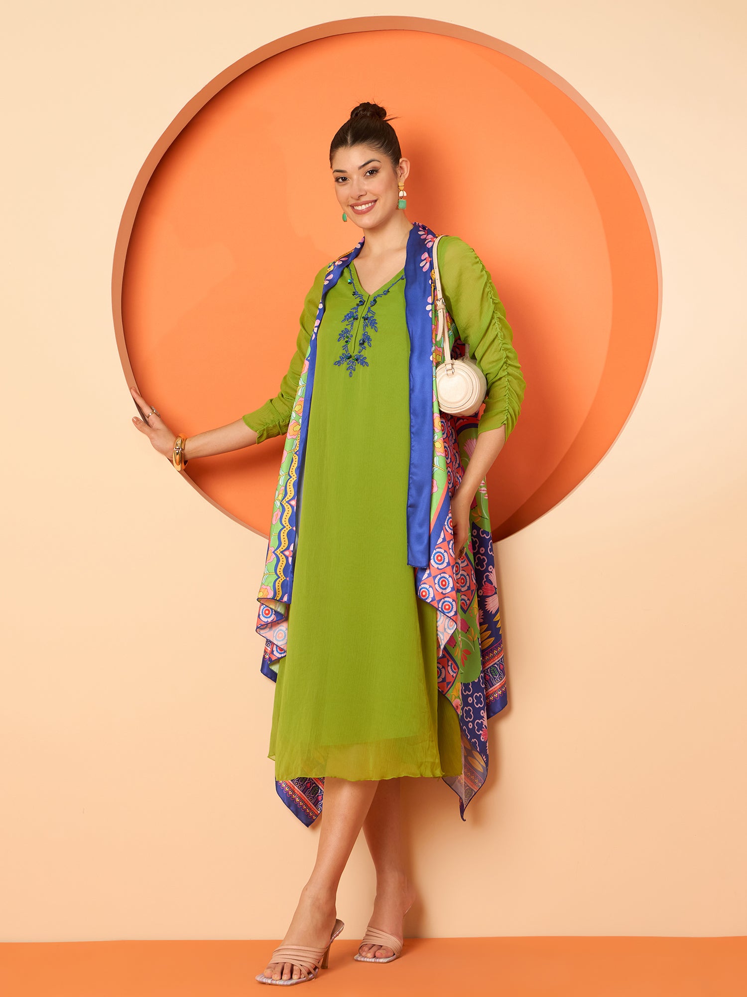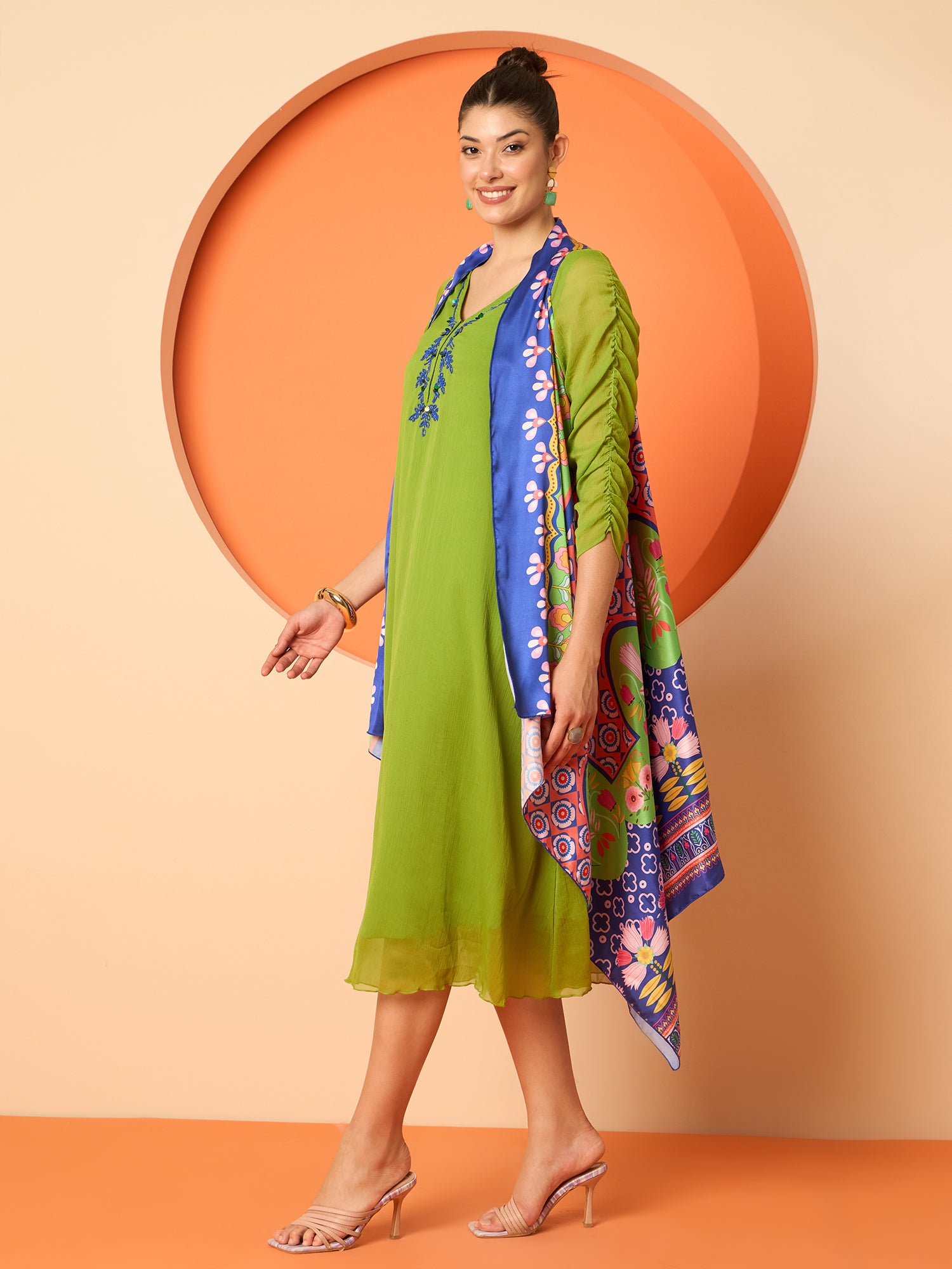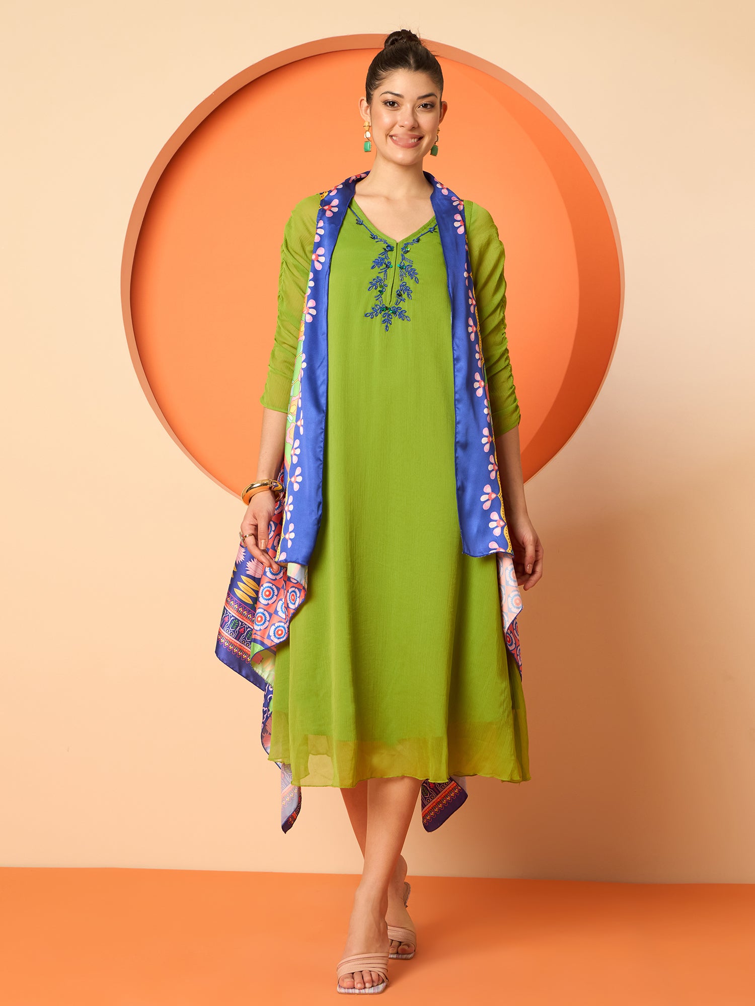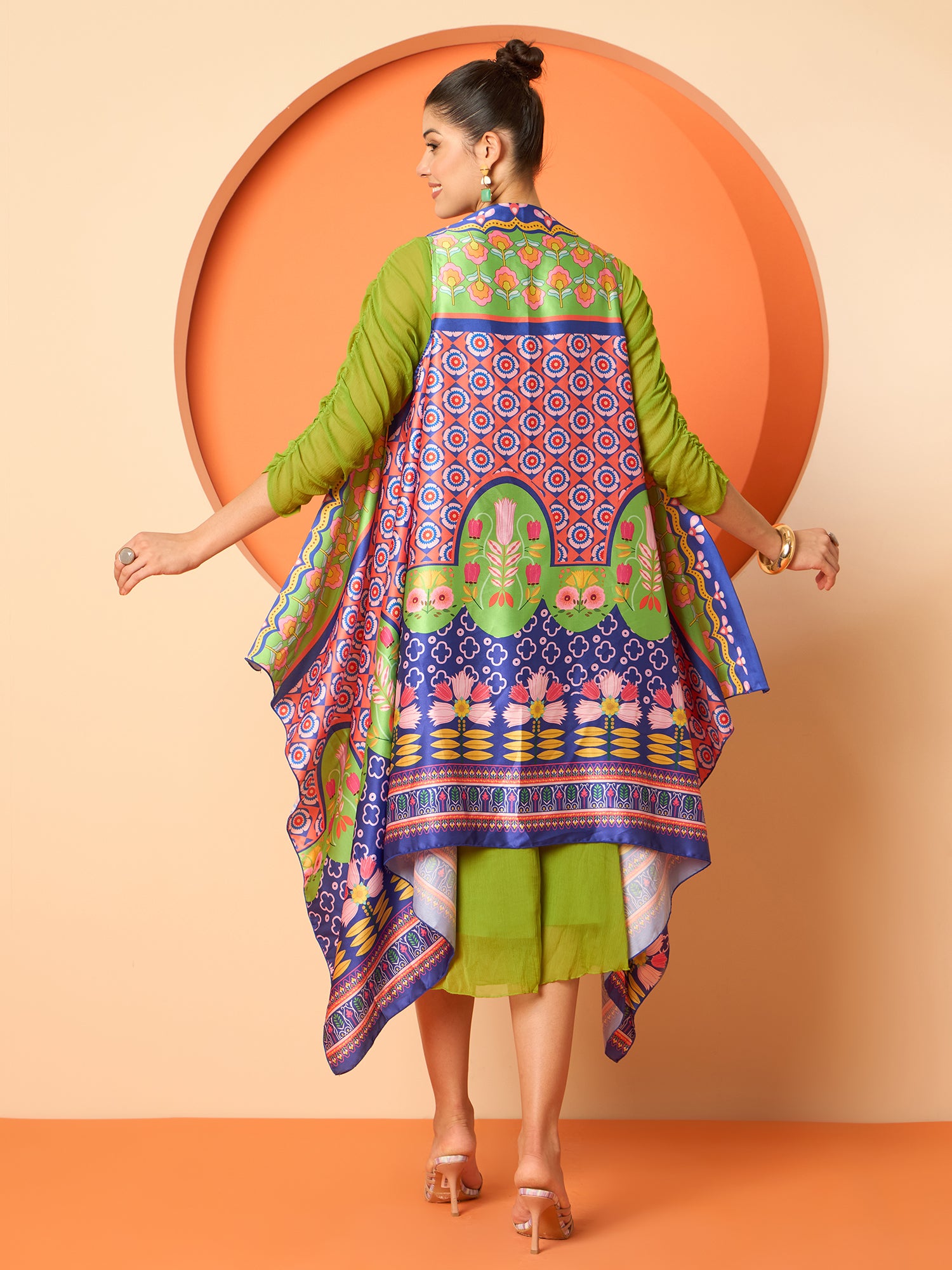 - Comes with a blue, green & pink printed shrug