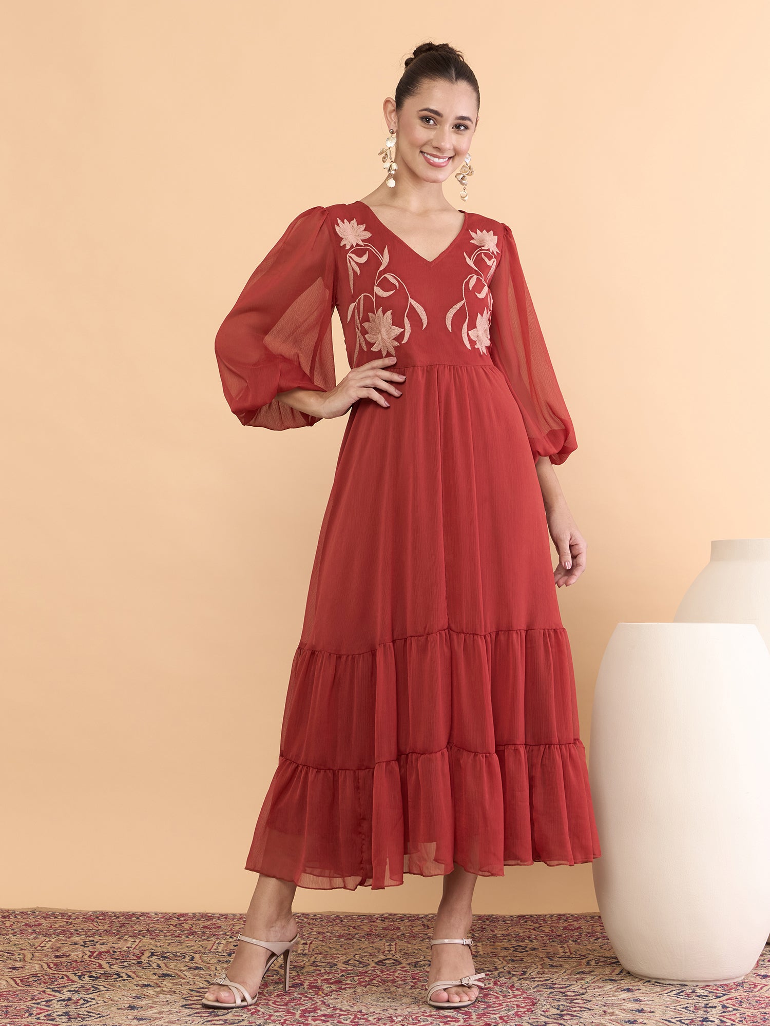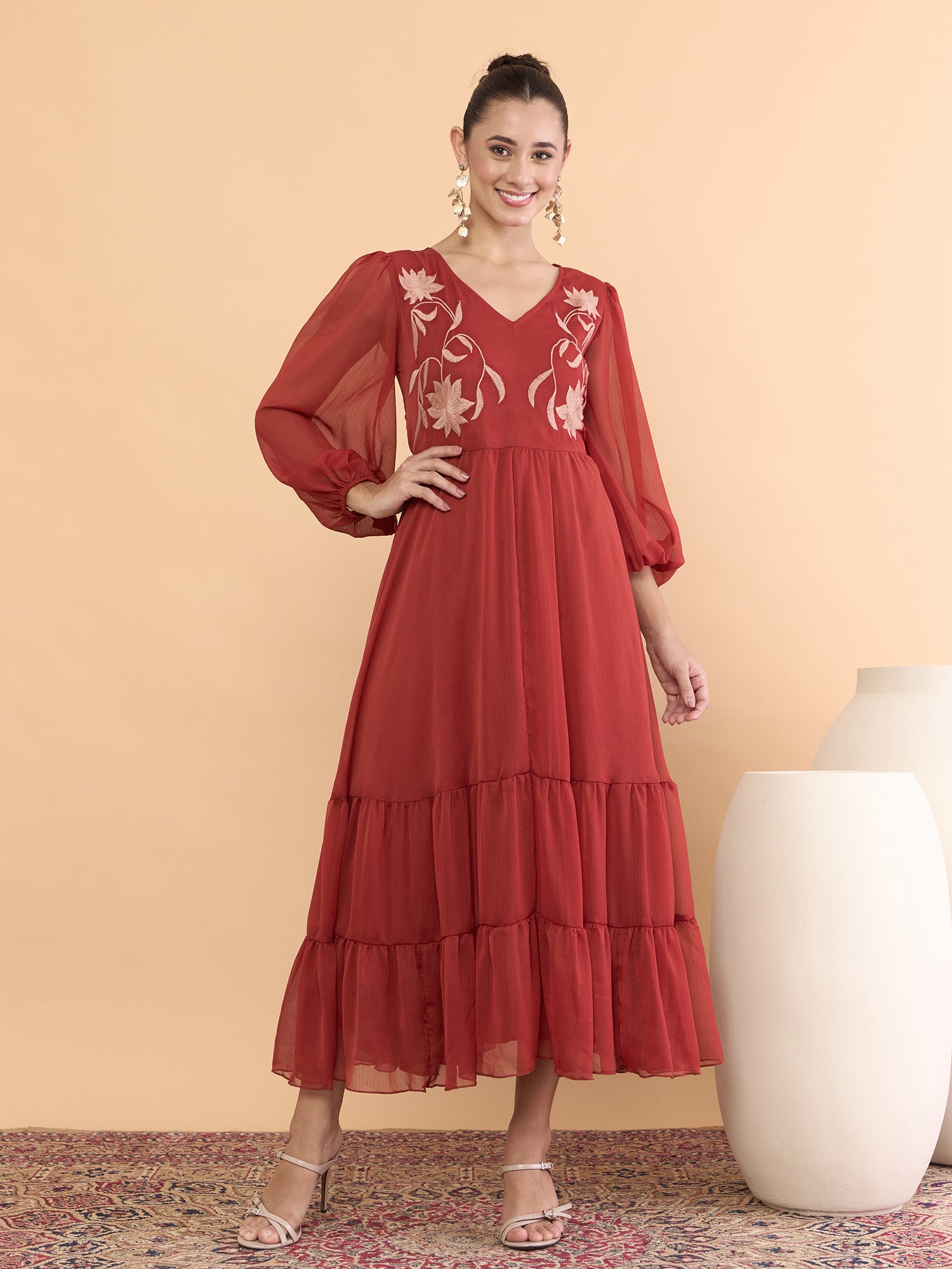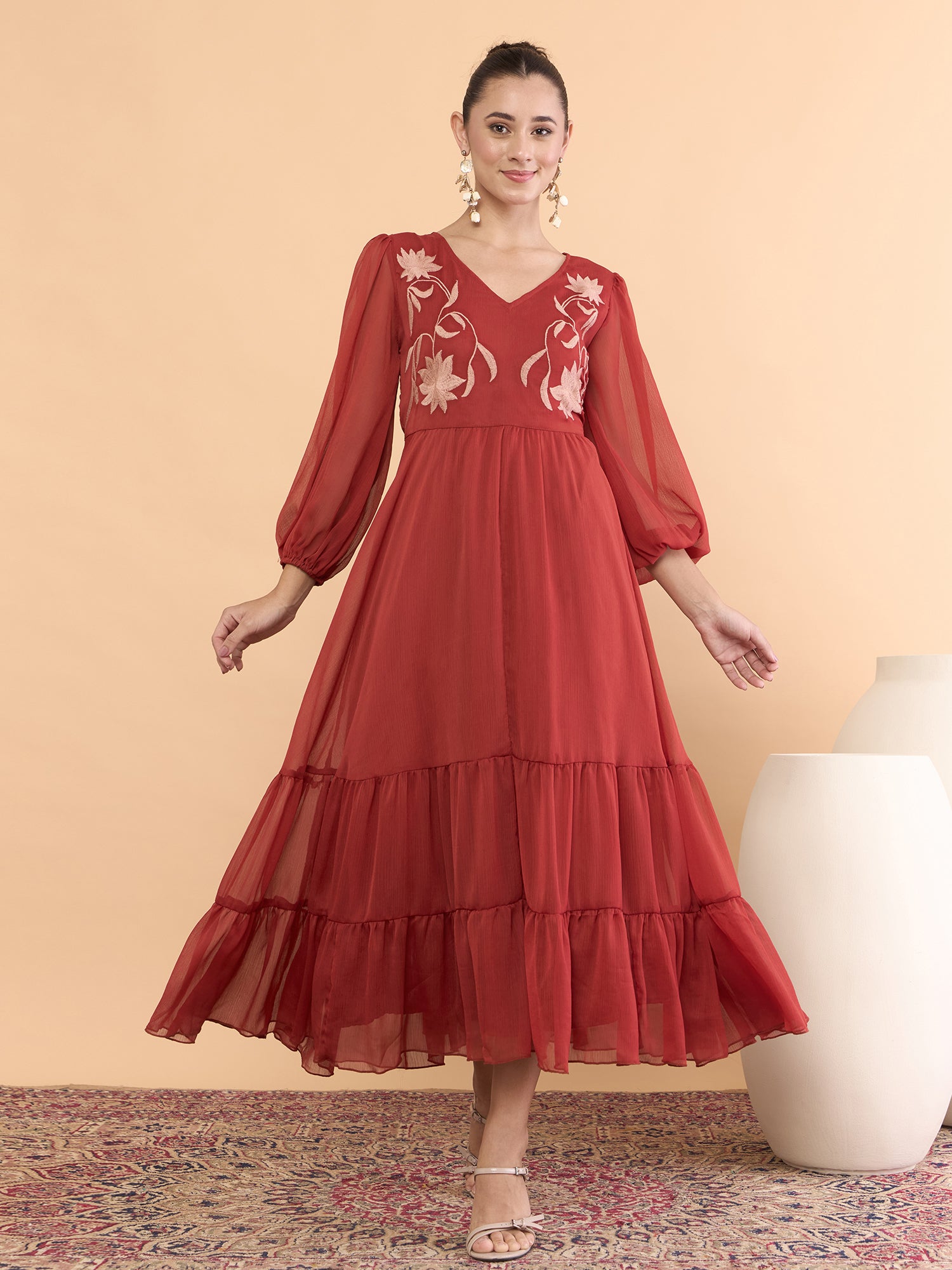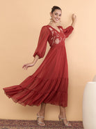 Antheaa Women Floral Embroidered Bishop Sleeve Chiffon Midi Dress
