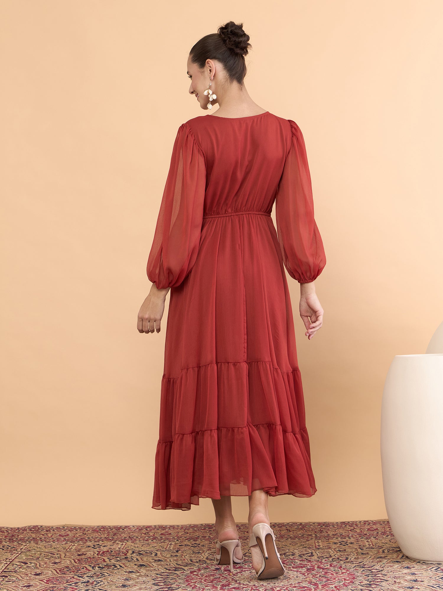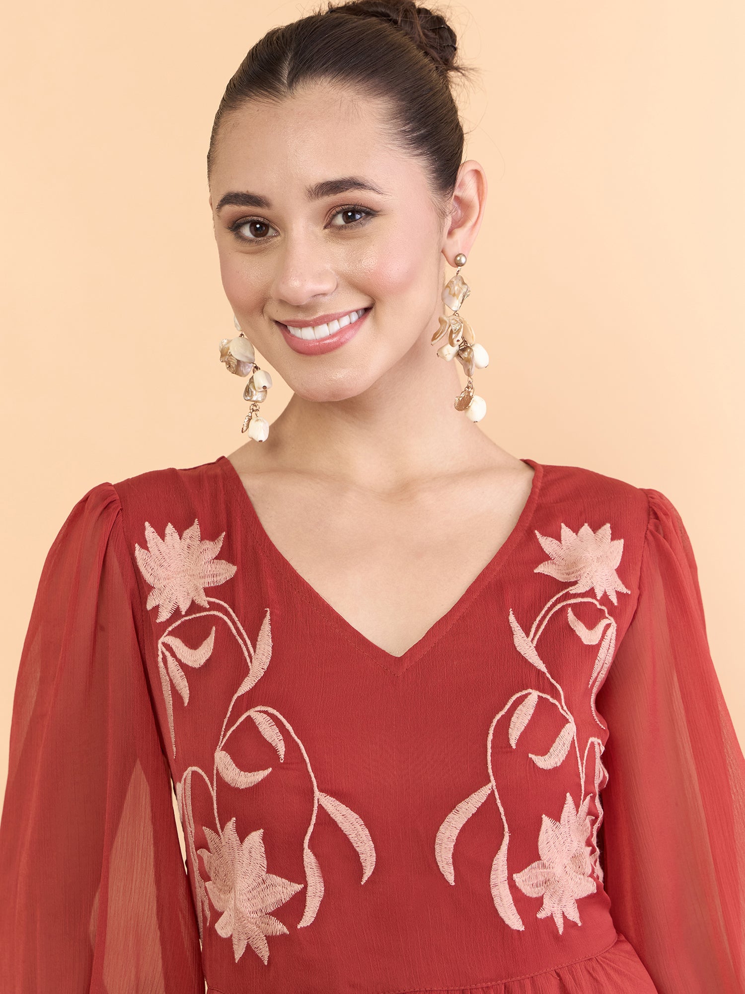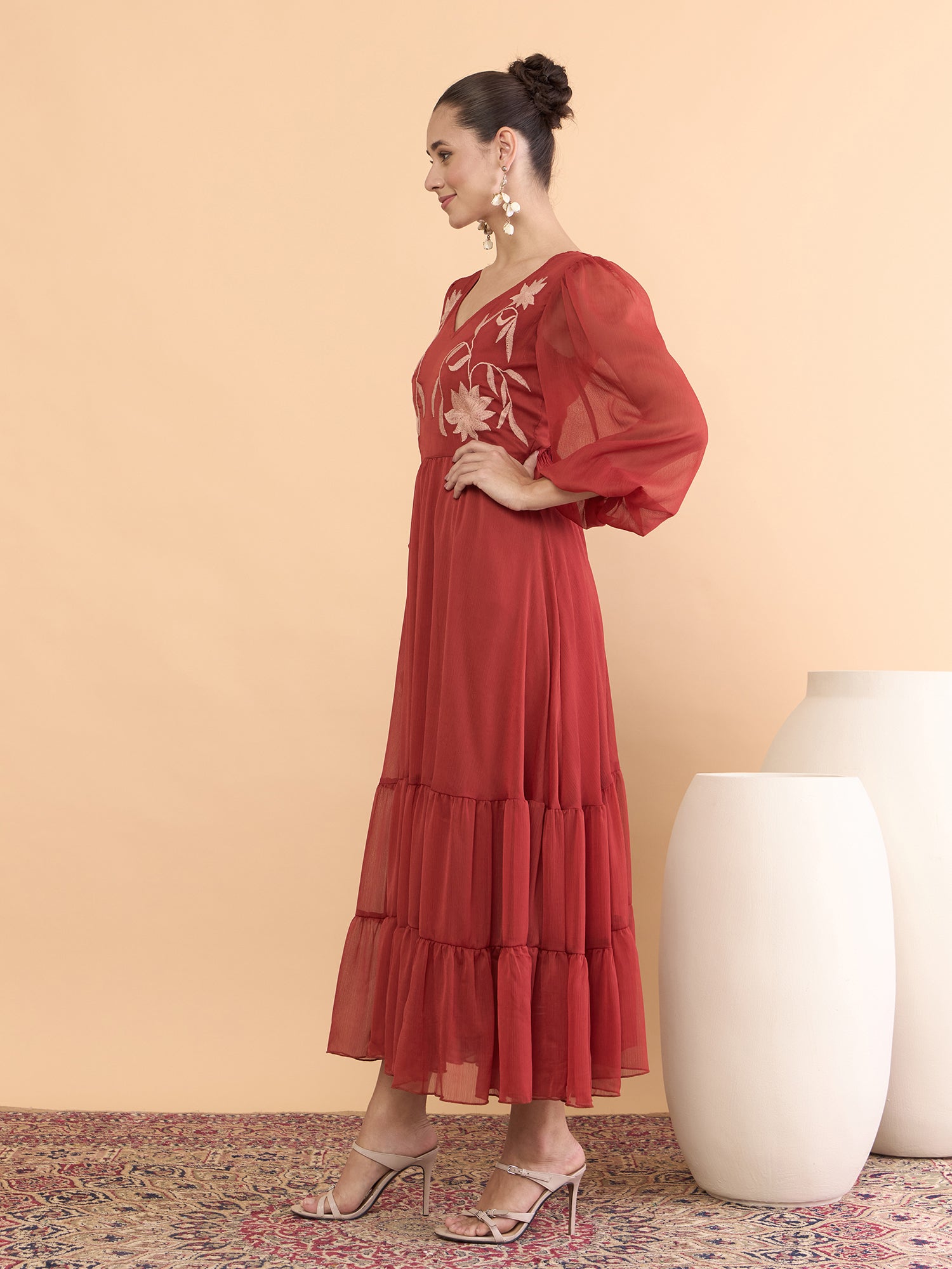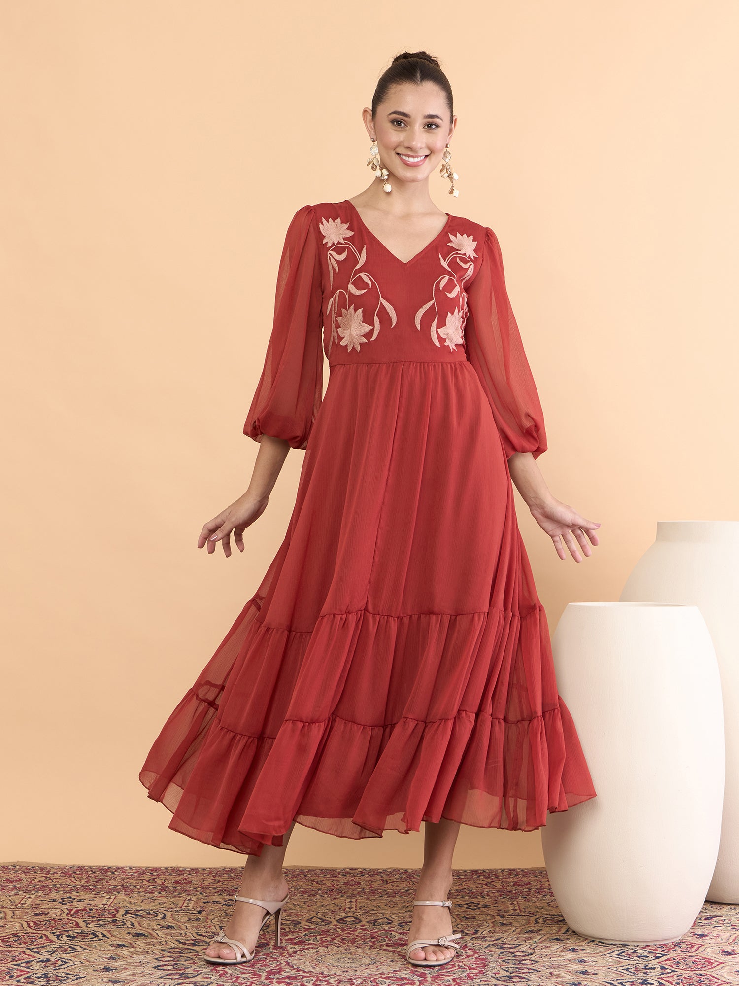 Antheaa Women Floral Embroidered Bishop Sleeve Chiffon Midi Dress