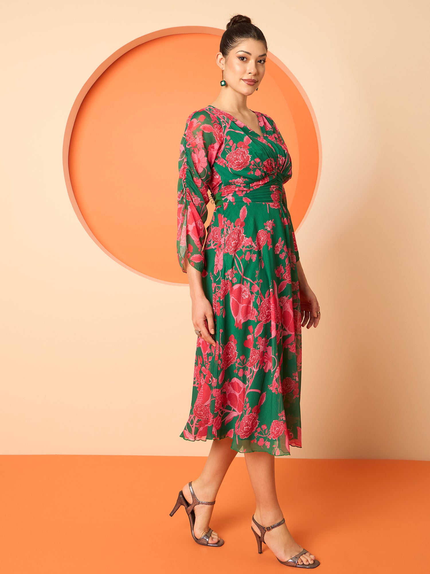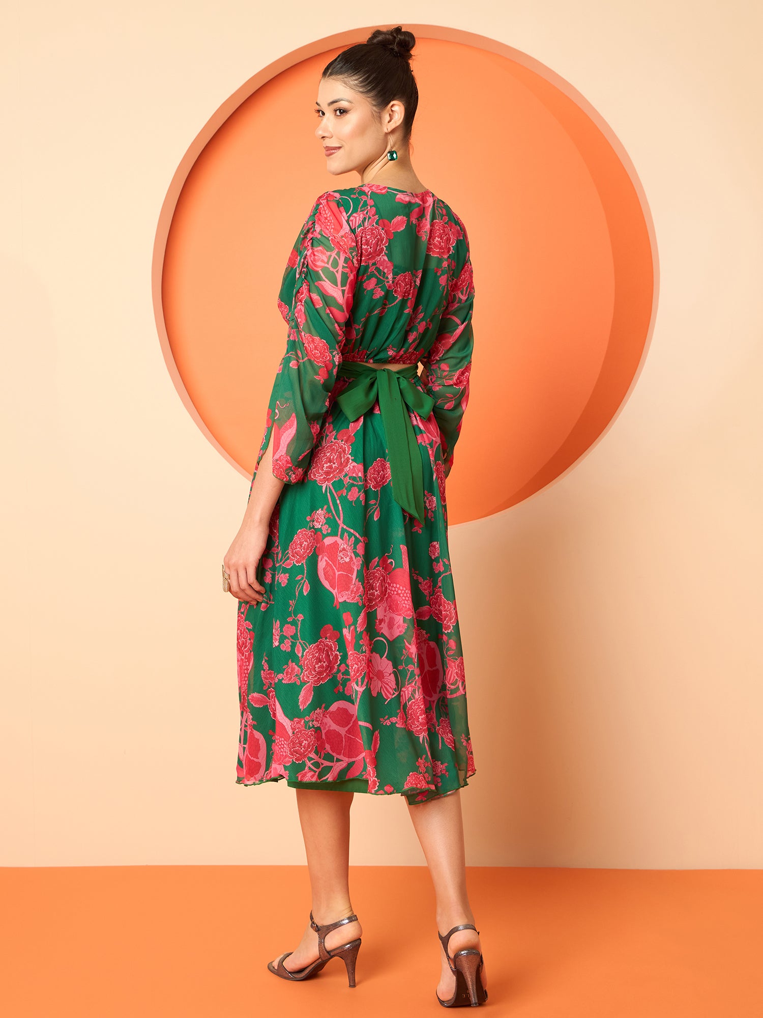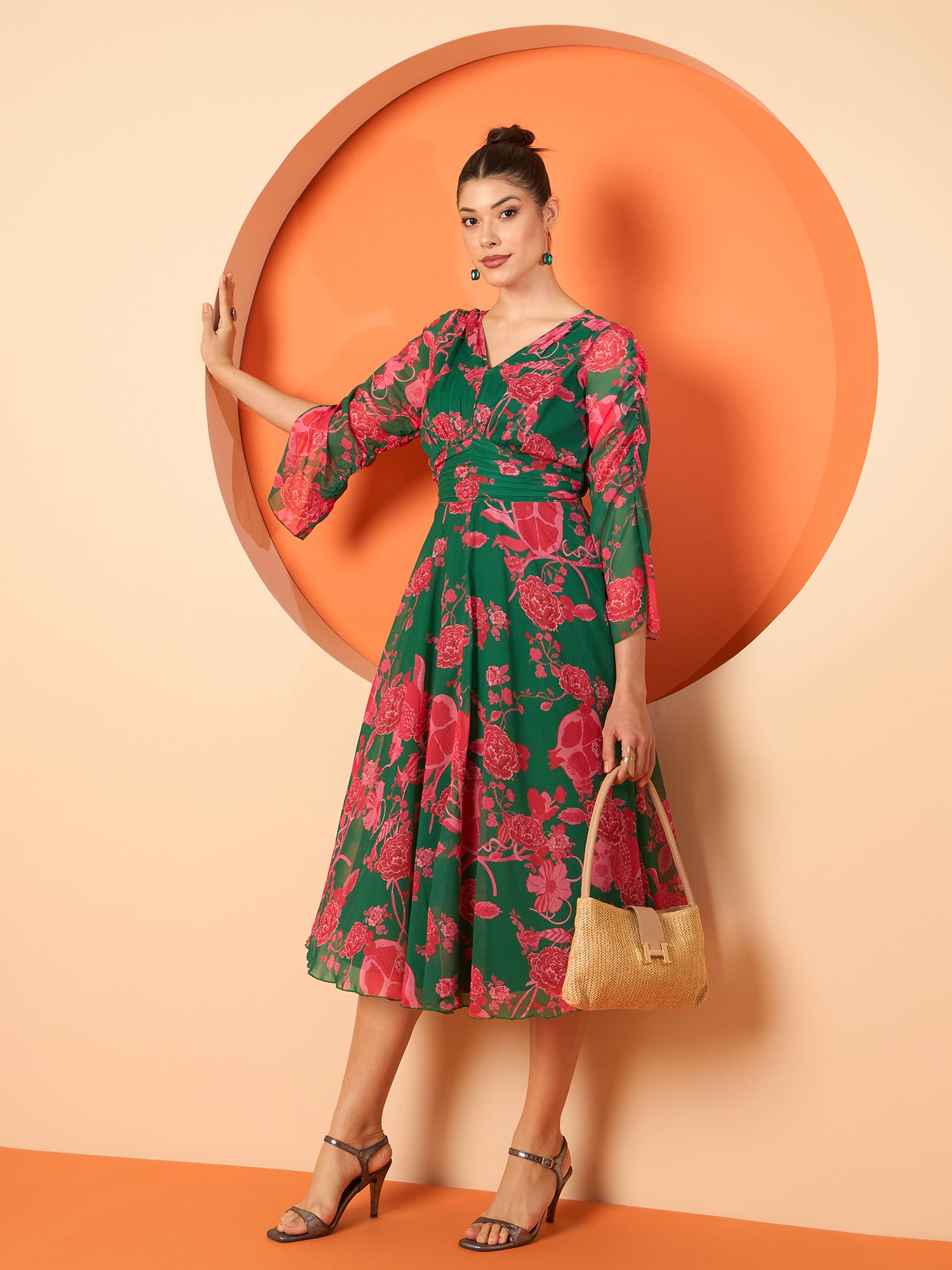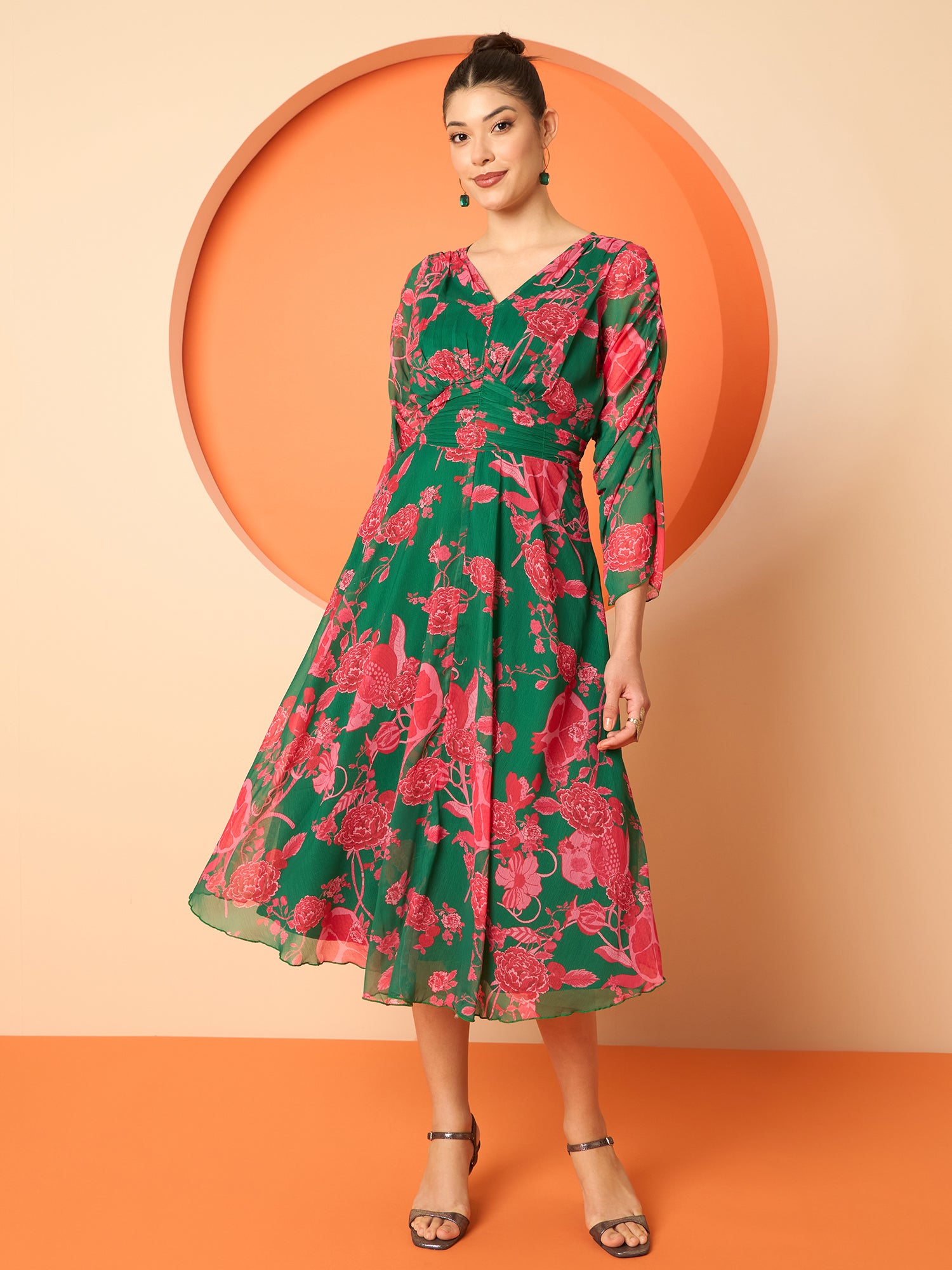 Antheaa Women Floral Print Chiffon Fit & Flare Midi Dress