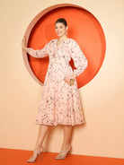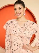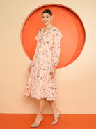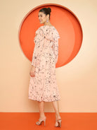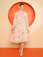 Antheaa Women Floral Print Chiffon Frilled A-Line Midi Dress