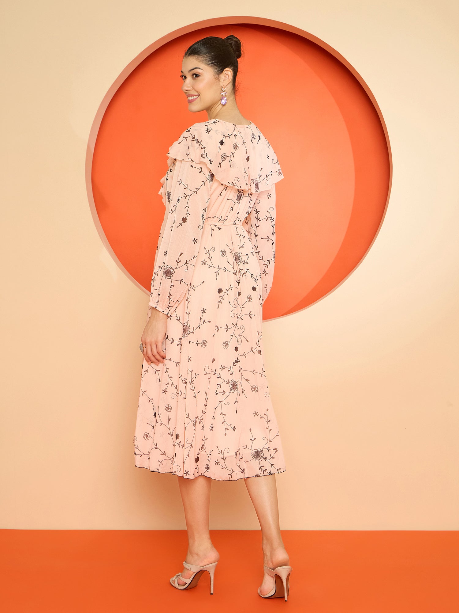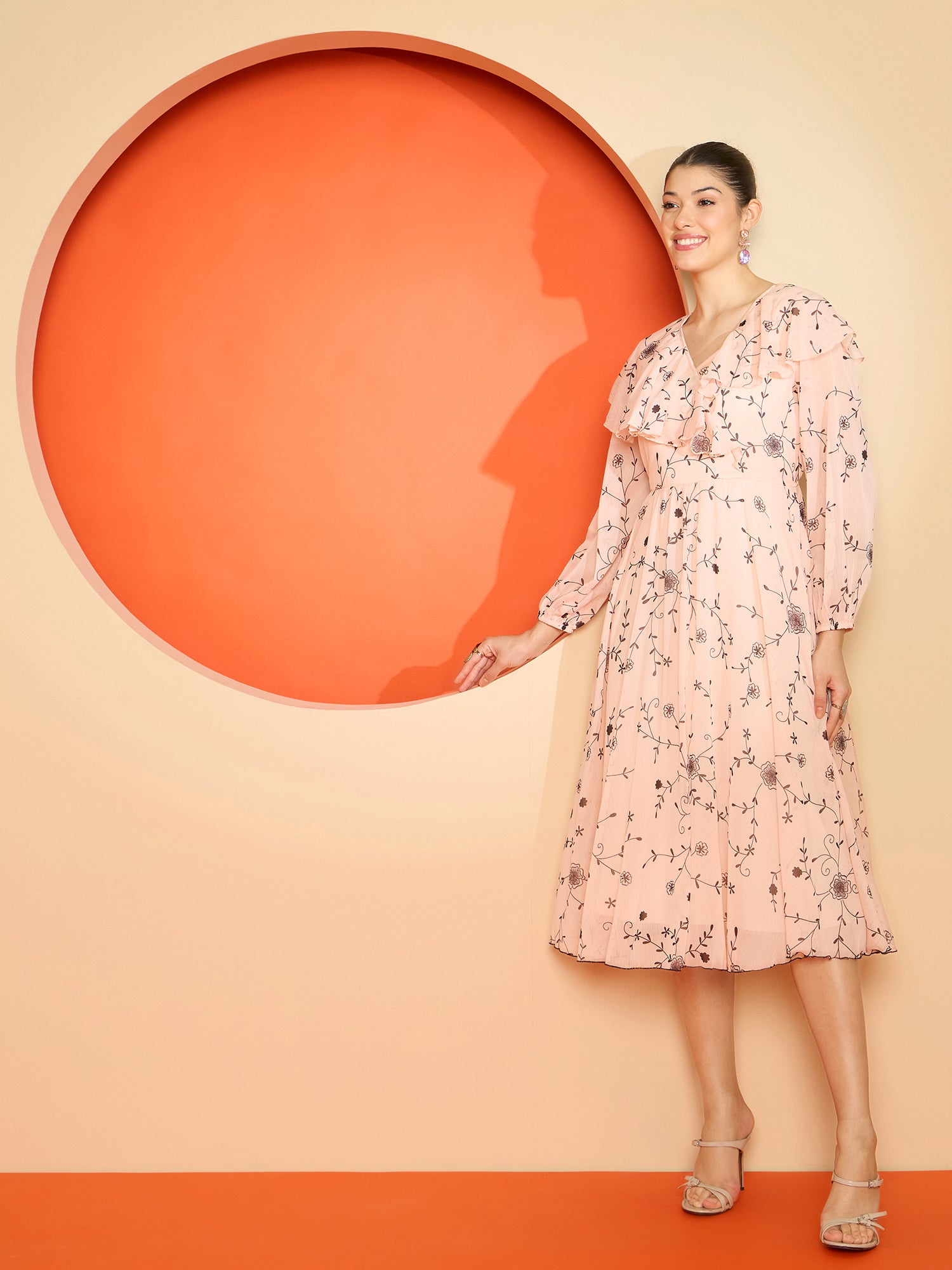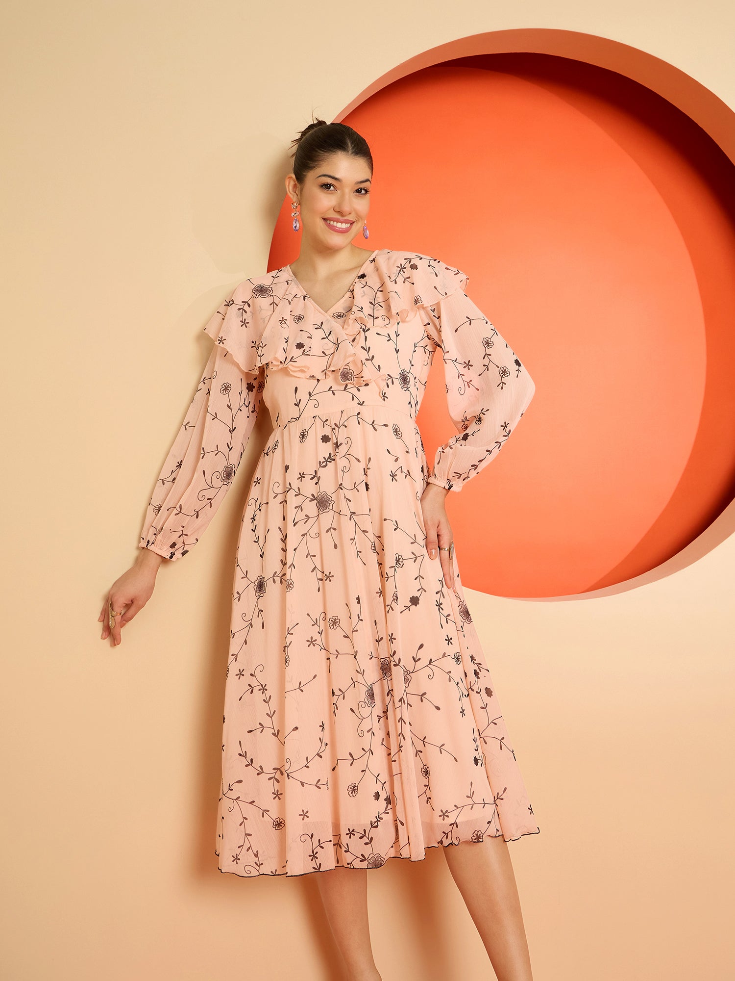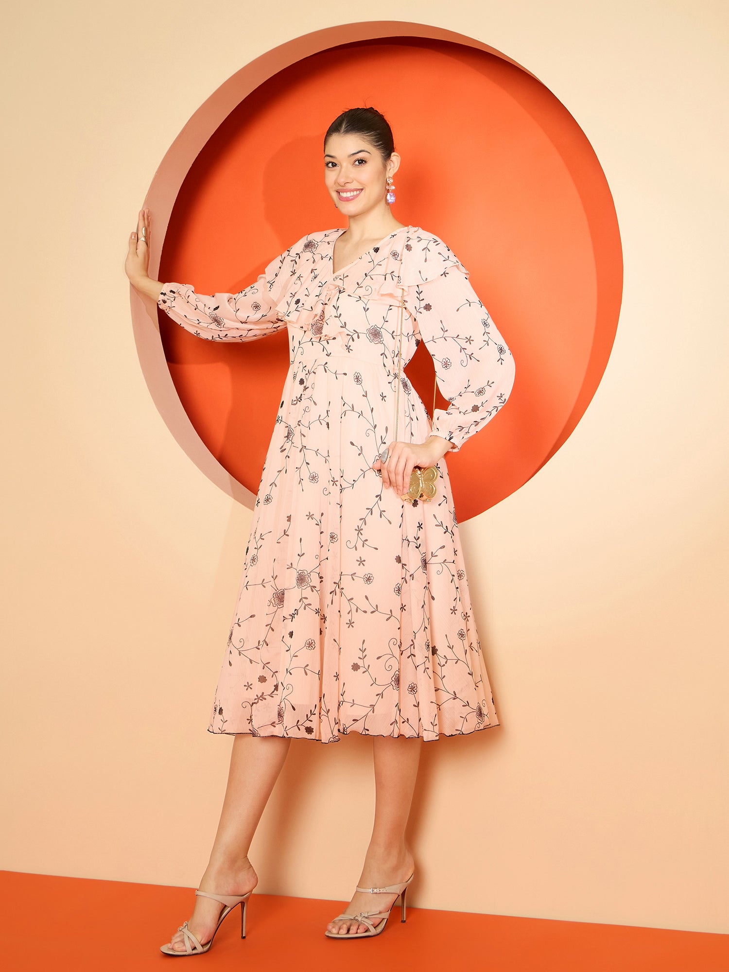 - Peach-coloured floral print a-line dress