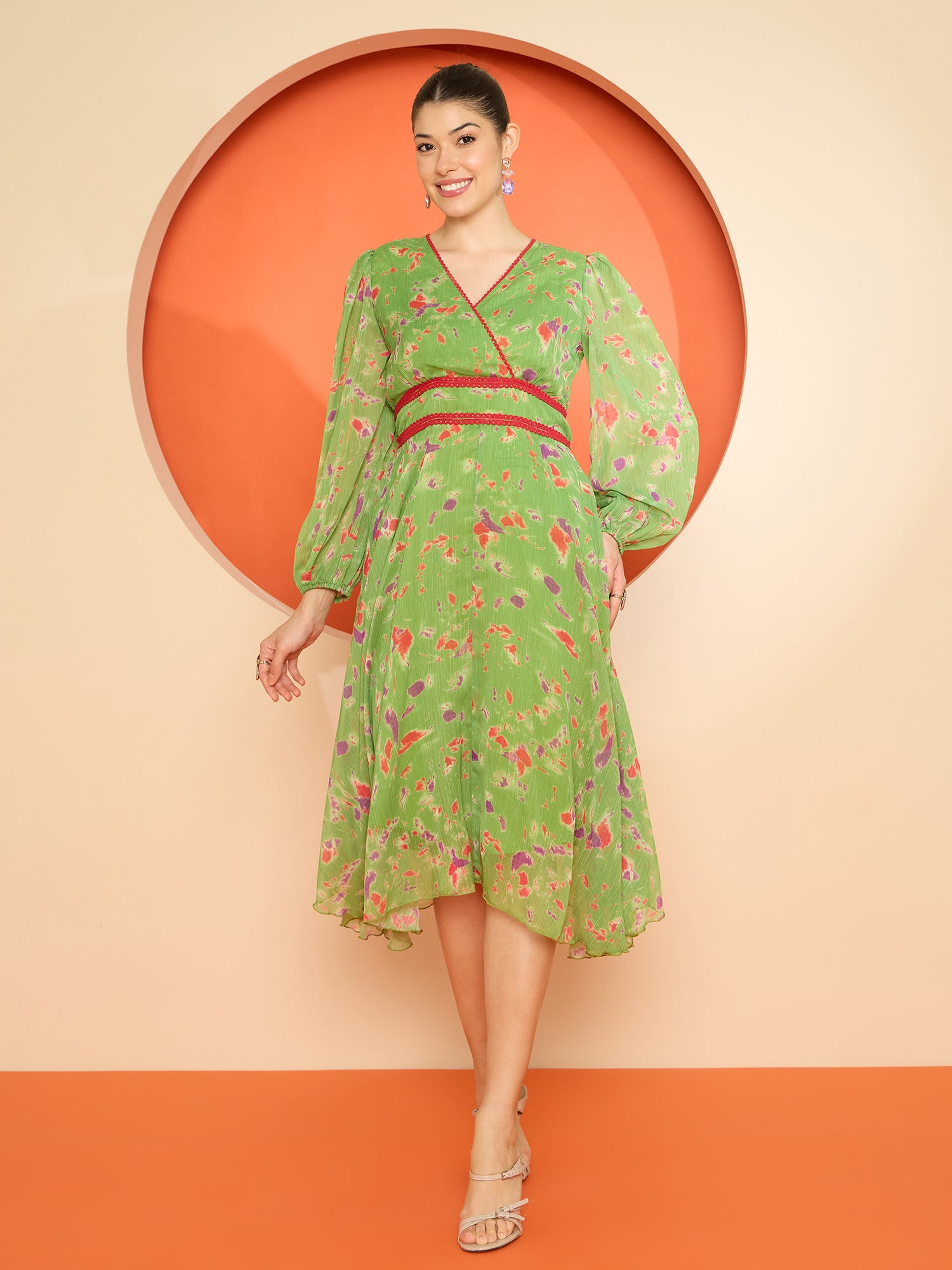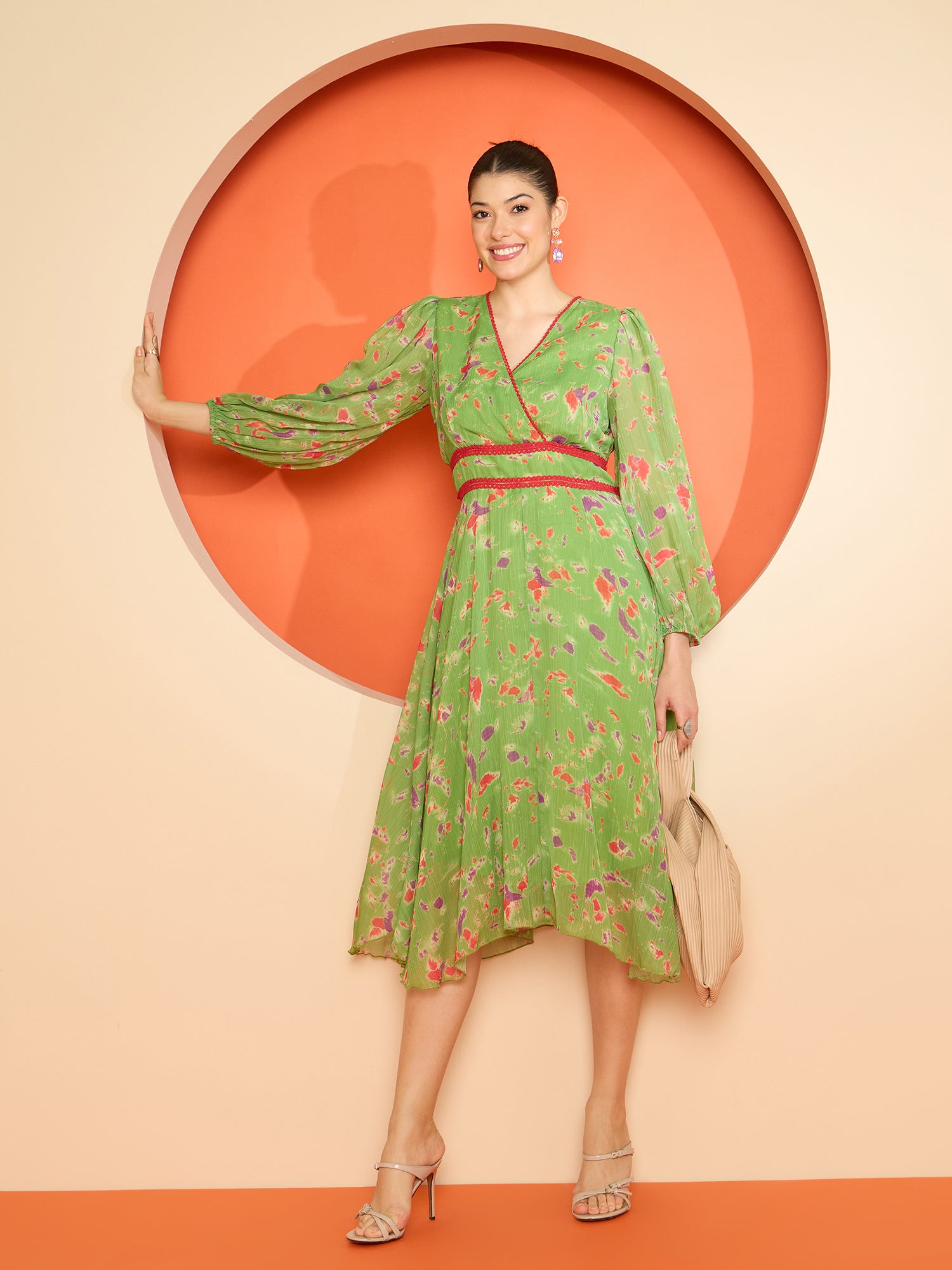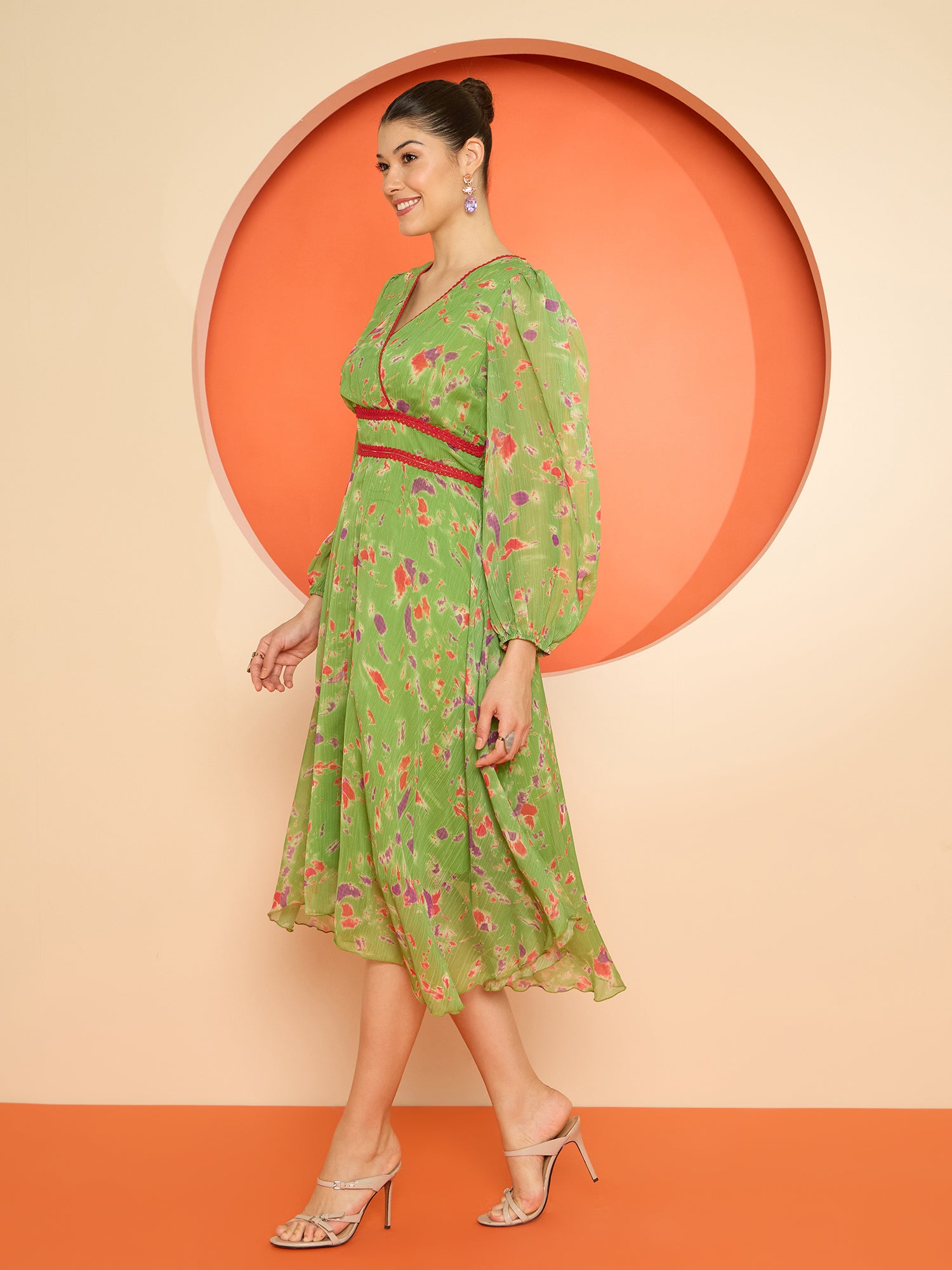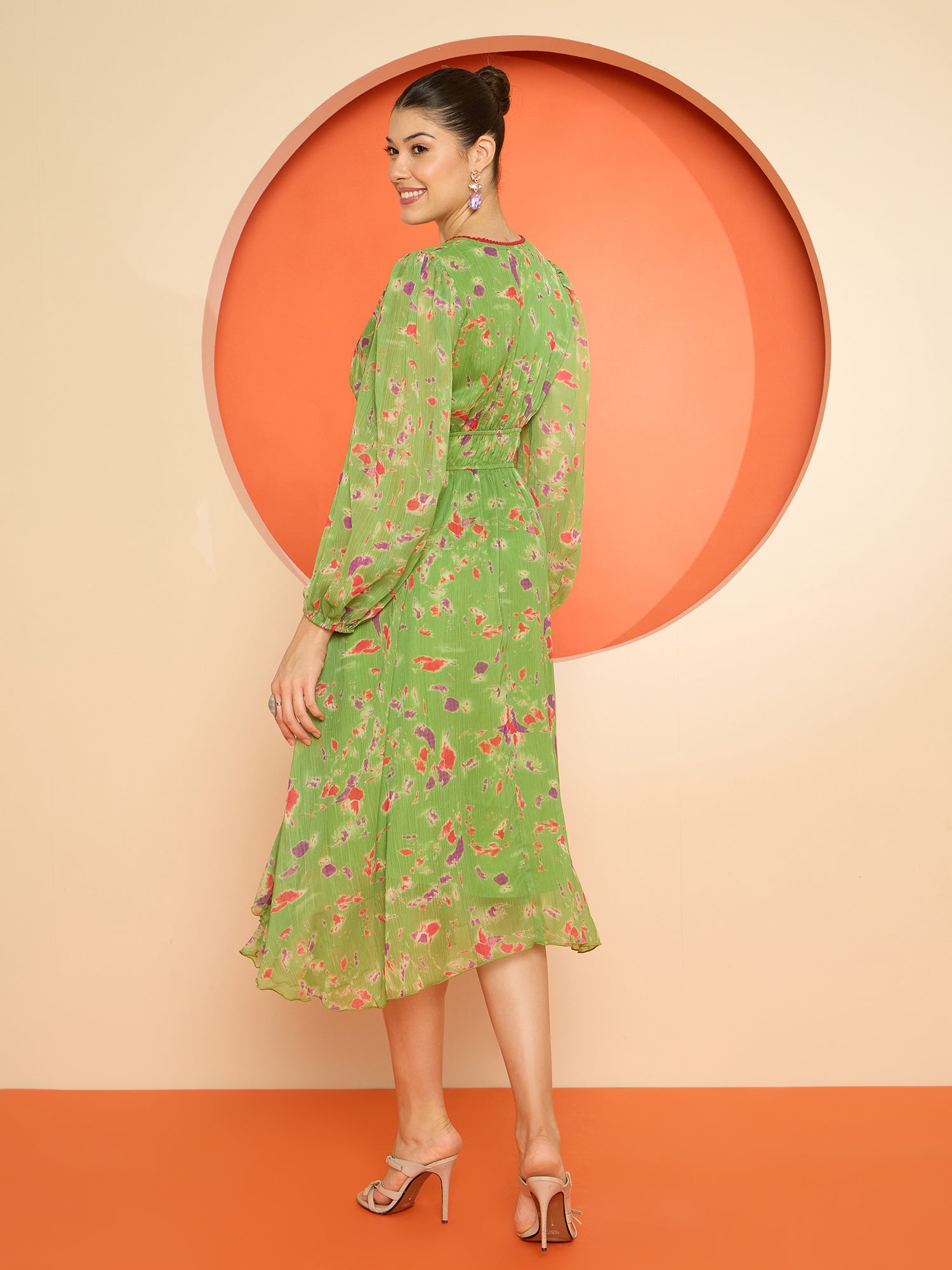 Antheaa Women Floral Printed Gathered or Pleated Chiffon Fit & Flare Midi Dress