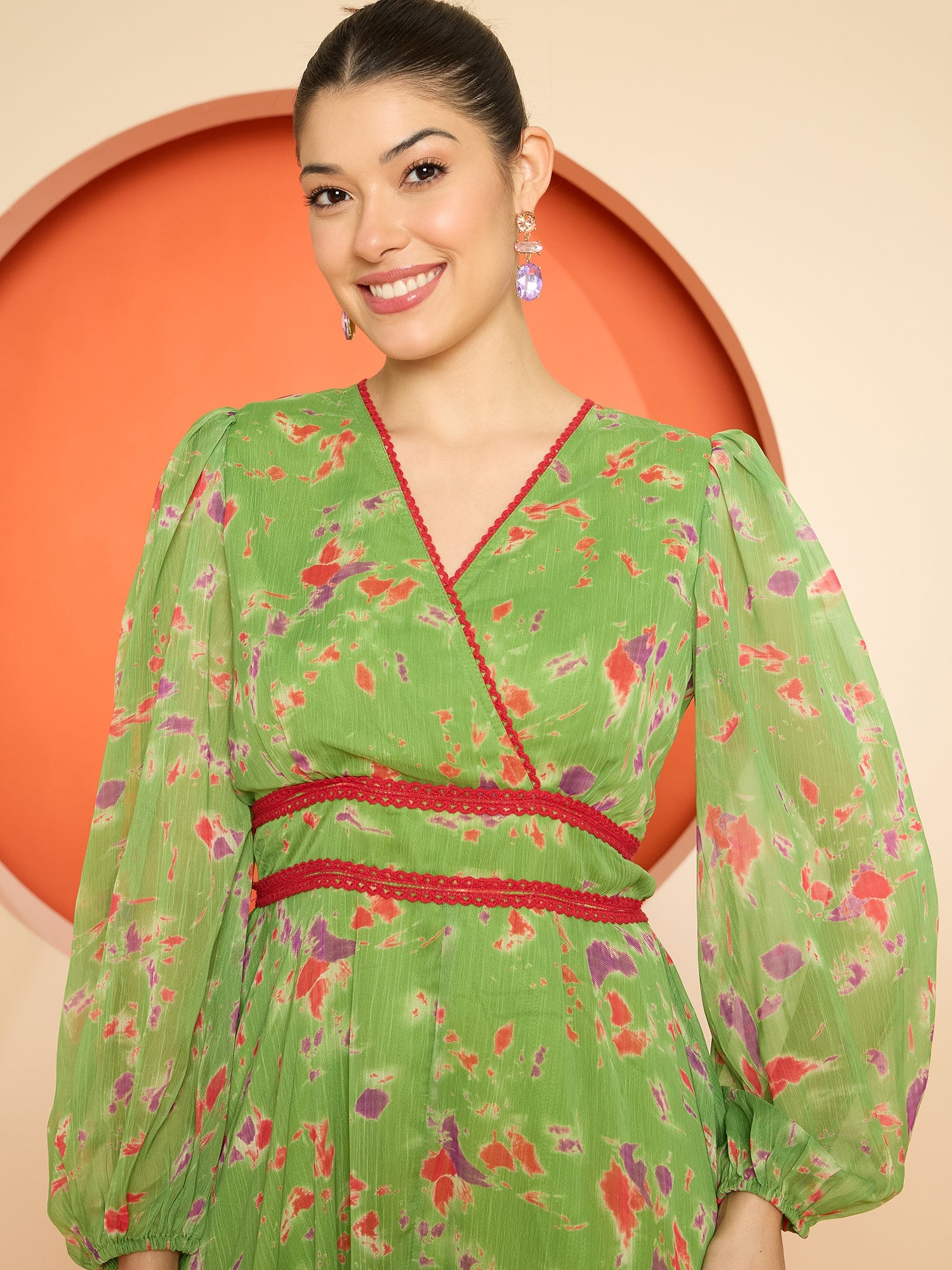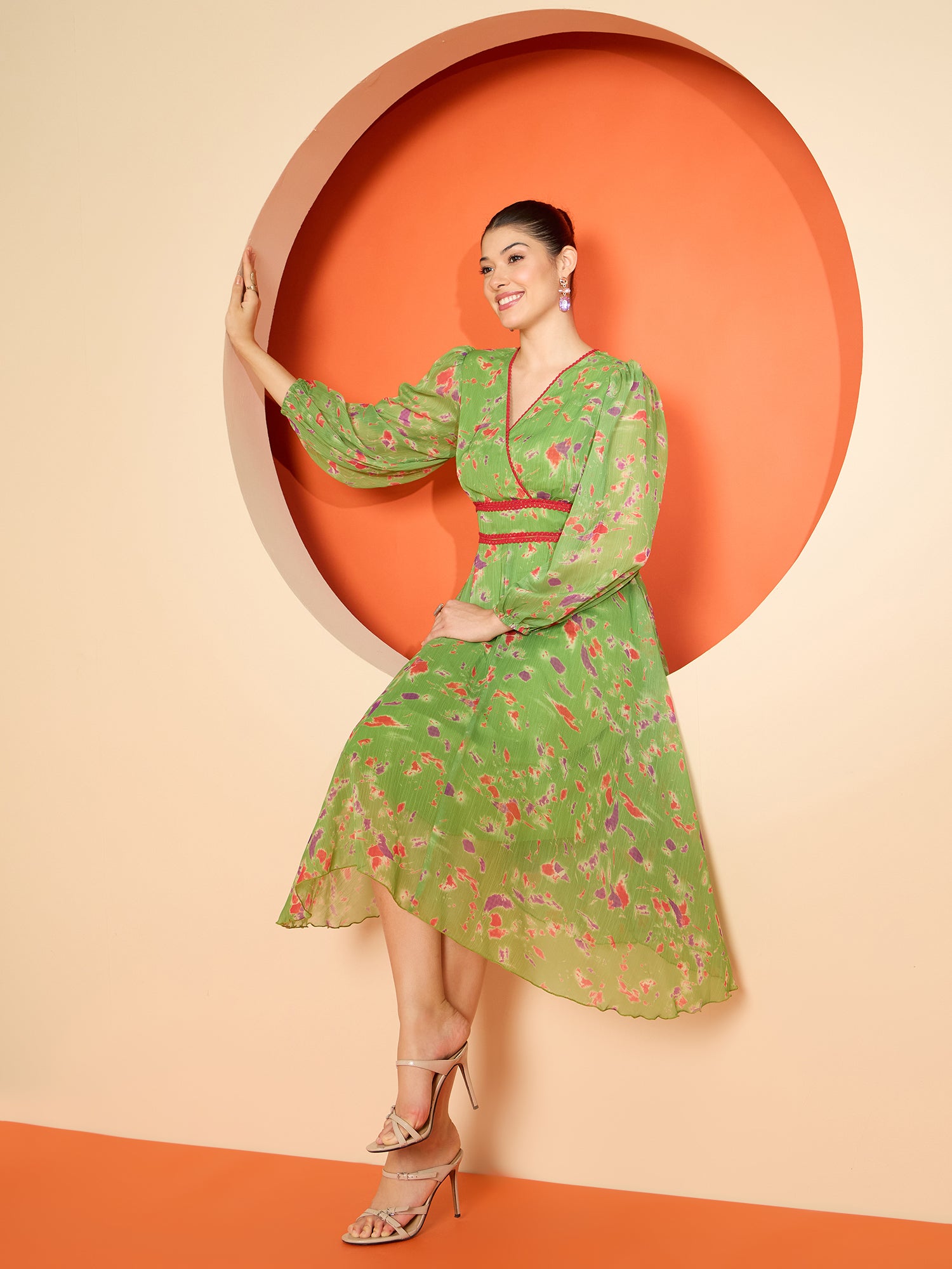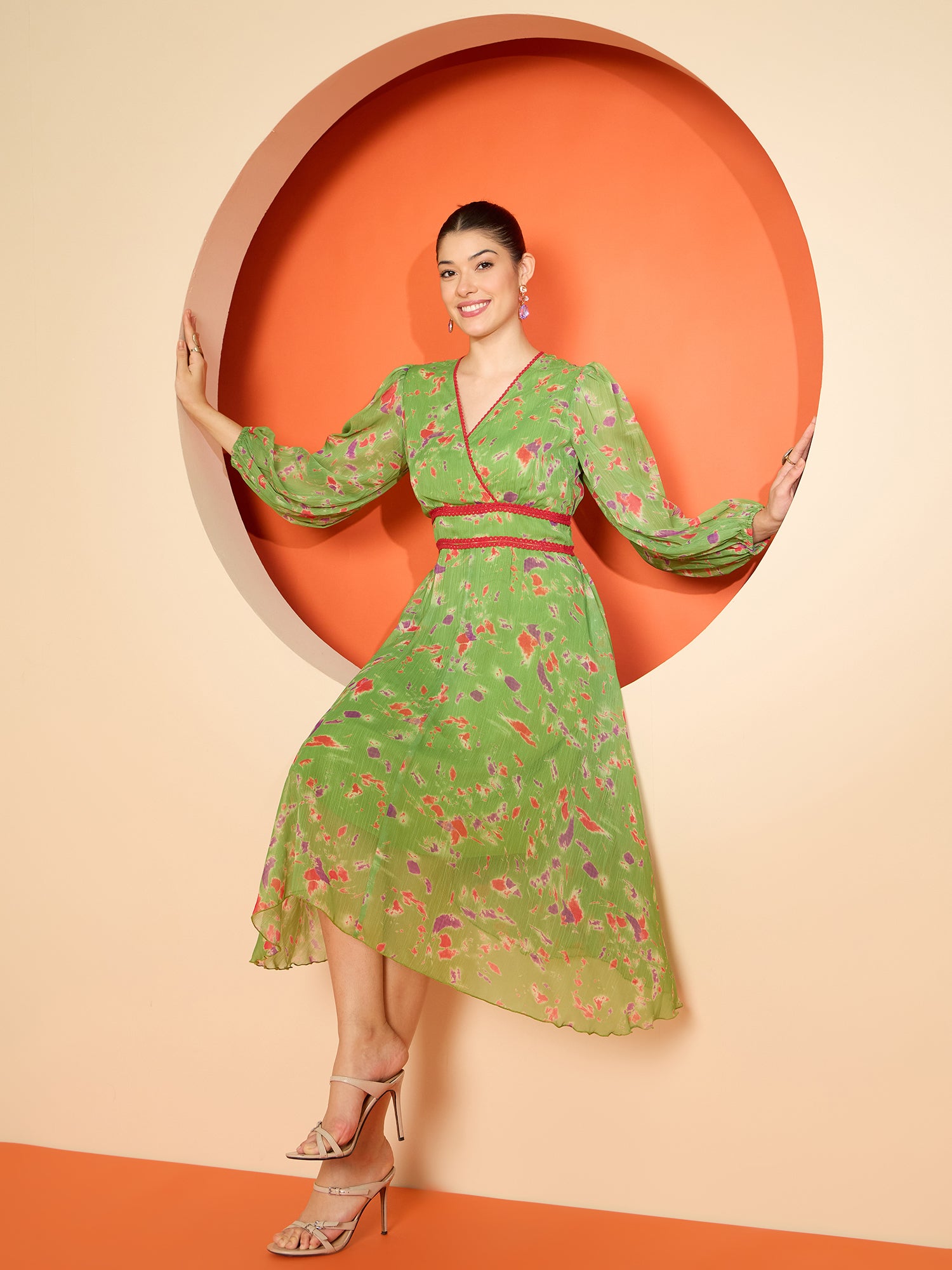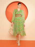 Antheaa Women Floral Printed Gathered or Pleated Chiffon Fit & Flare Midi Dress