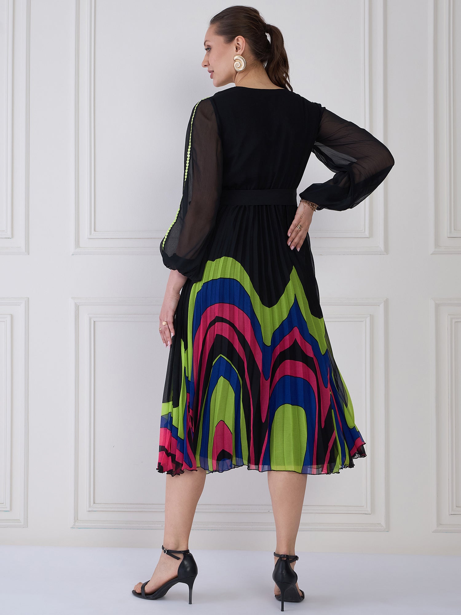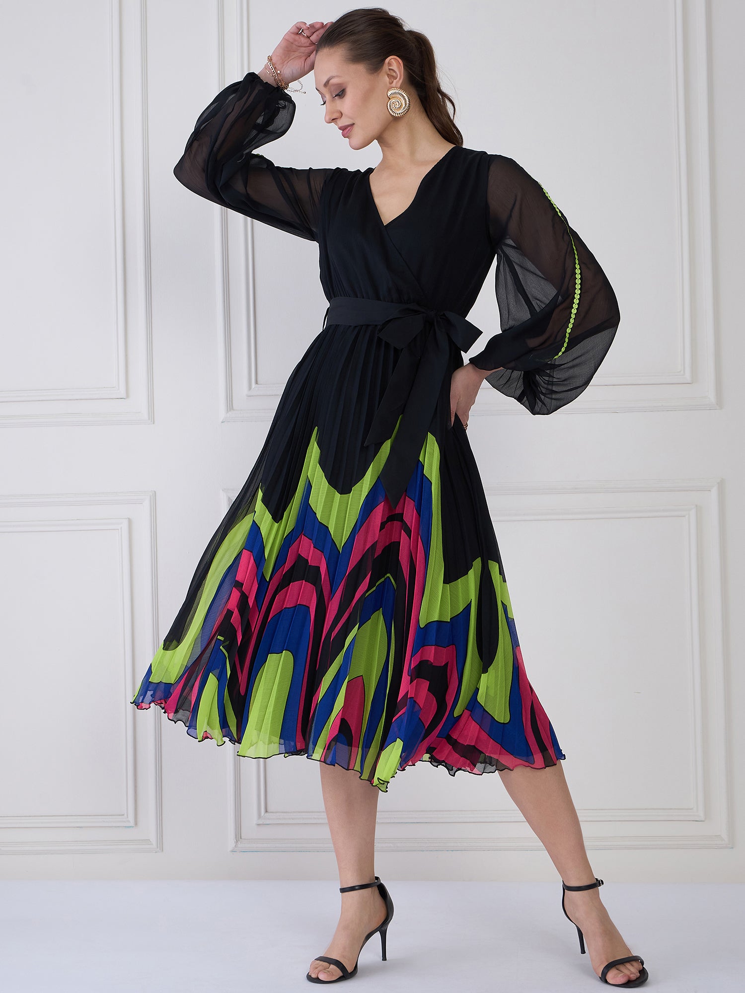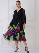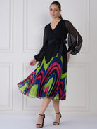 - Black geometric print wrap dress dress
