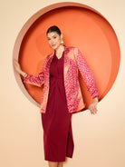 Antheaa Women V Neck Knotted A-Line Midi Dress With Printed Blazer