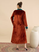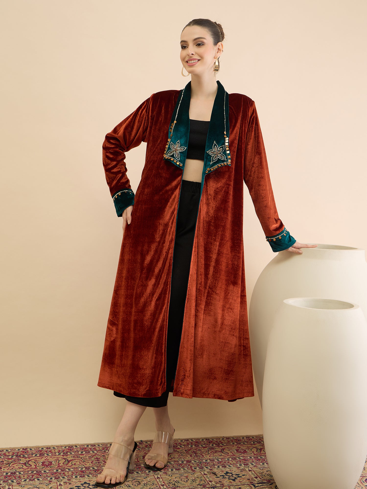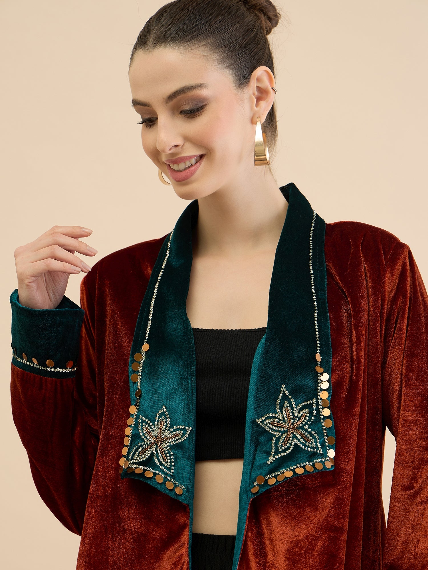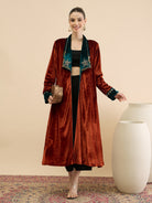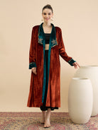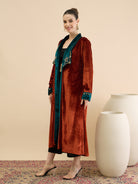 Antheaa Women Longline Open Front Velvet Jacket with Embellishment