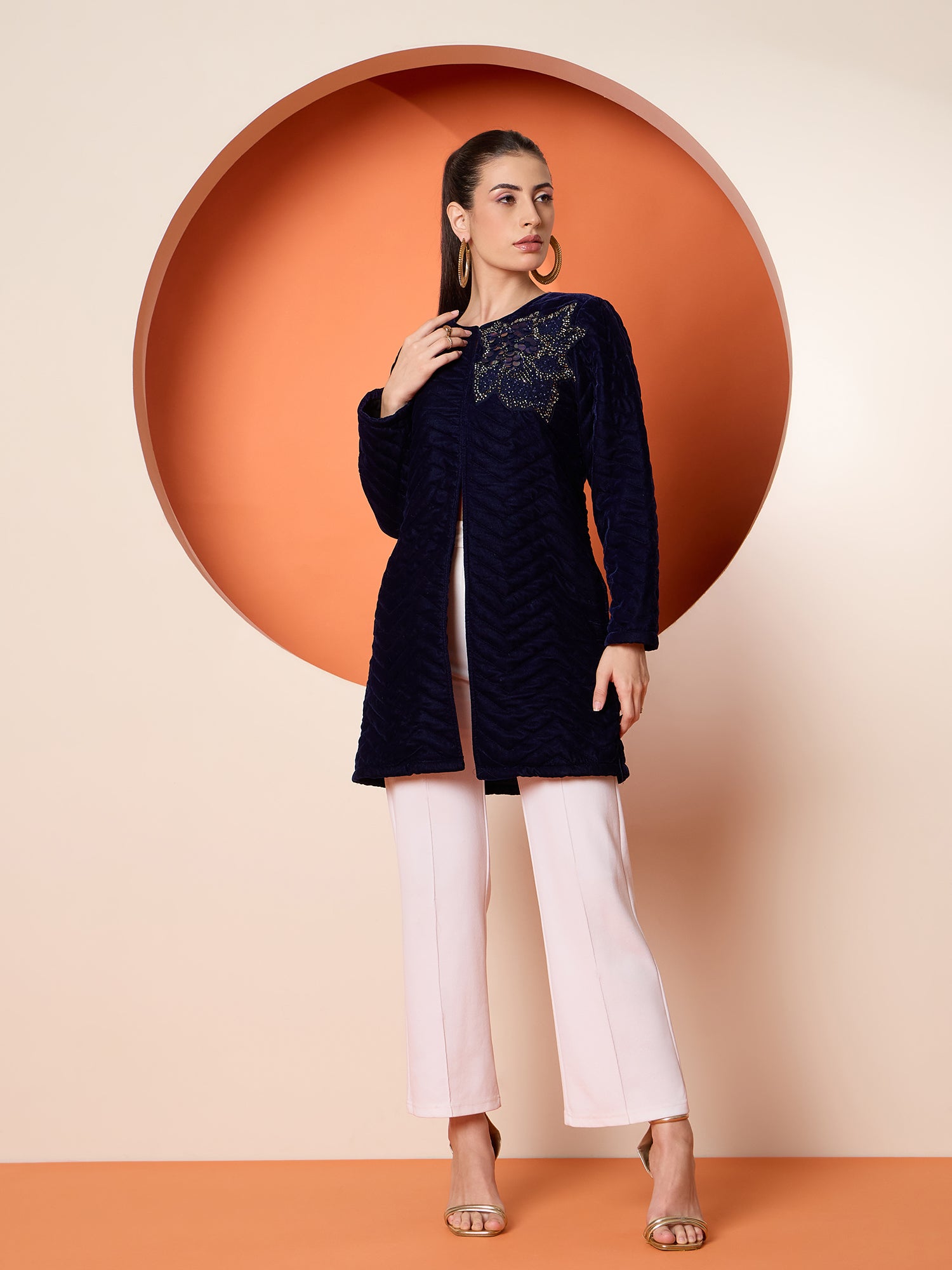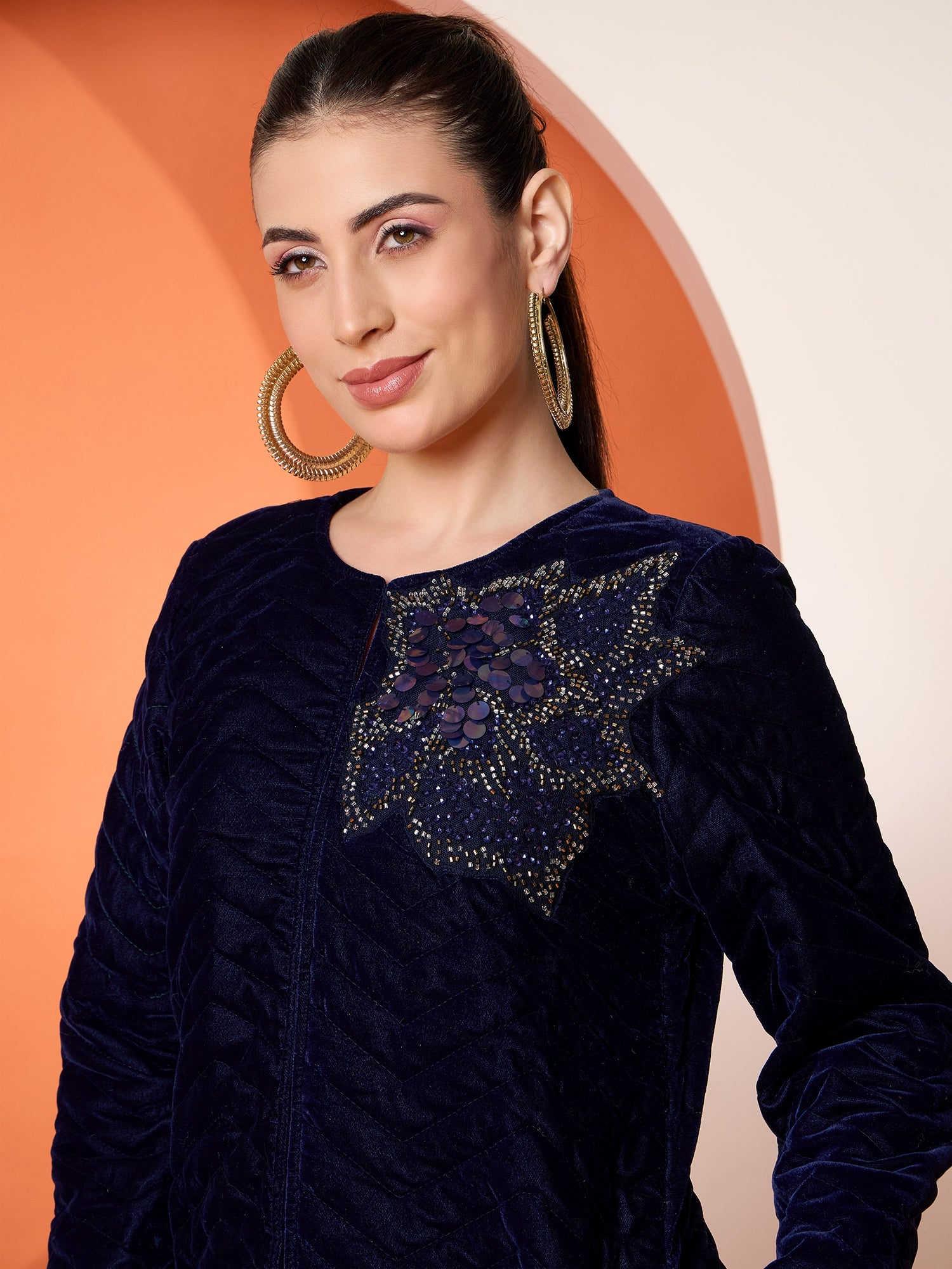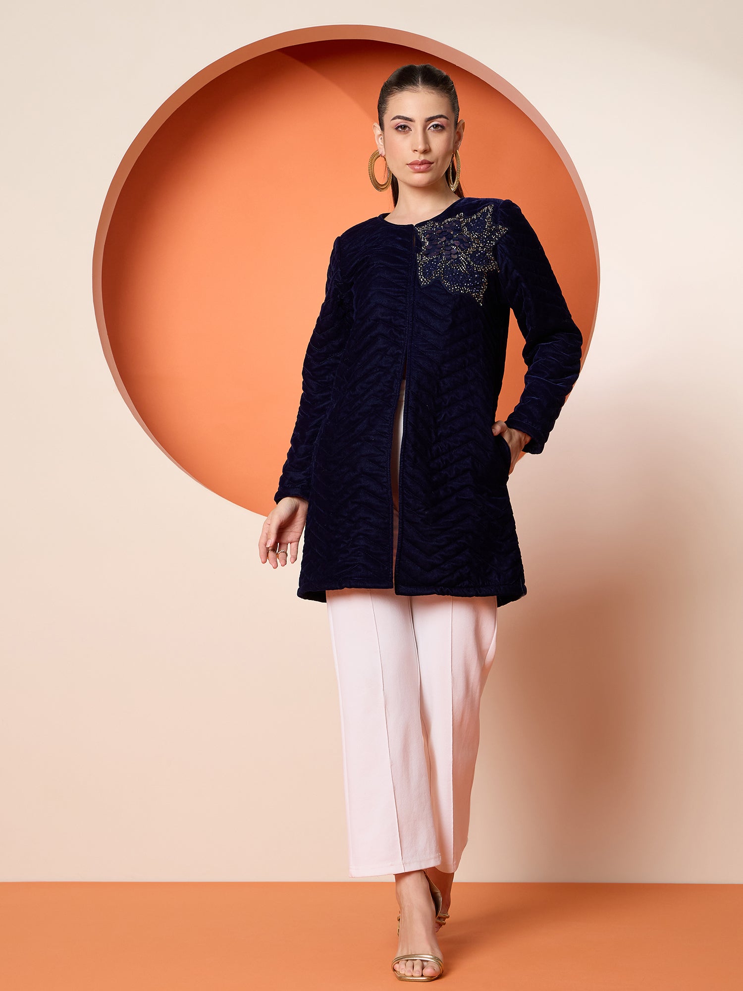 Antheaa Women Tailored Quilted Embroidered Velvet Jacket