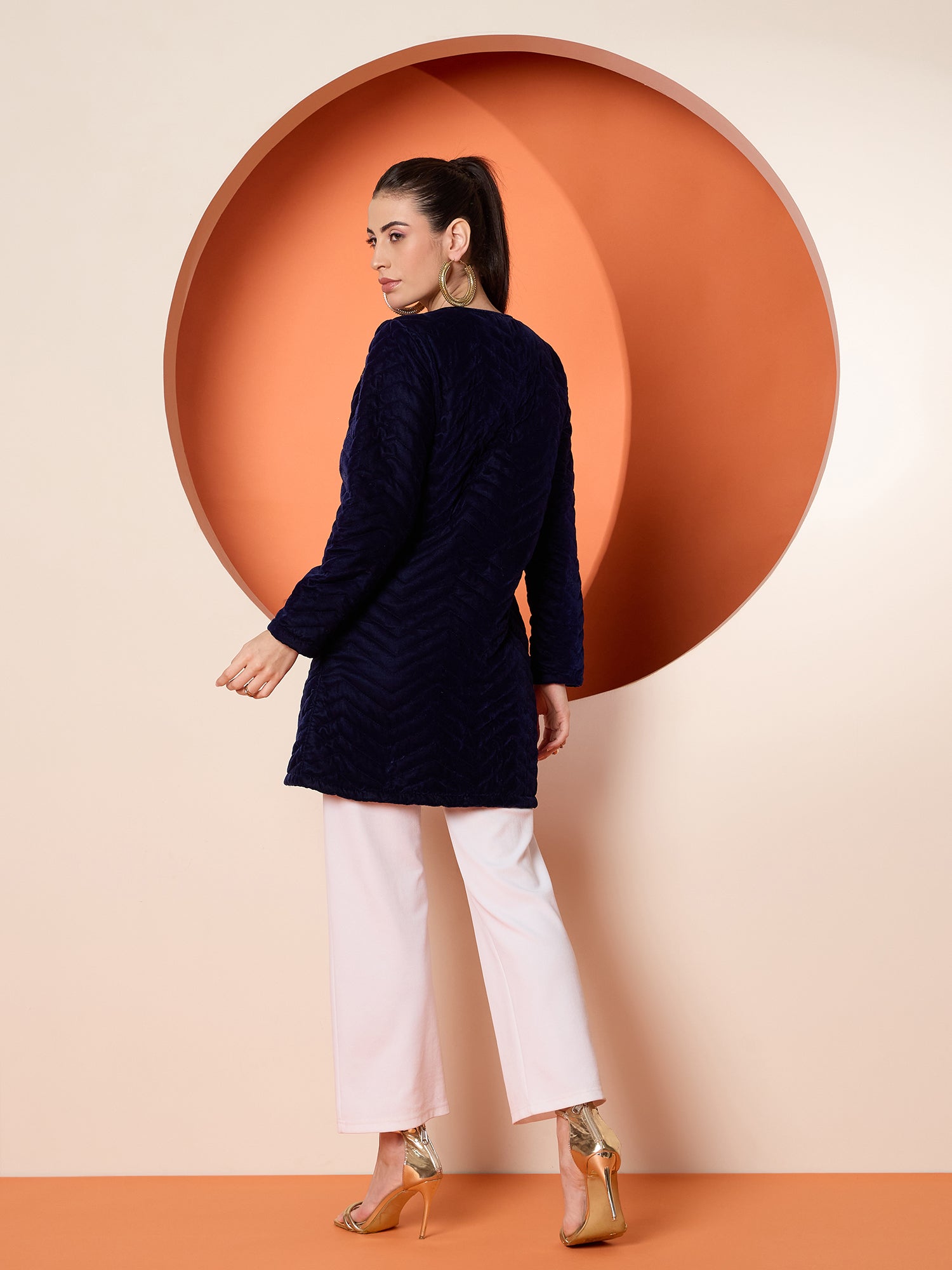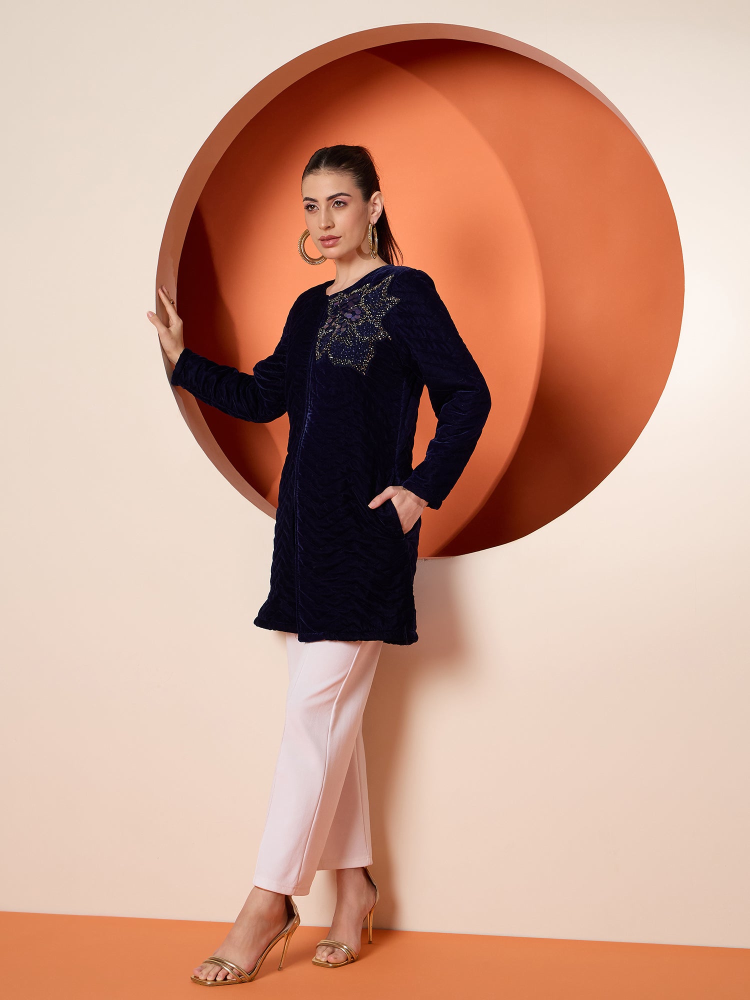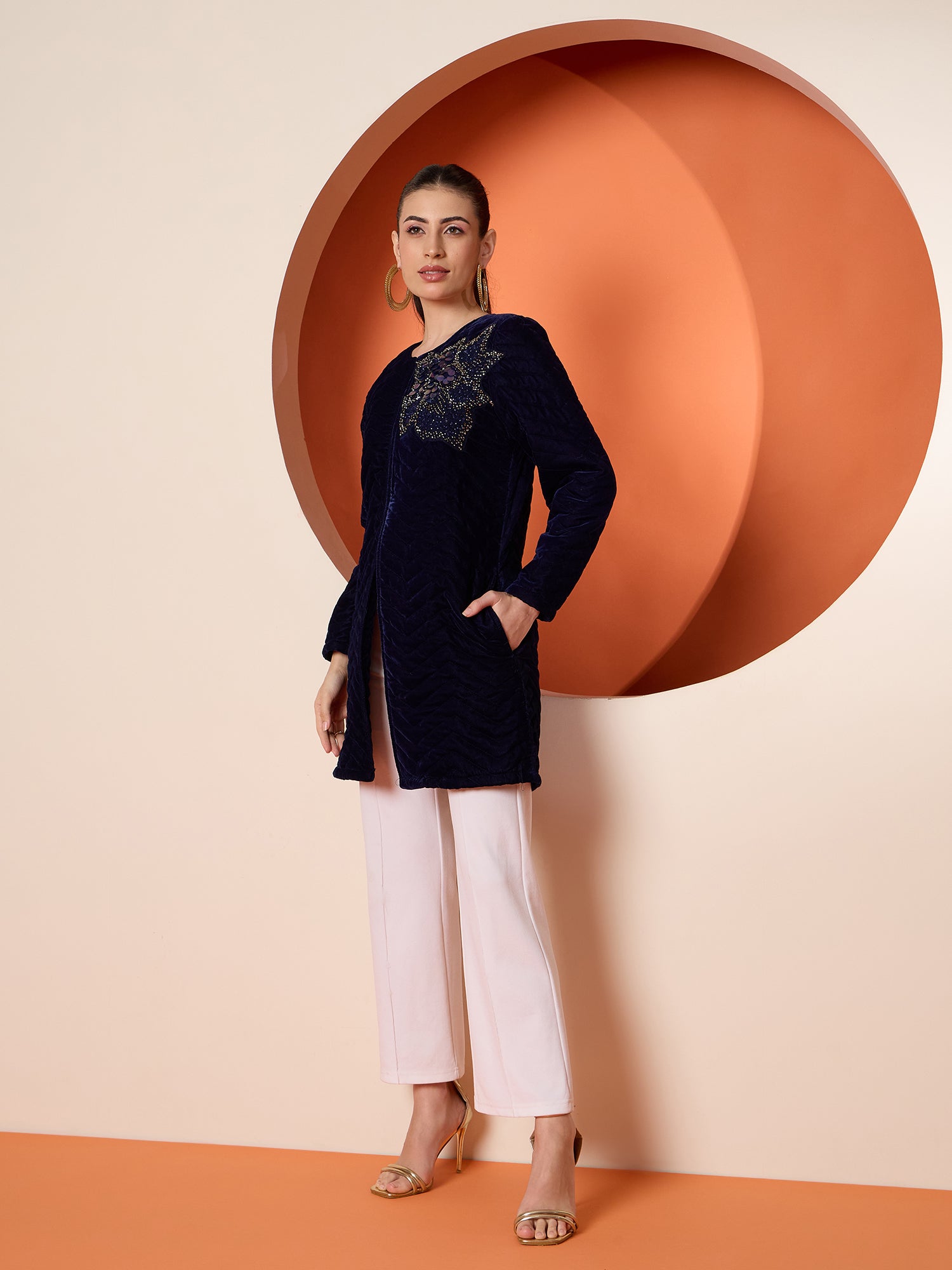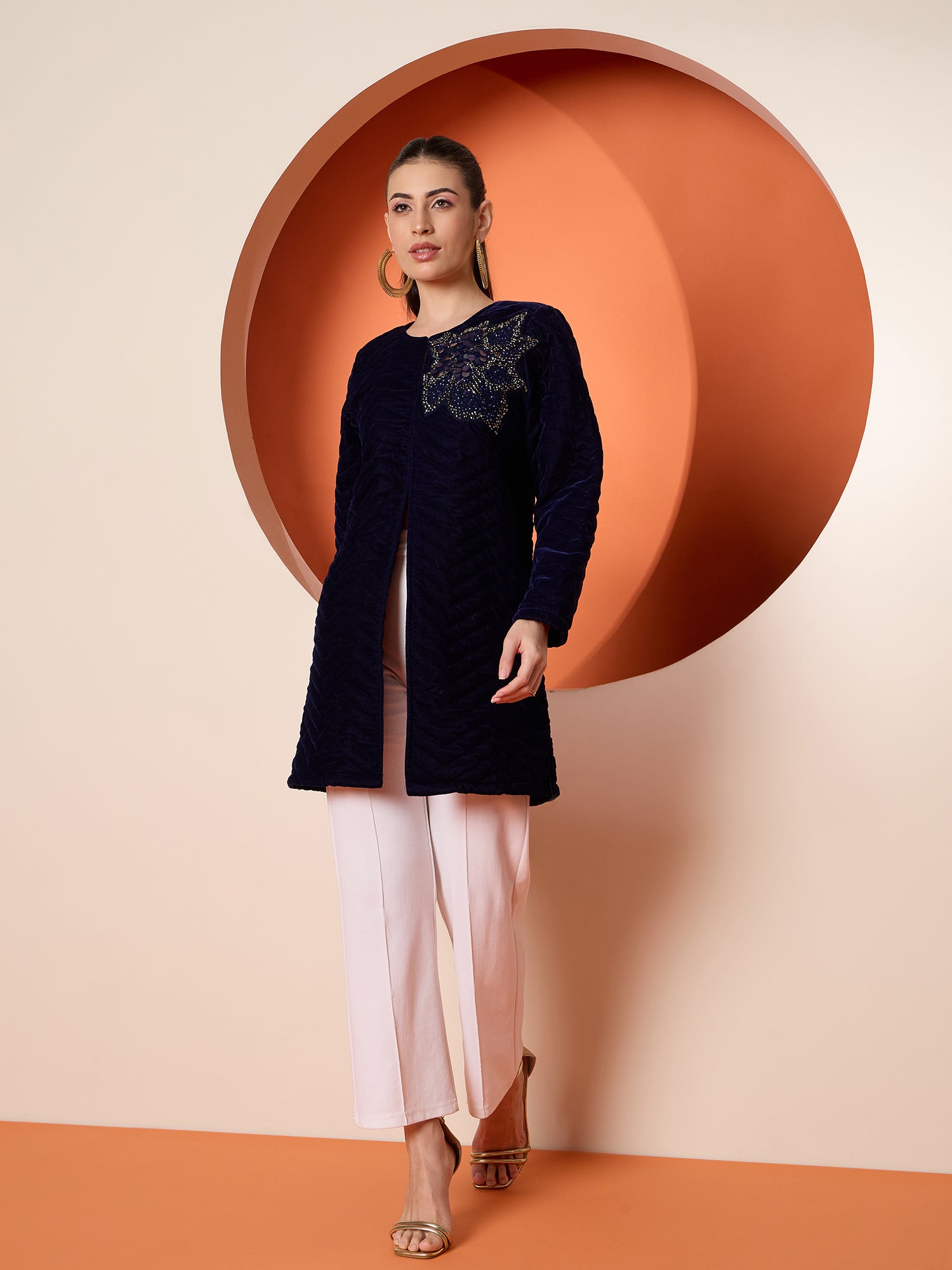 Antheaa Women Tailored Quilted Embroidered Velvet Jacket