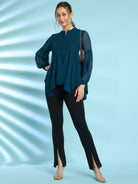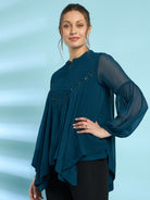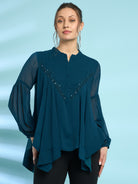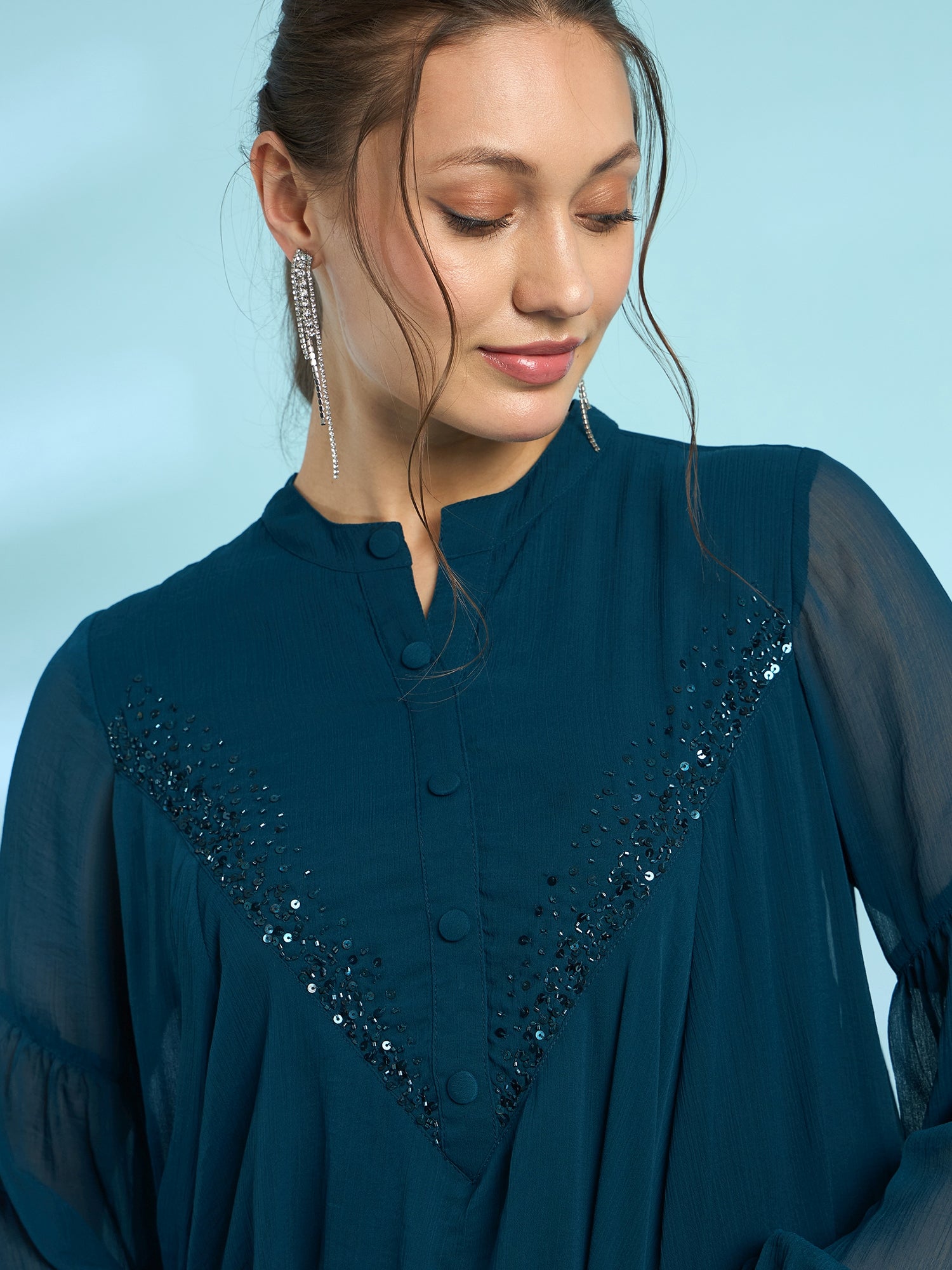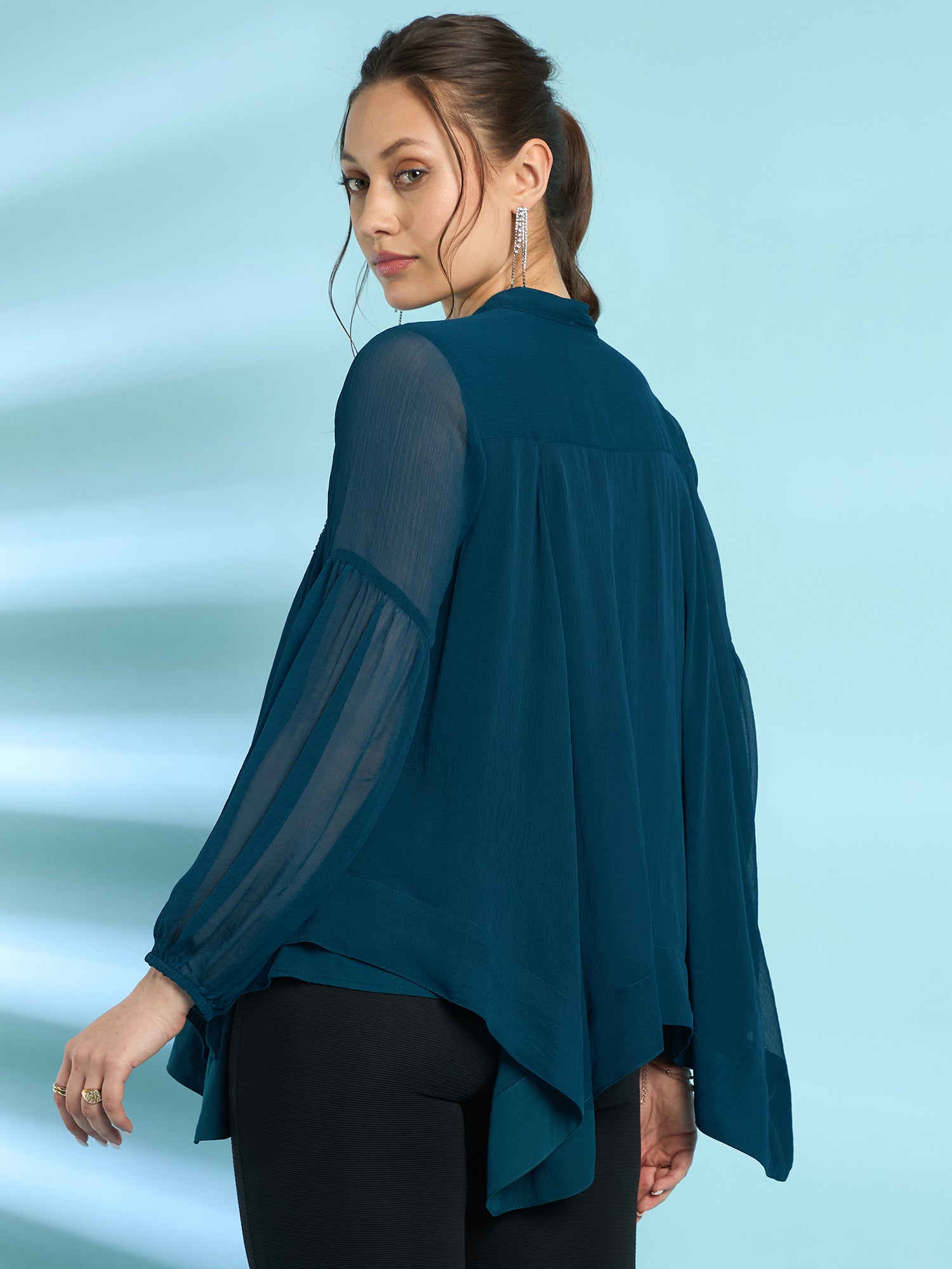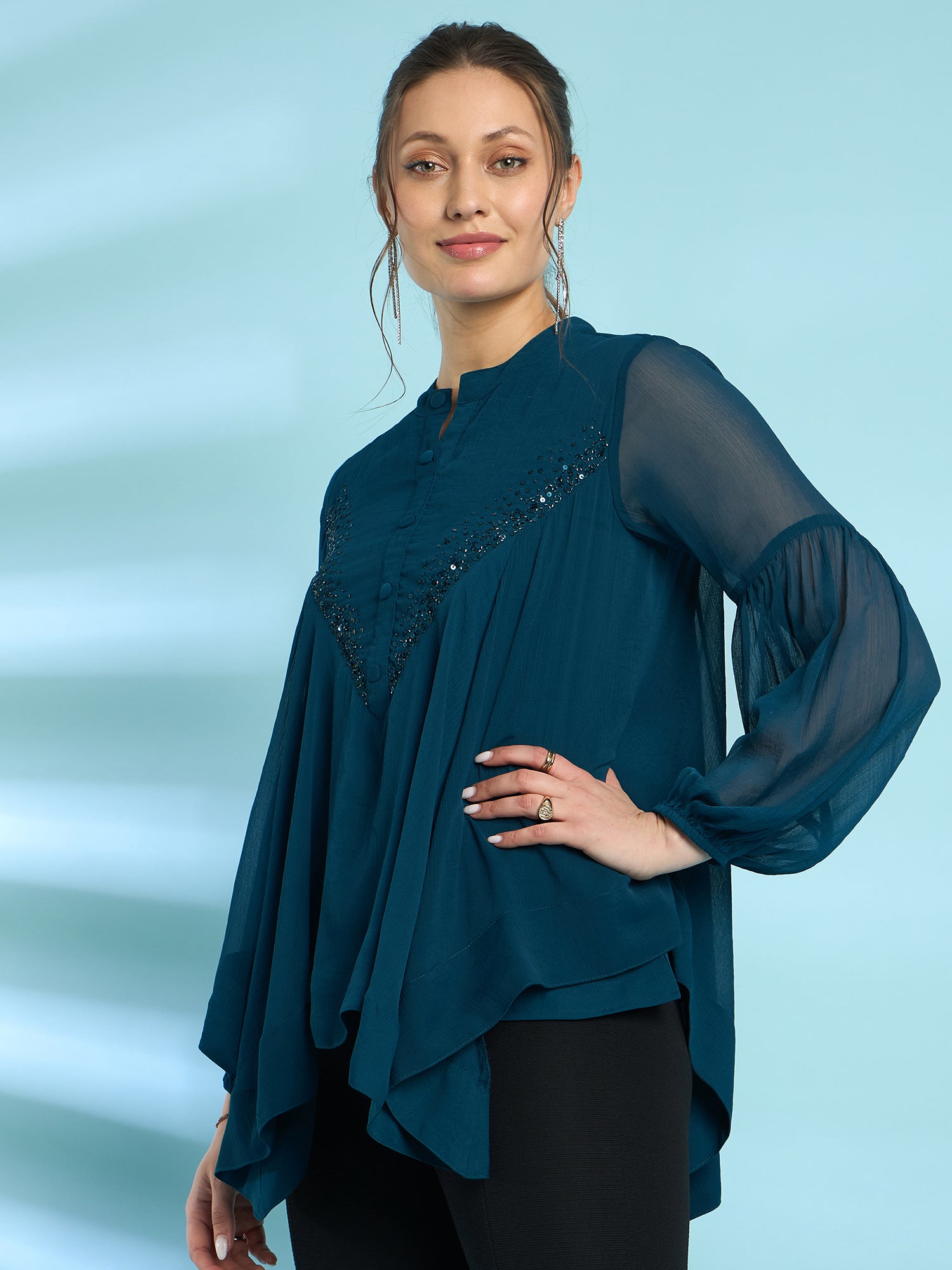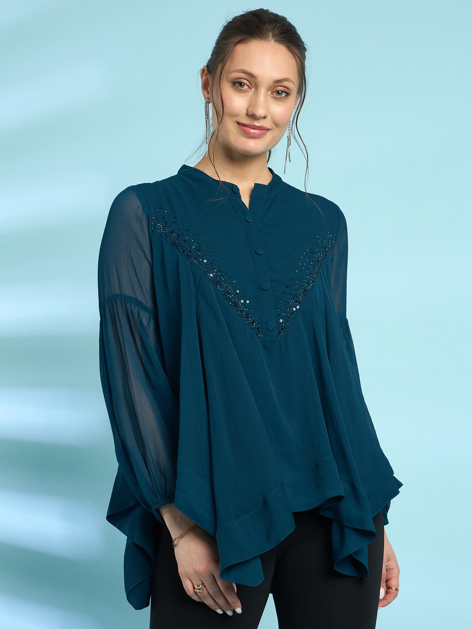 Antheaa Embellished Mandarin Collar Bell Sleeve Chiffon Top