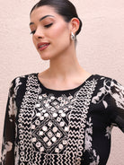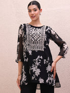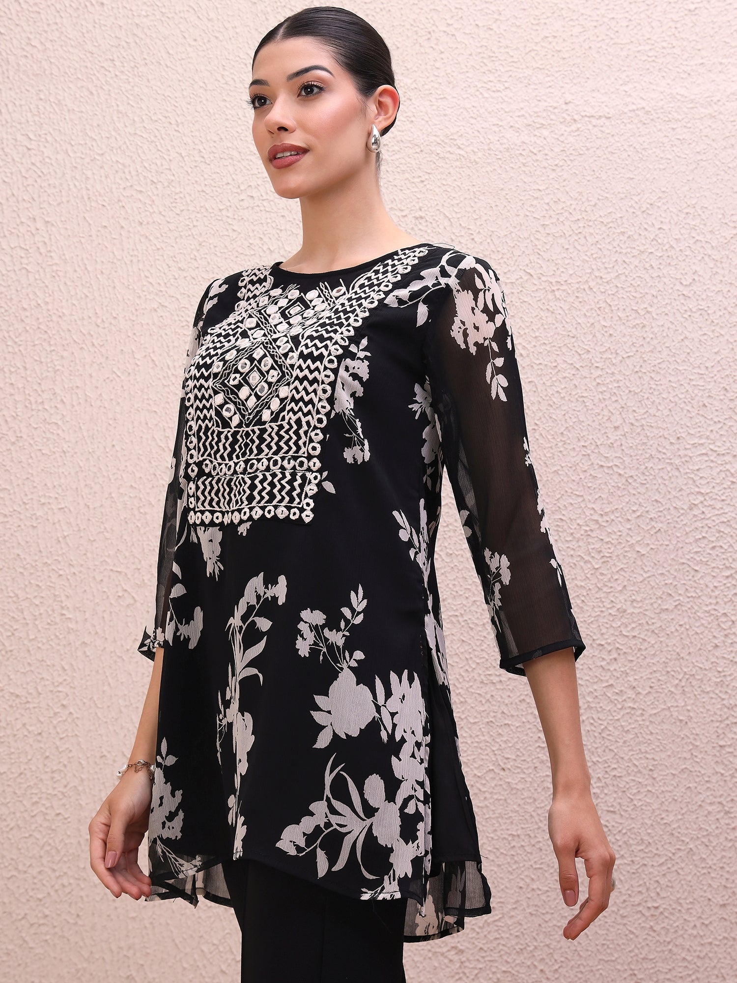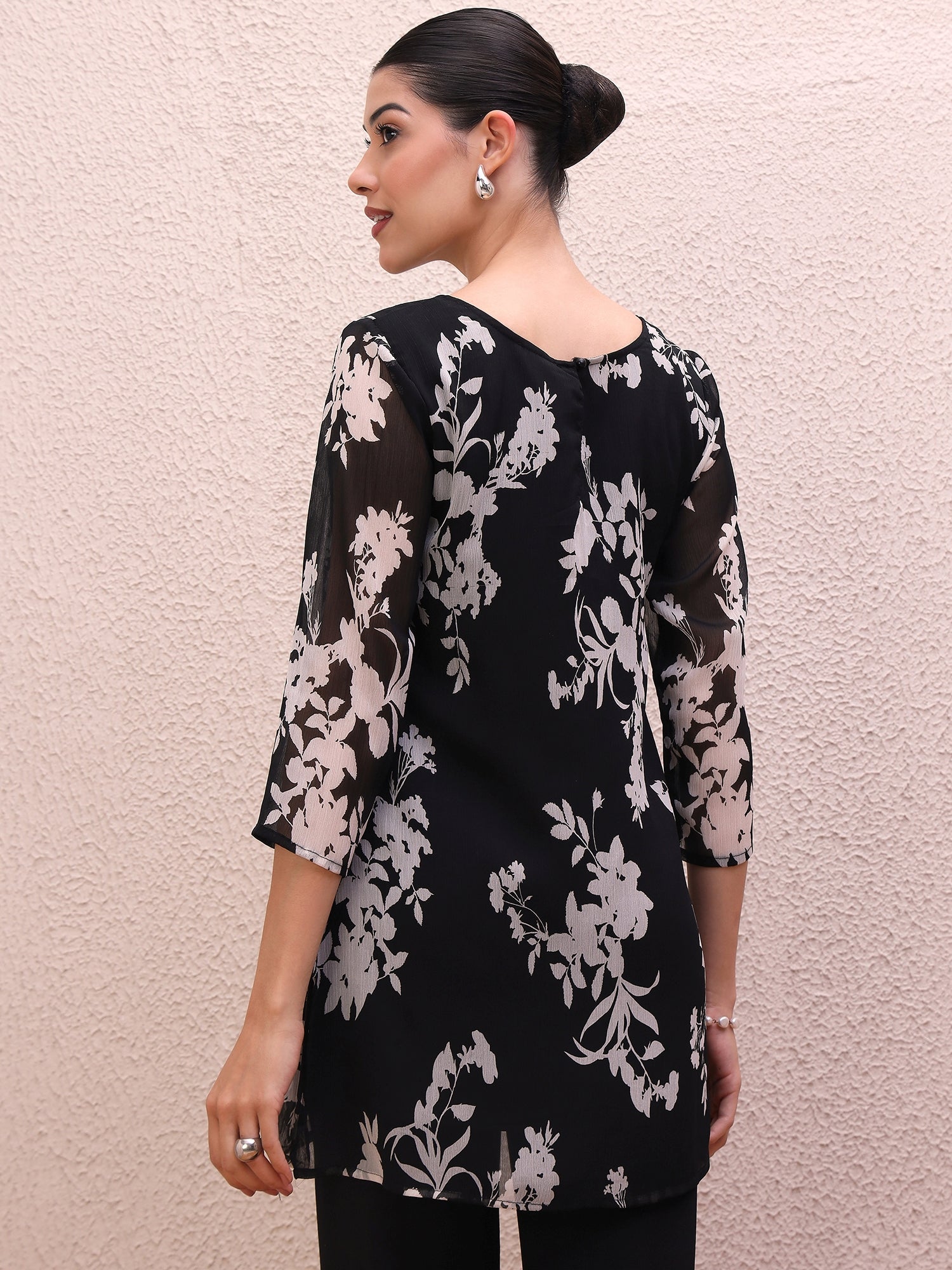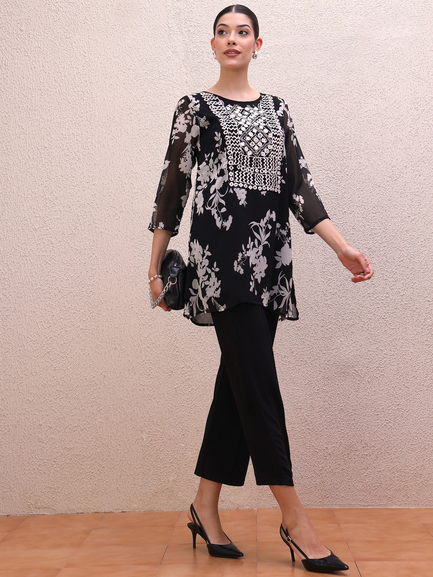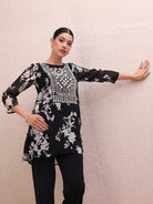 Black and white printed tunic ,has a round neck, three-quarter sleeves,