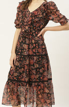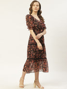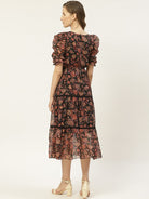 Antheaa Black & Rust Orange Floral Print Tiered Midi Fit & Flare Dress with Ruffles